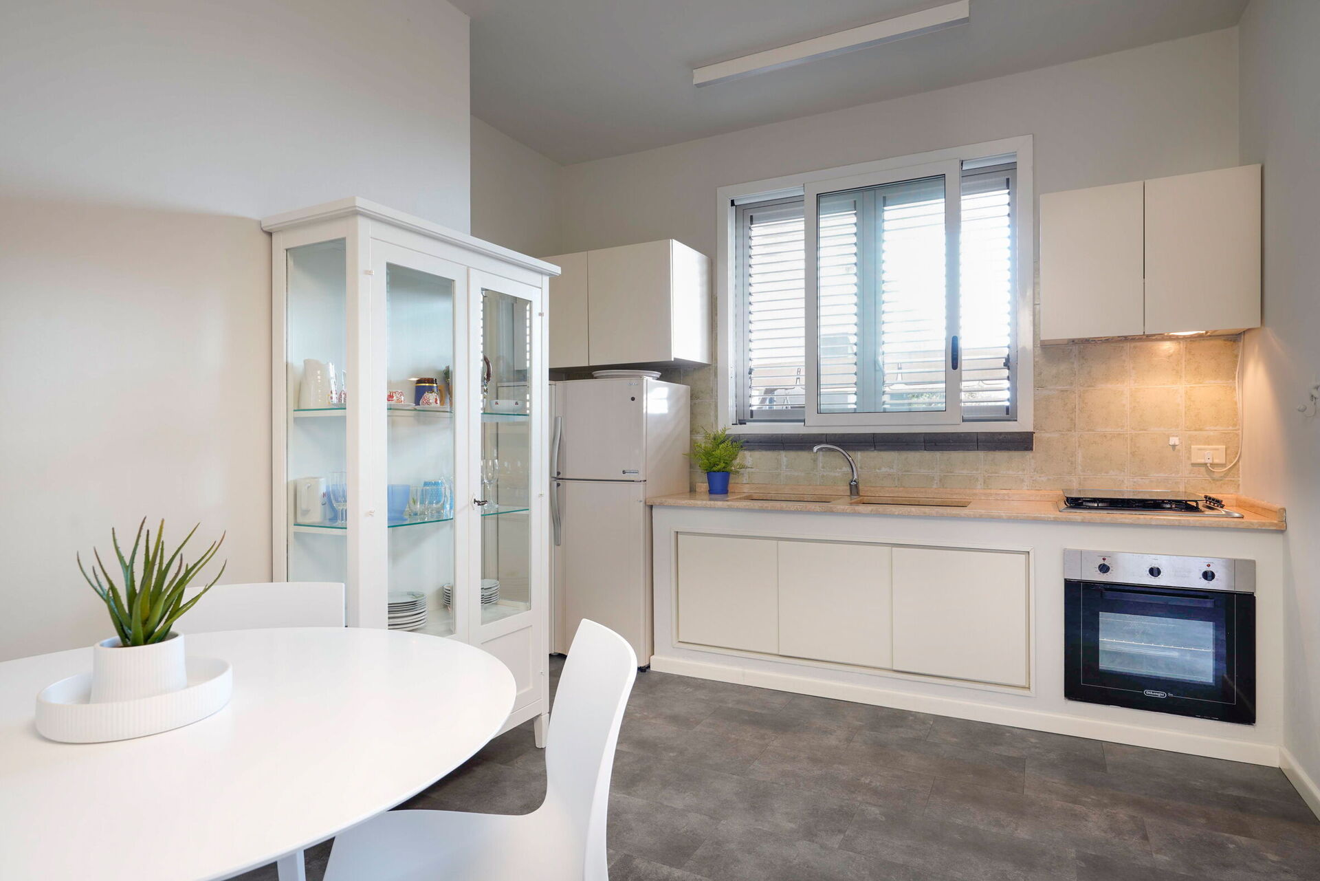 Rez-de-chaussée: séjour avec zone repas et coin cuisson (four, freezer), une chambre double, salle de bains avec douche.