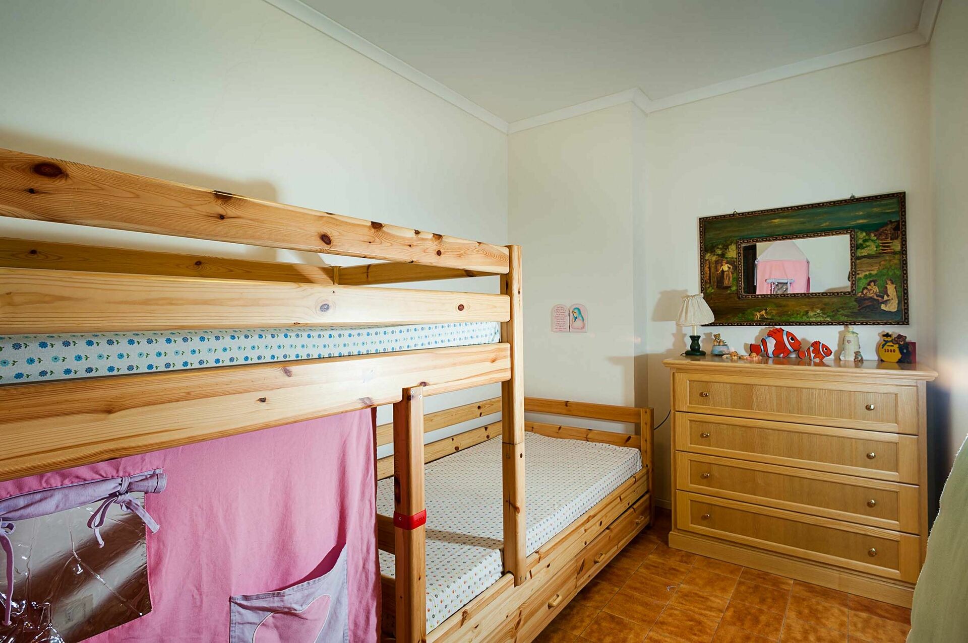 Rez-de-chaussée: séjour avec zone repas et coin cuisson (four, freezer), une chambre double, 1 chambre avec lits superposés, salle de bains avec douche.