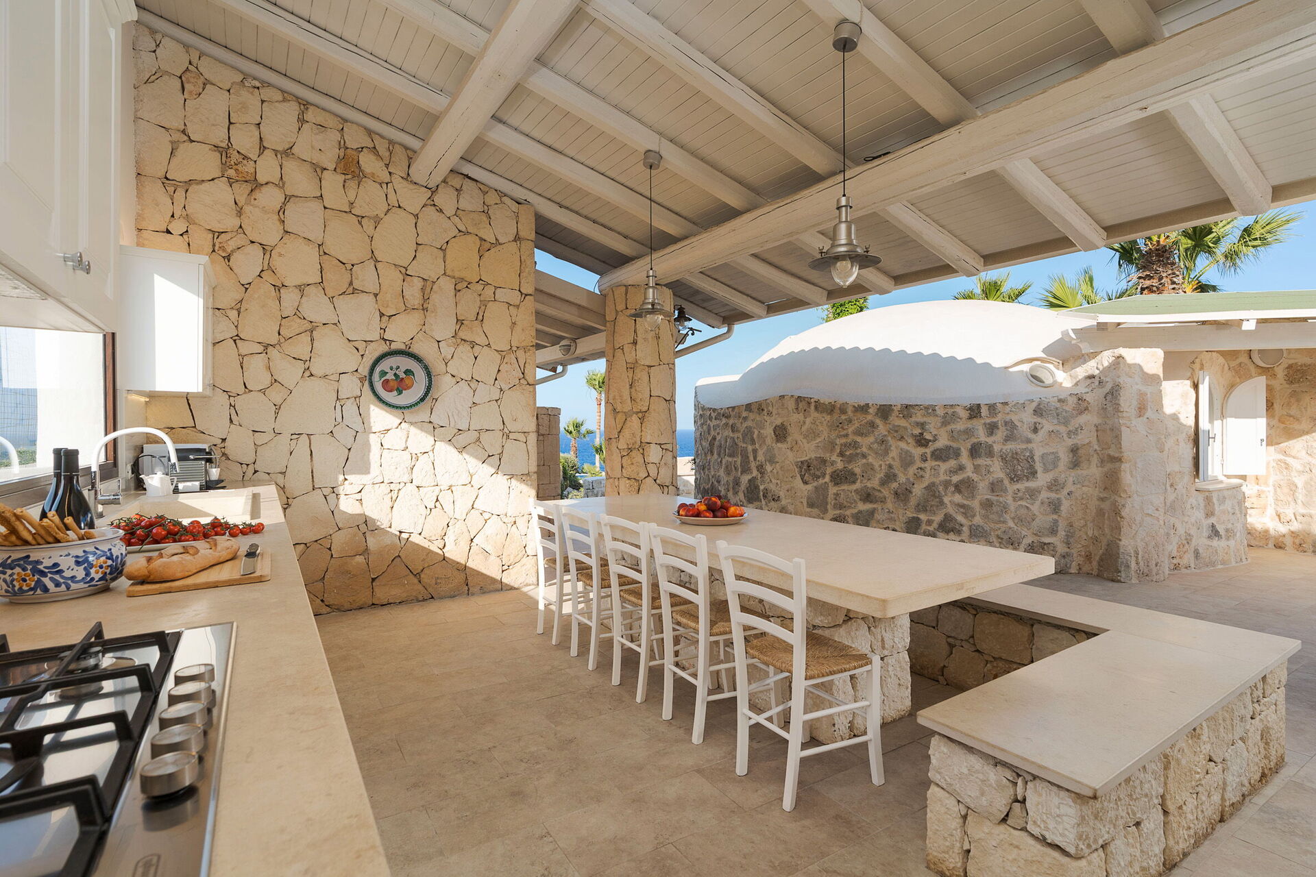 Situé à quelques pas de la mer et des rochers, cet établissement exclusif est entouré d'un jardin bien entretenu avec pelouse, de terrasses spacieuses et d'une véranda équipée avec cuisine extérieure et coin repas (kitchenette, four, réfrigérateur et barbecue).