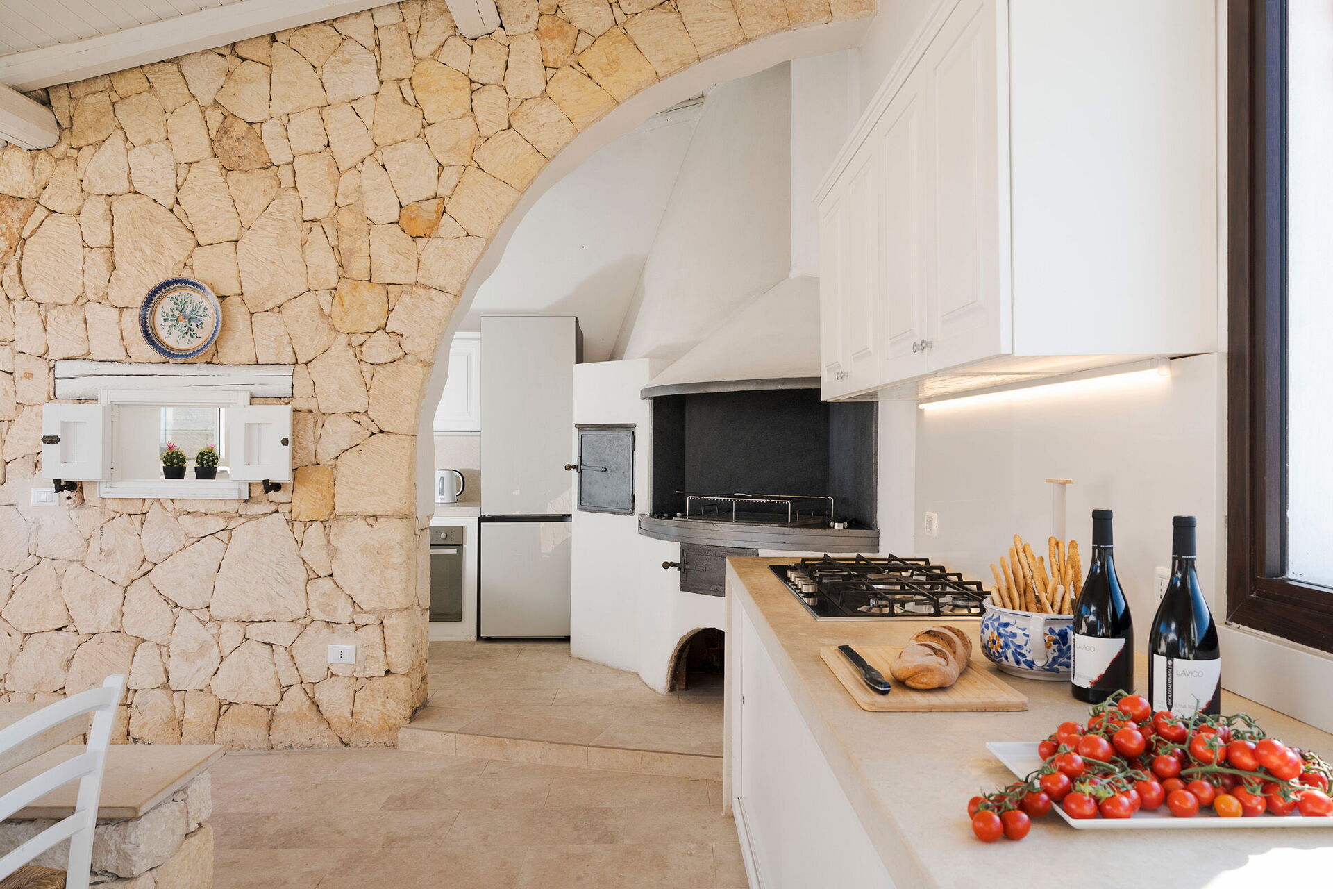 Lovely outdoor kitchen, fully equipped with BBQ and wood-burning oven, also a regular oven and dishwasher.