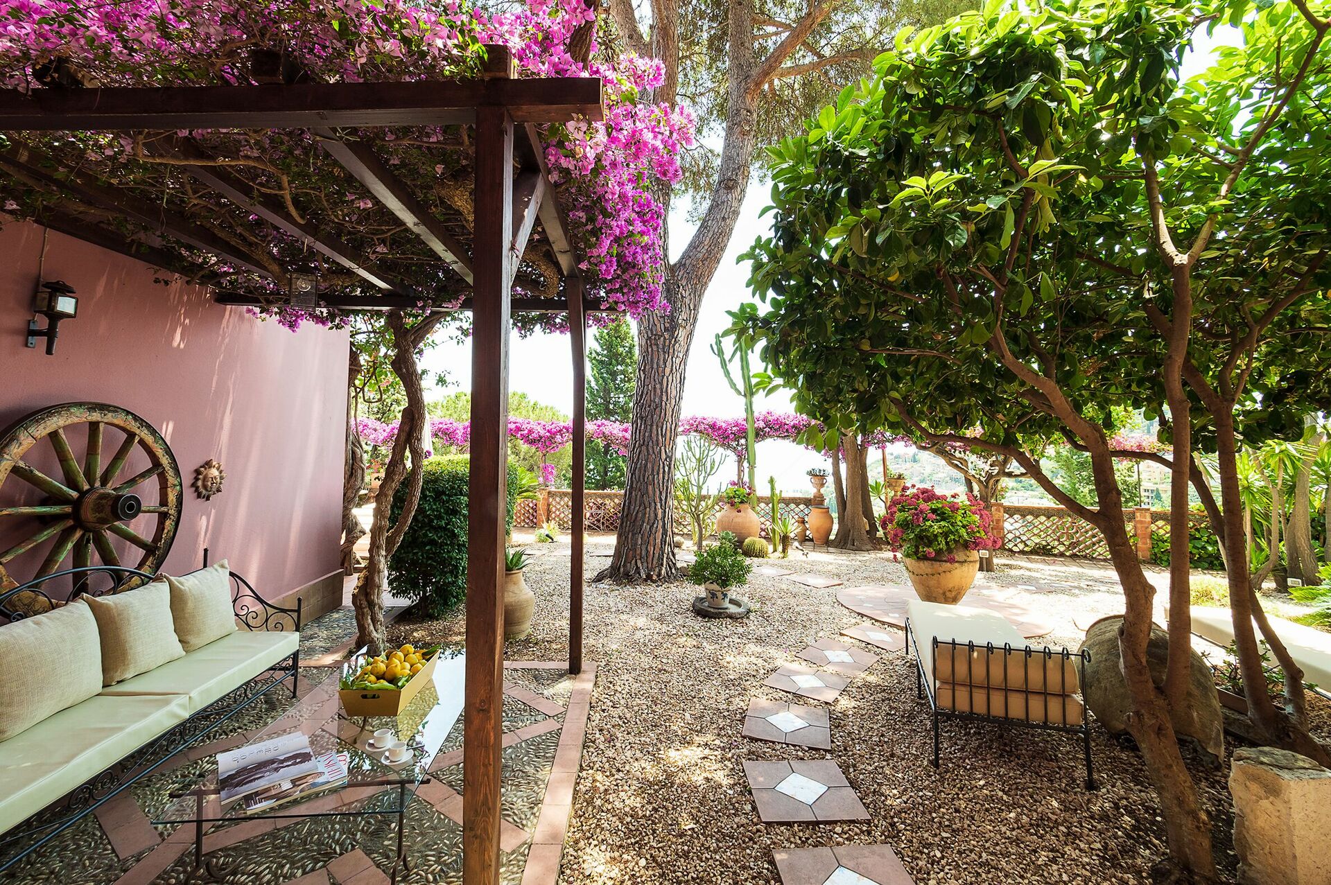 Dominant le jardin et la piscine, "Villa La Boheme" dispose de plusieurs espaces équipés pour se détendre en plein air. Meublée avec élégance et soin, la maison est décorée dans un magnifique style sicilien, des céramiques anciennes et des meubles antiquité.