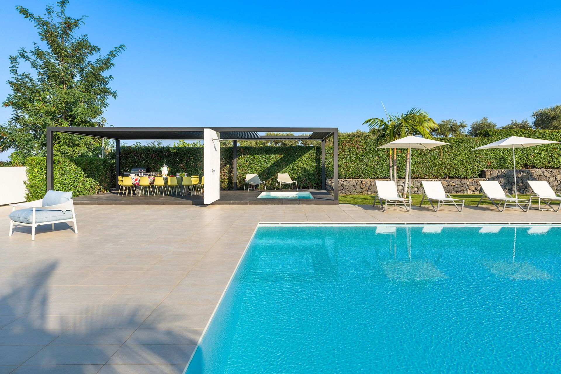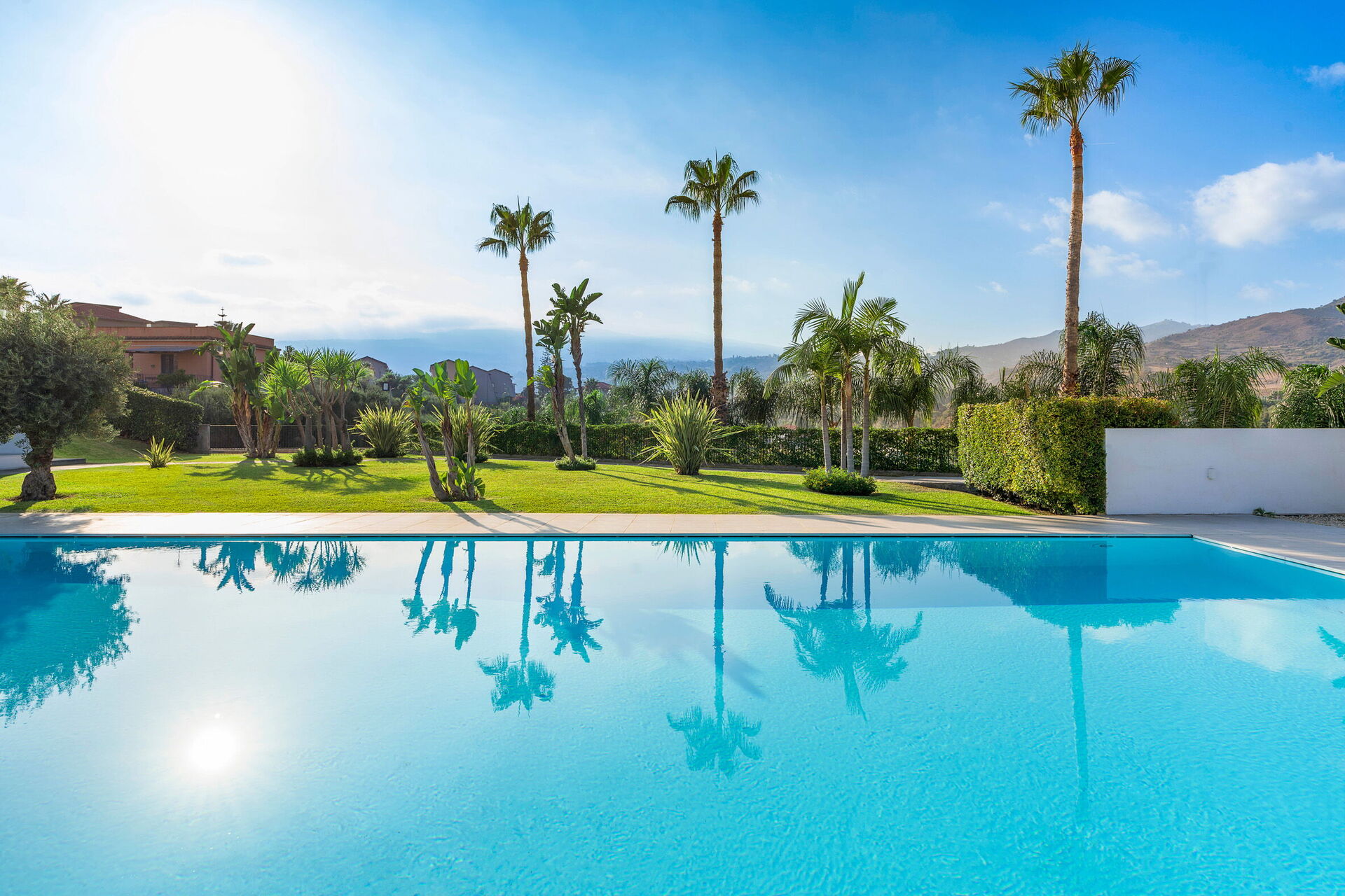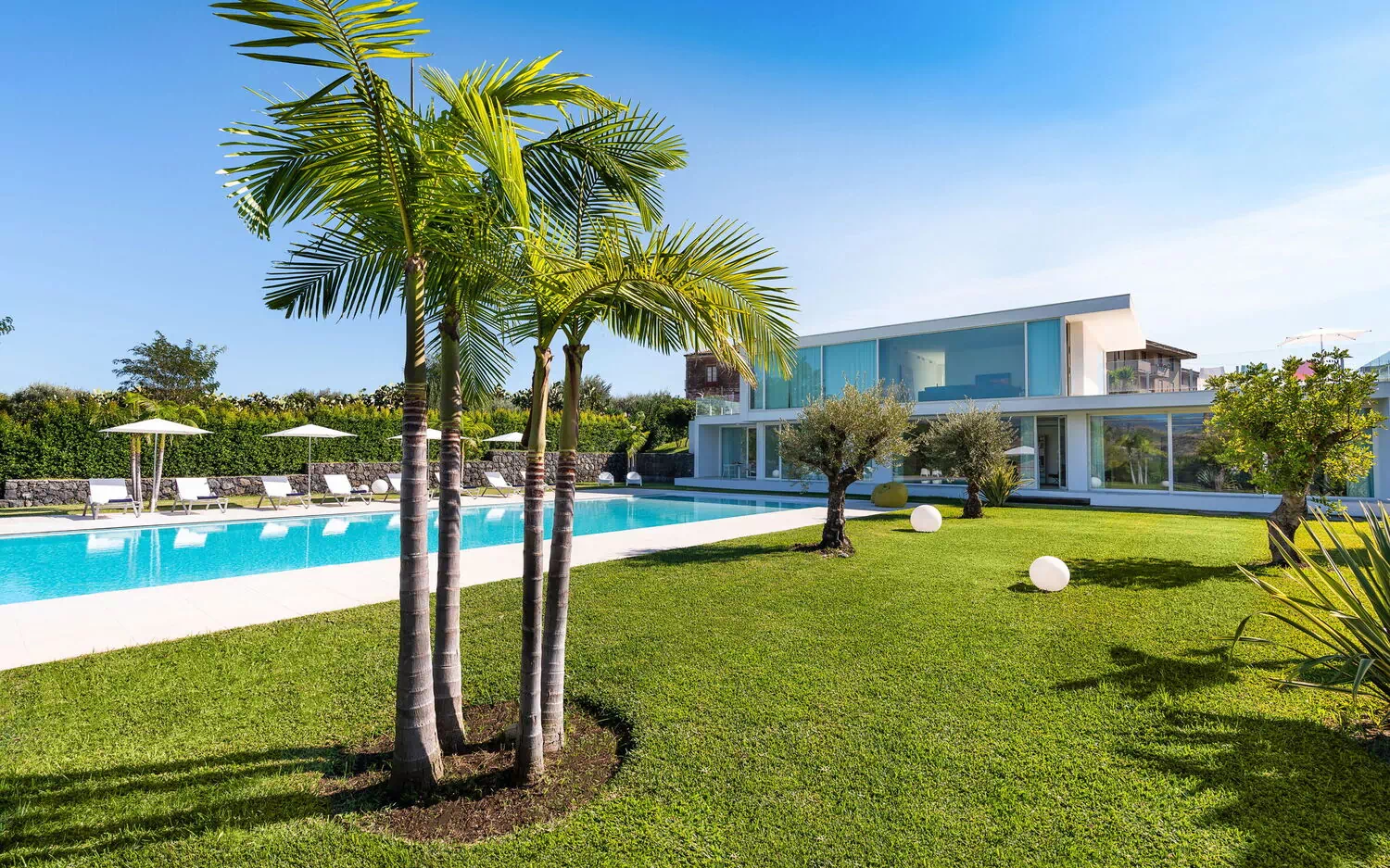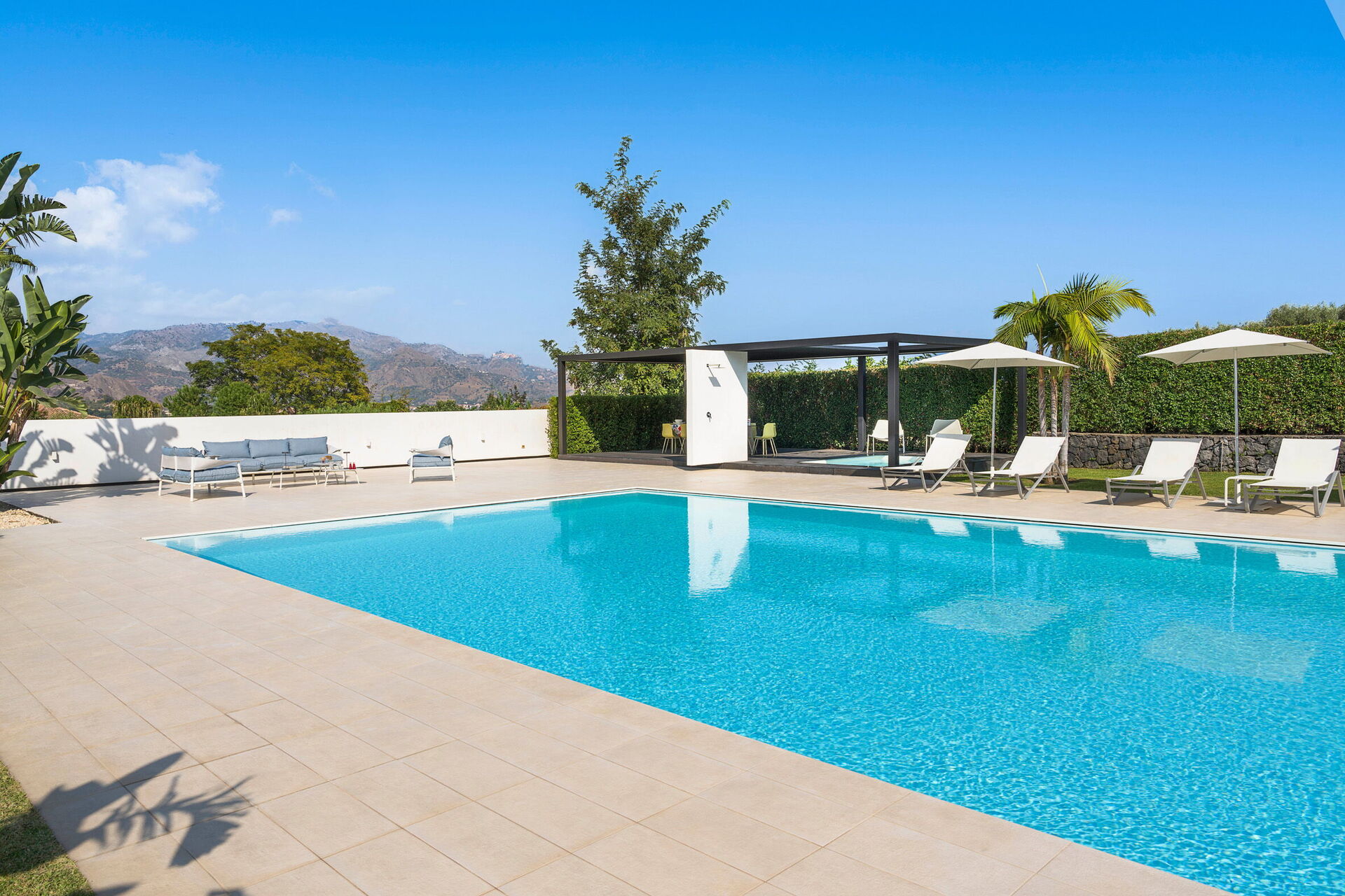 Villa Greta est une villa de luxe avec piscine privée en location vacances en Sicile, aux alentours de Taormina. Idéale pour des vacances confortables et reposantes en famille ou entre amis, la villa est entourée d'un splendide jardin avec pelouse à l'anglaise, de grandes terrasses et une grande piscine privée.
