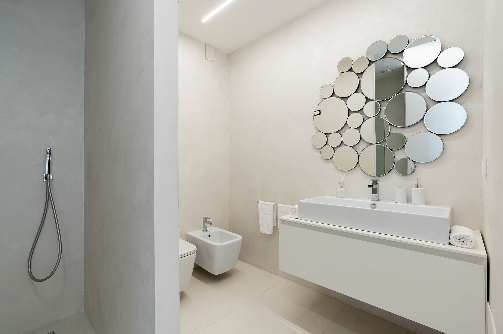 Rez-de-chaussée : grande zone living avec petit salon, salle à manger et cuisine (four, freezer, lave-vaisselle, cafetières), salle de bains avec douche, buanderie, une chambre double avec salle de bains privée avec douche et baignoire (hydromassage), 2 chambres doubles avec salle de bains privée avec douche, espace bien-être (sauna).