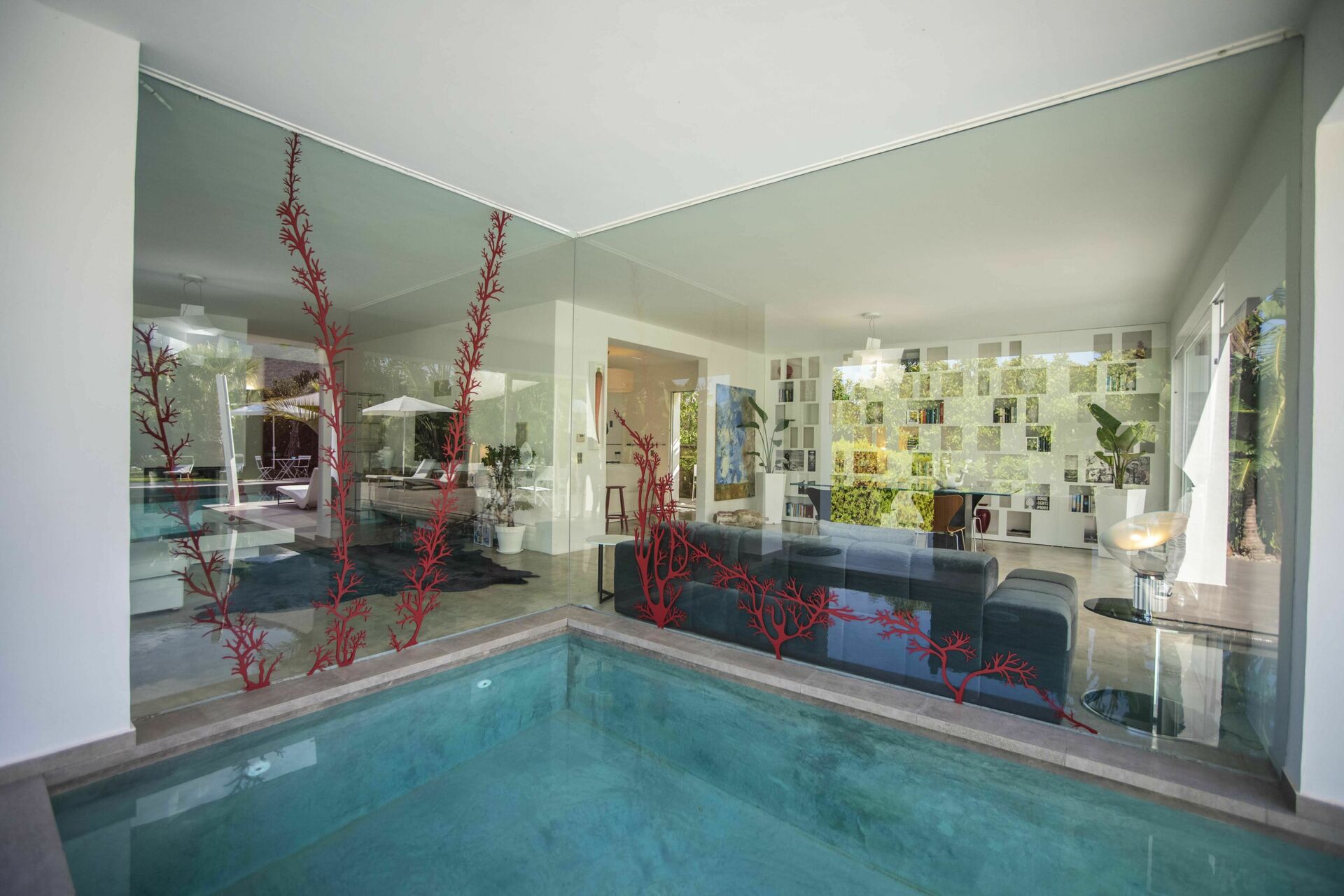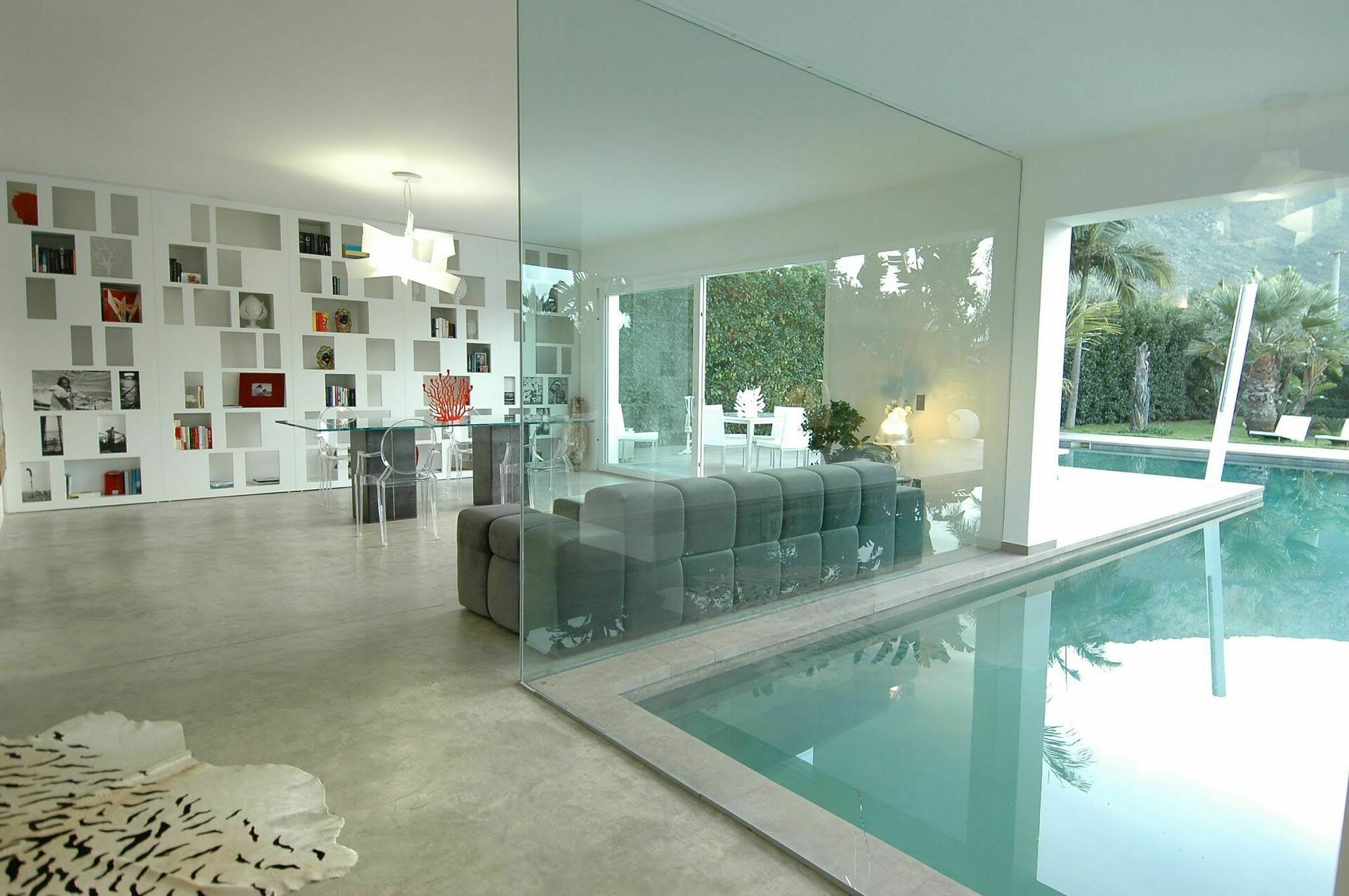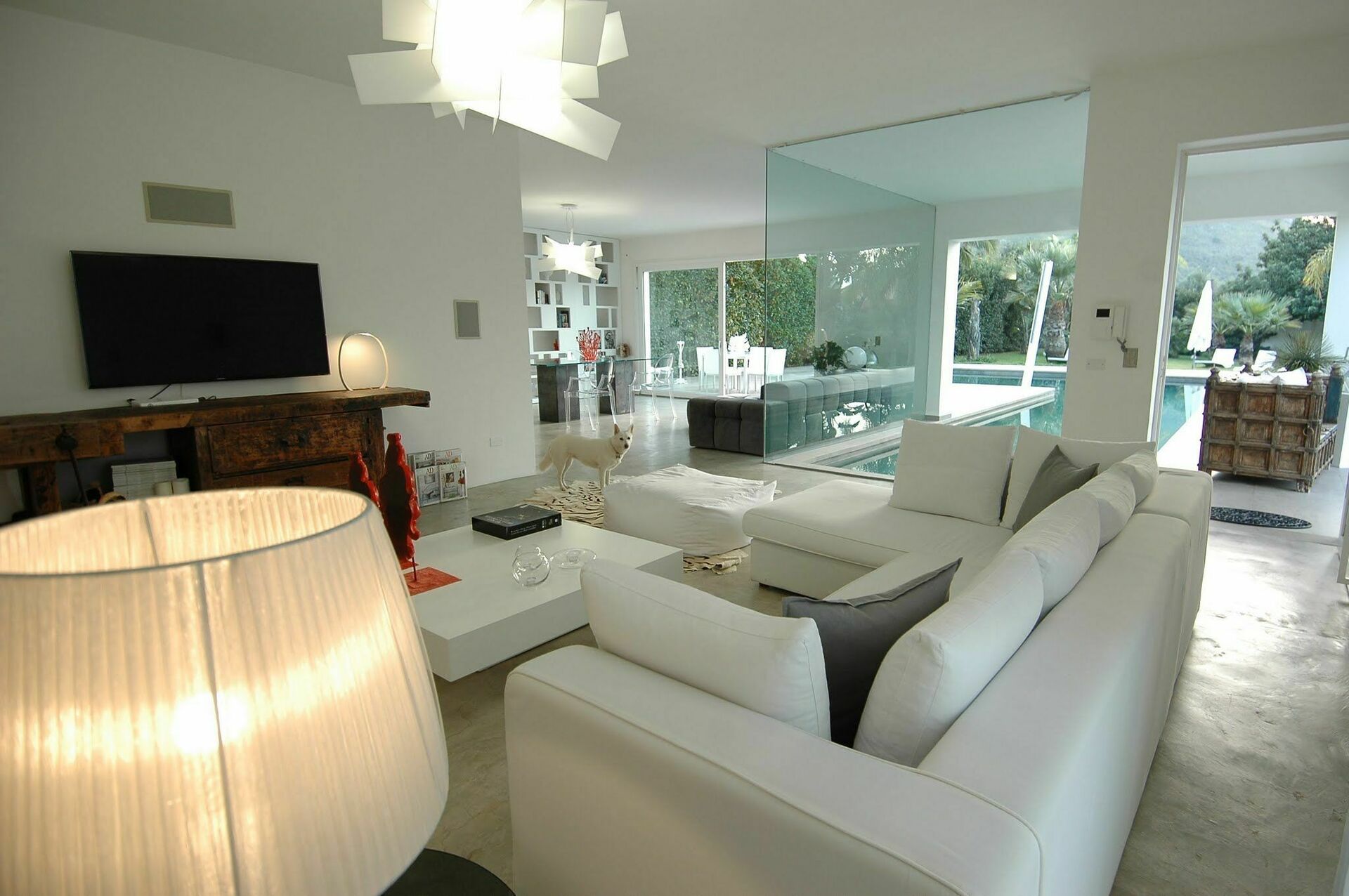 Grande partie jour composée de séjour, zone et cuisine. Les grandes baies vitrées permettent d’admirer la piscine qui se prolonge dans le séjour.