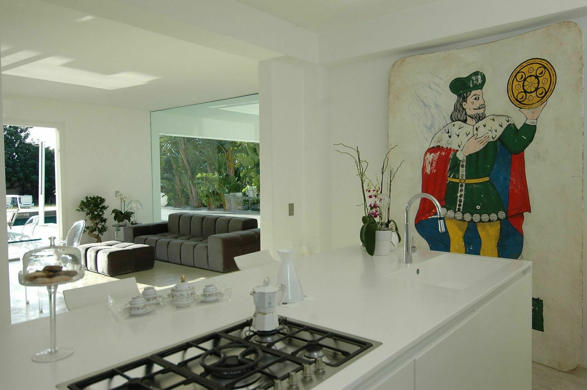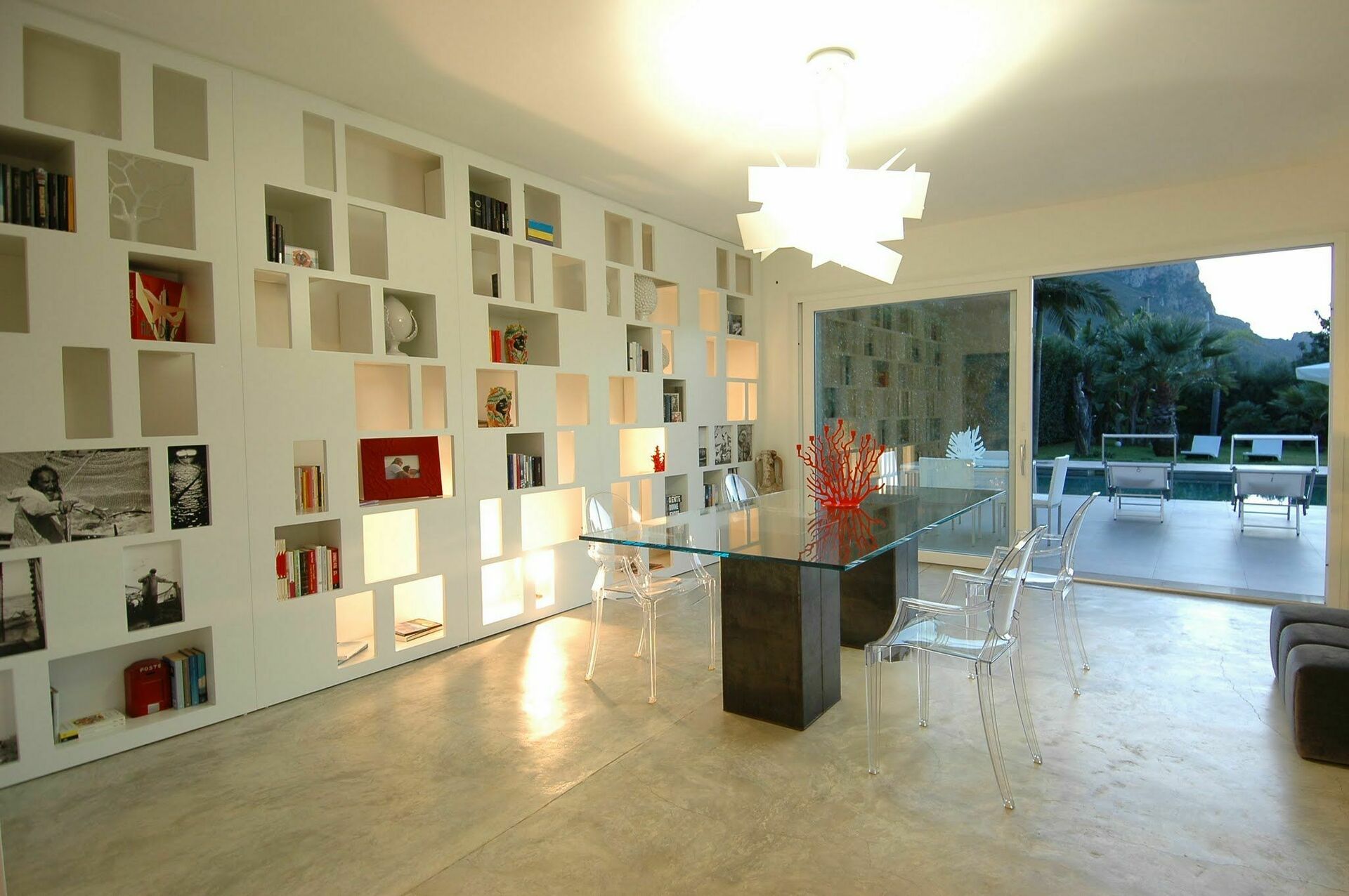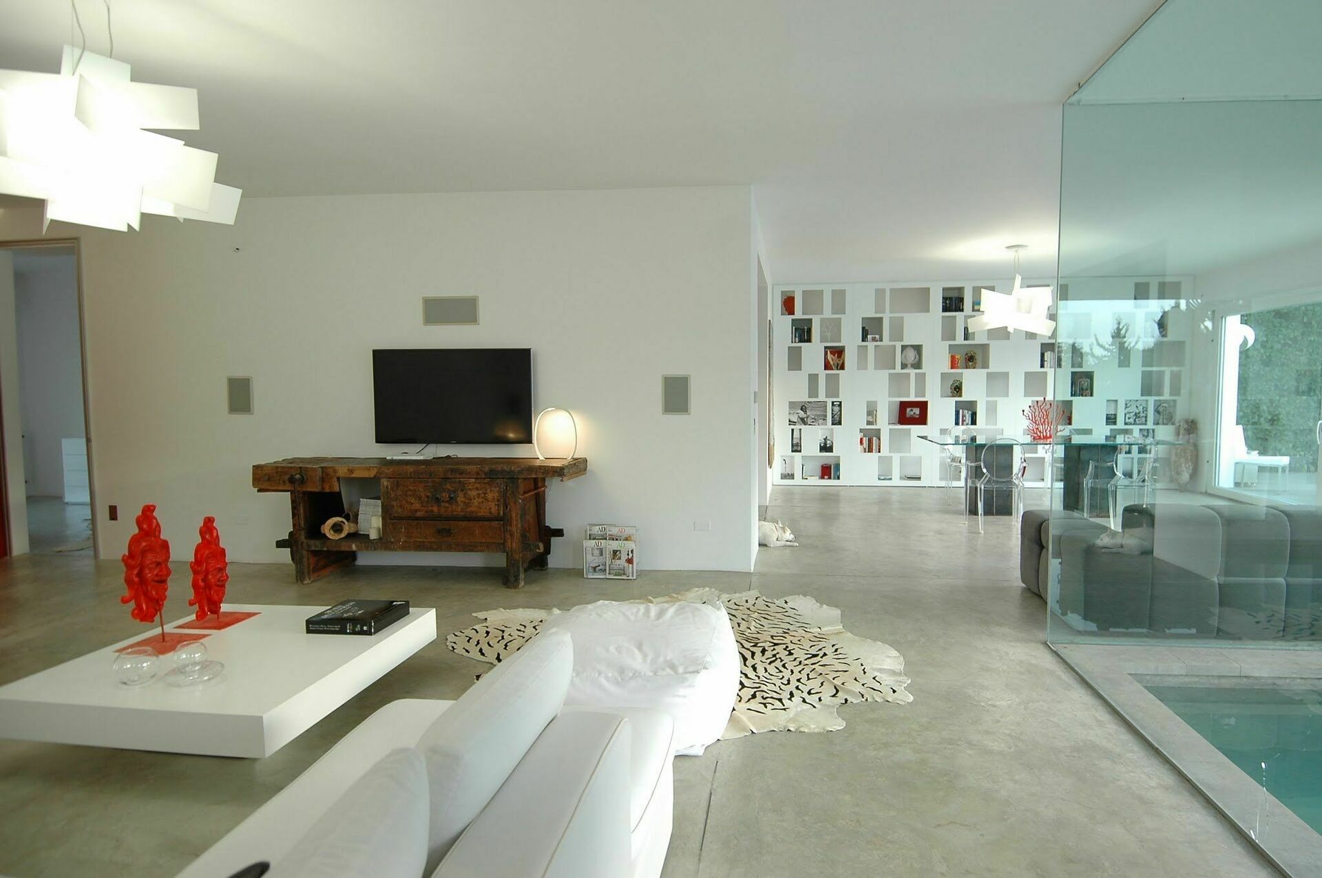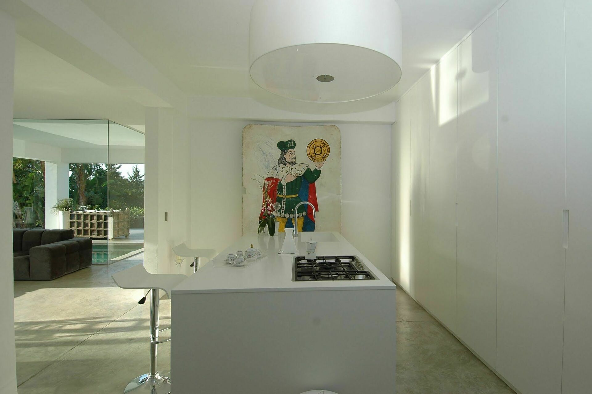 Grande partie jour composée de séjour, zone et cuisine. Les grandes baies vitrées permettent d’admirer la piscine qui se prolonge dans le séjour.