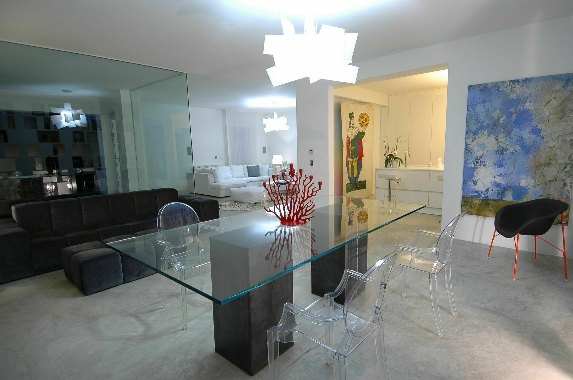 Intérieurs de style élégant avec quelques pièces d'art soigneusement disposées pour en souligner l'impact décoratif ainsi que quelques pièces d’ameublement design.