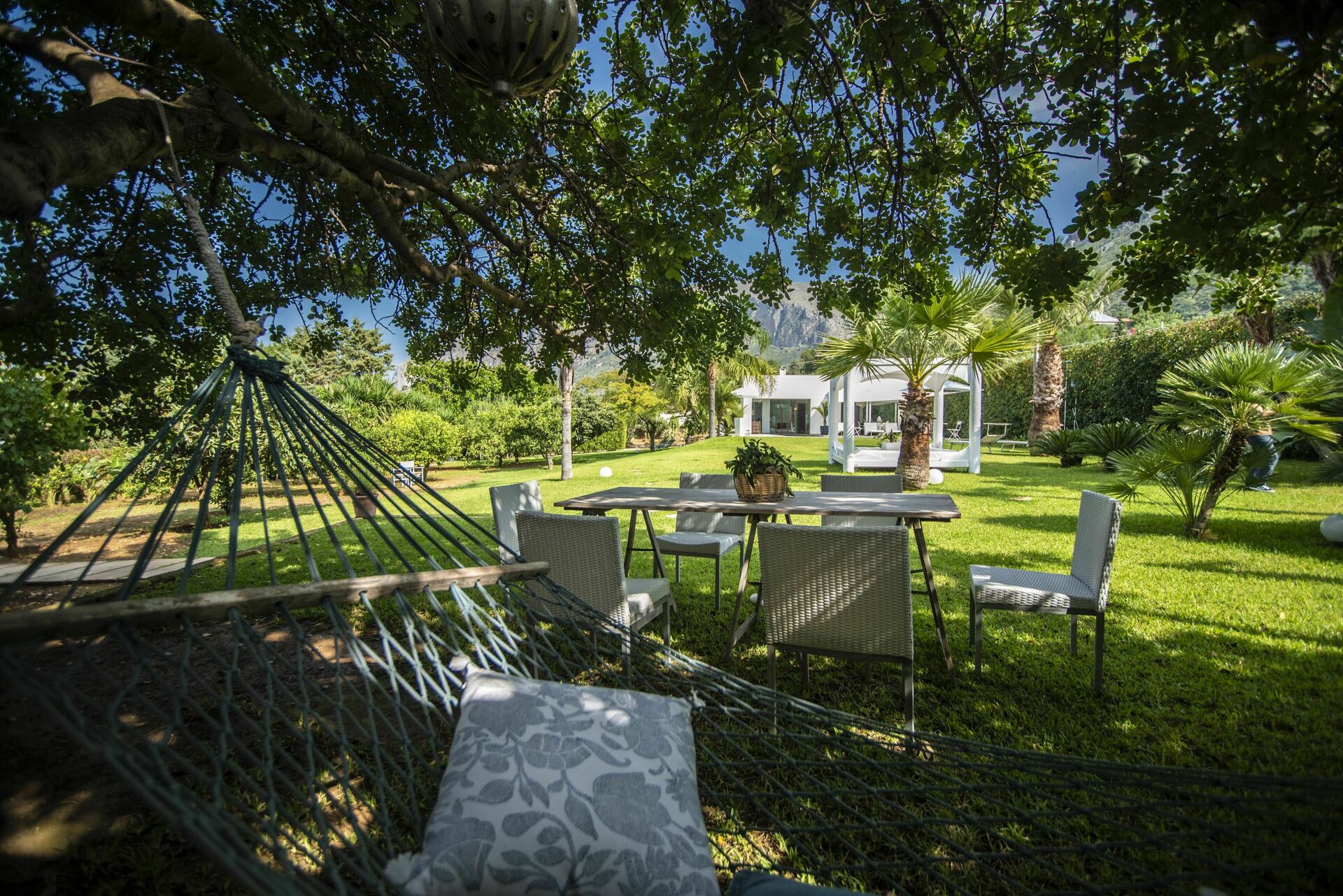 Dans un coin du jardin, la garrigue méditerranéenne entoure la zone de barbecue et la zone équipée pour savourer les délicieux plats de la cuisine sicilienne en contact direct avec la nature.