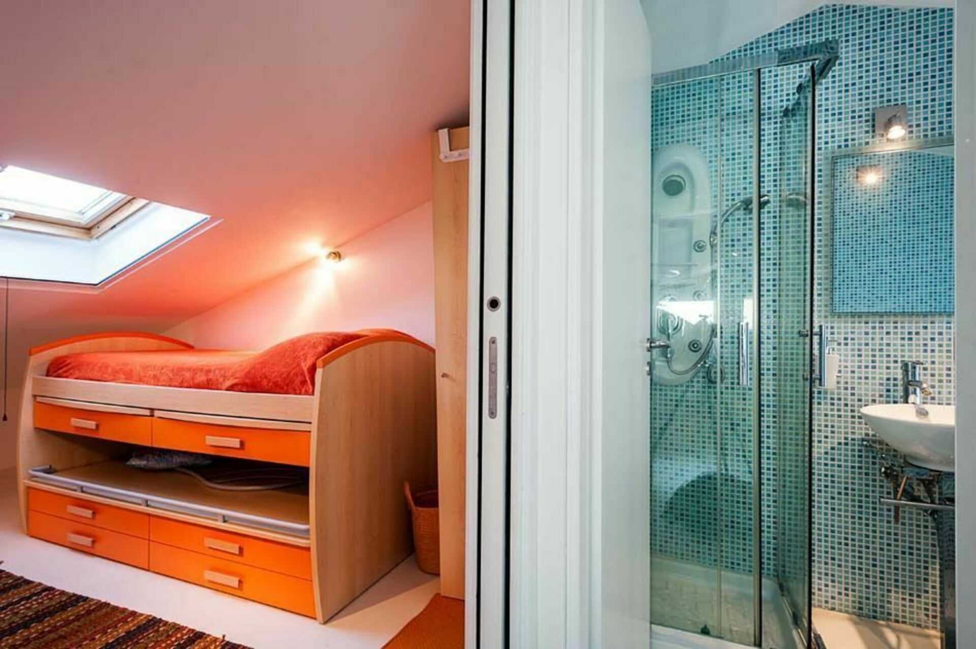 - free designer stairs leading upstairs (to the bedrooms) without handrail (difficult for disabled people or small children), adults cannot stand upright everywhere in the bedrooms and the bathroom upstairs