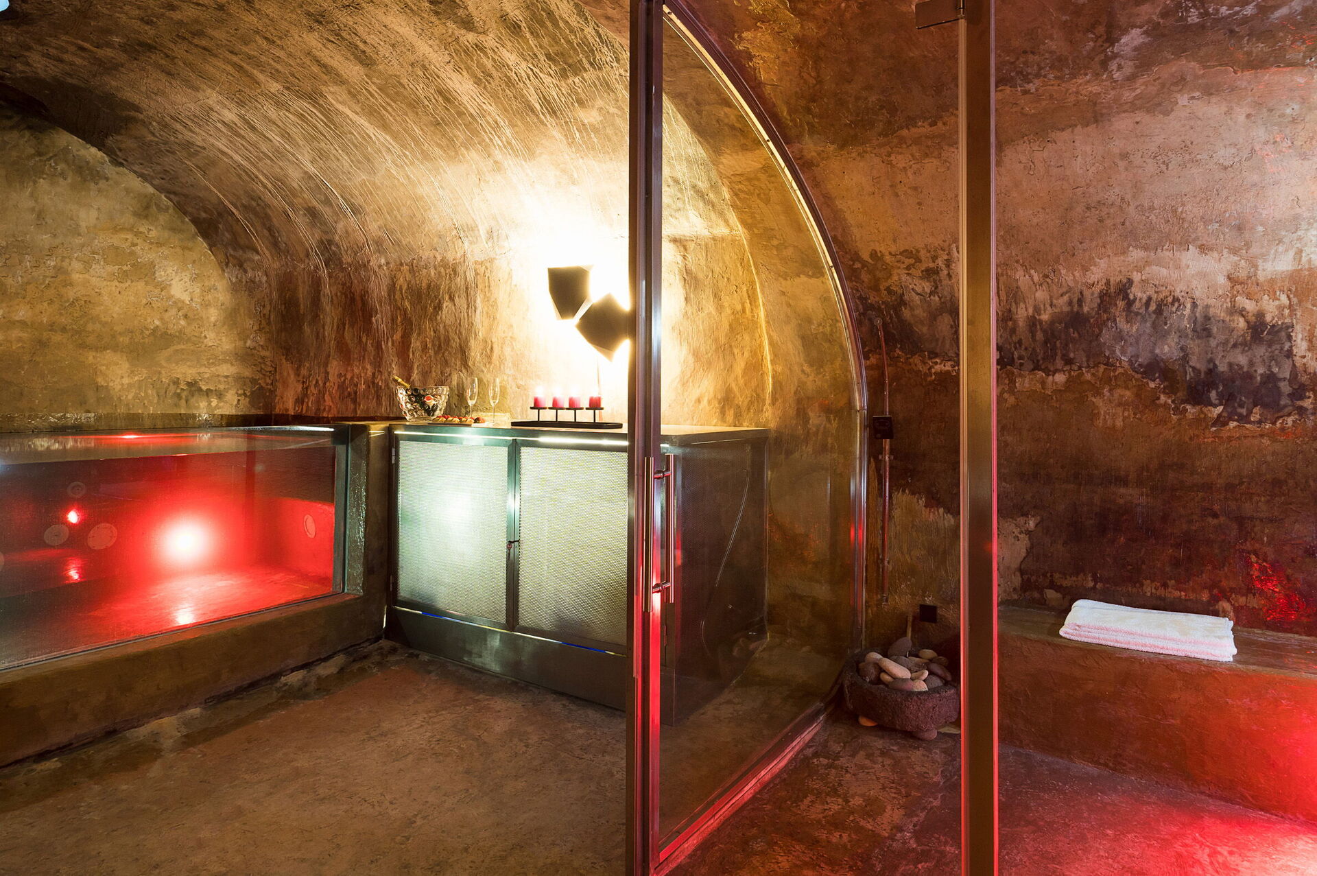 Étage inférieur: espace bien-être avec jacuzzi, grotte de sel, sauna, bain turc, douche multi-sensorielle, espace détente.