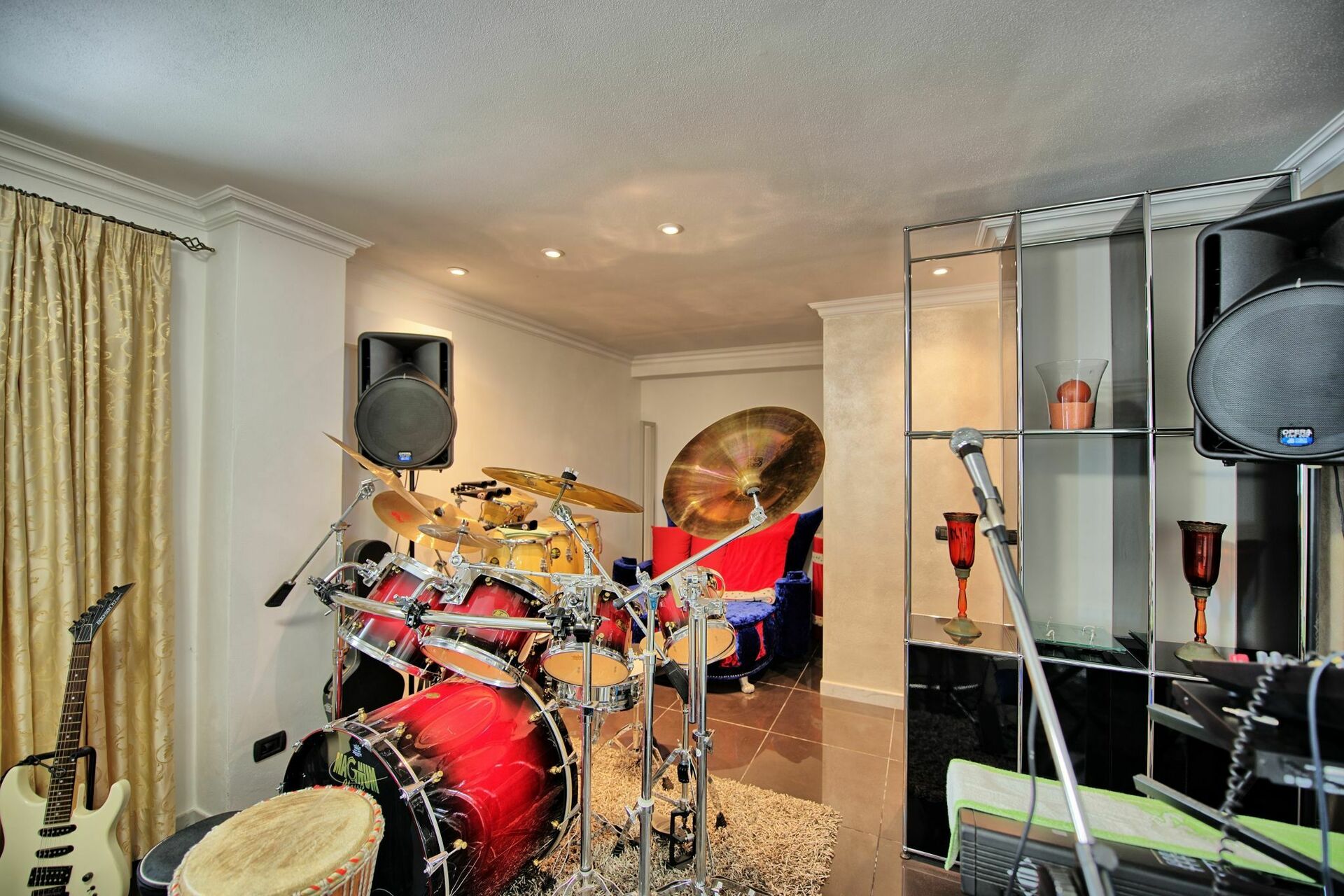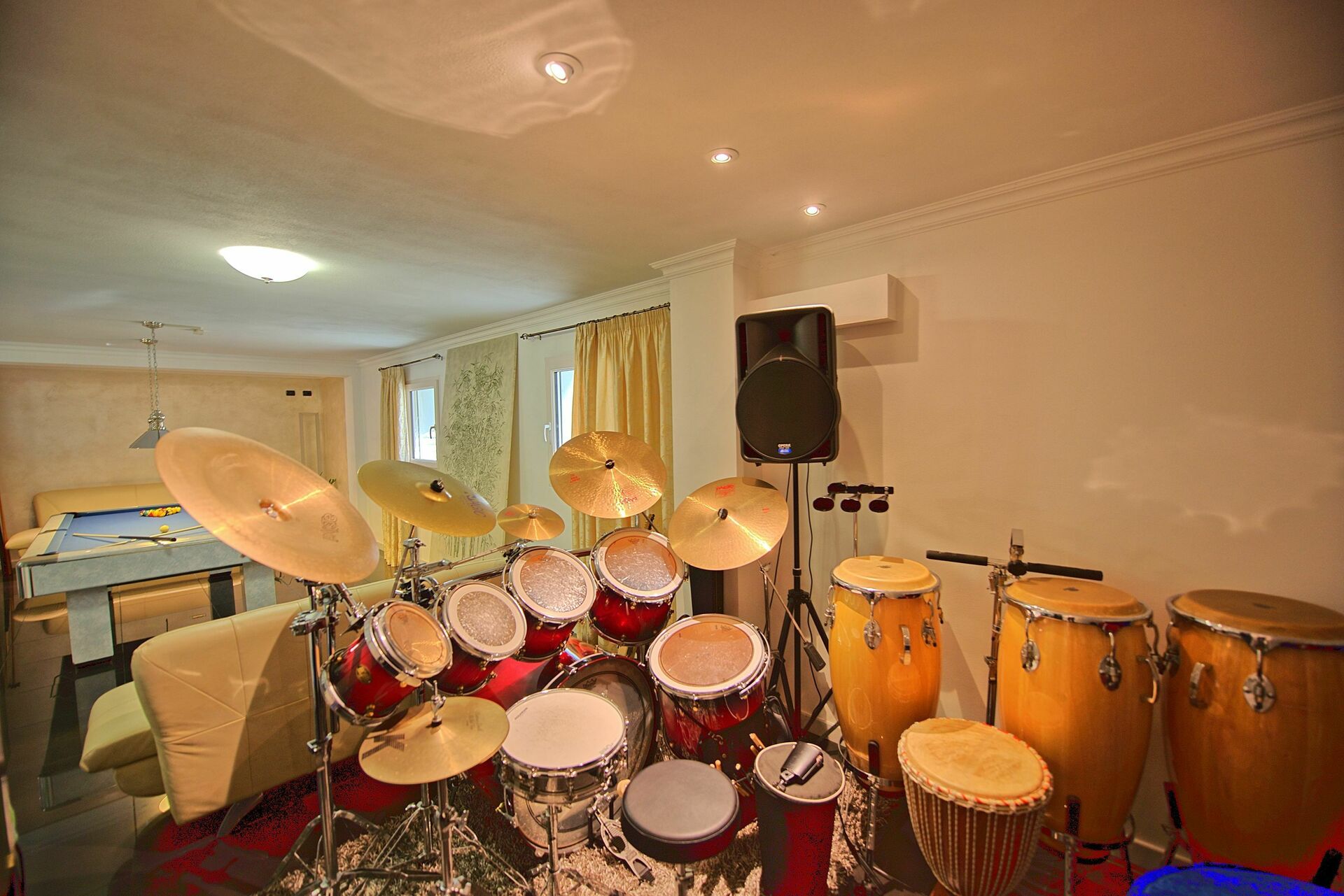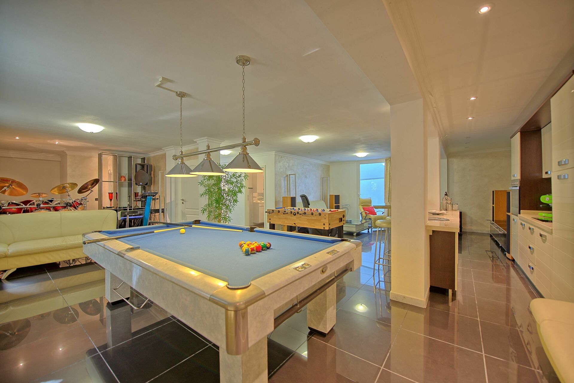Sous-sol : (accessible également de l’extérieur) : séjour avec coin-cuisson (four, freezer, lave-vaisselle), zone équipée pour les projections/cinéma (dolby surround), baby-foot, billard, instruments musicaux (batterie, clavier, micros), buanderie (lave-linge et sèche-linge), salle de bains avec douche.