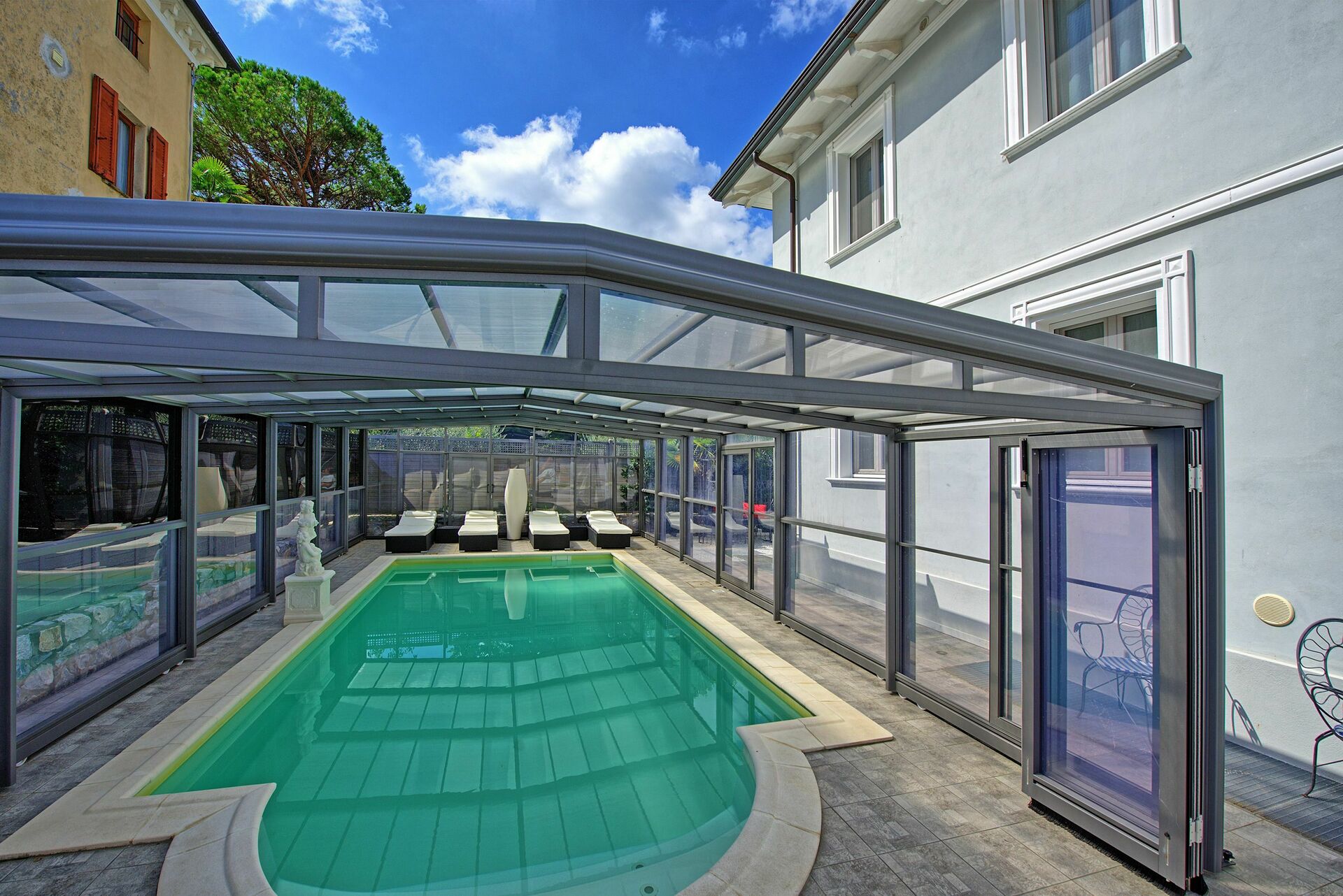 La piscine peut être couverte (structure télescopique) durant la mi-saison. Piscine illuminée de nuit (8 tonalités au choix).
