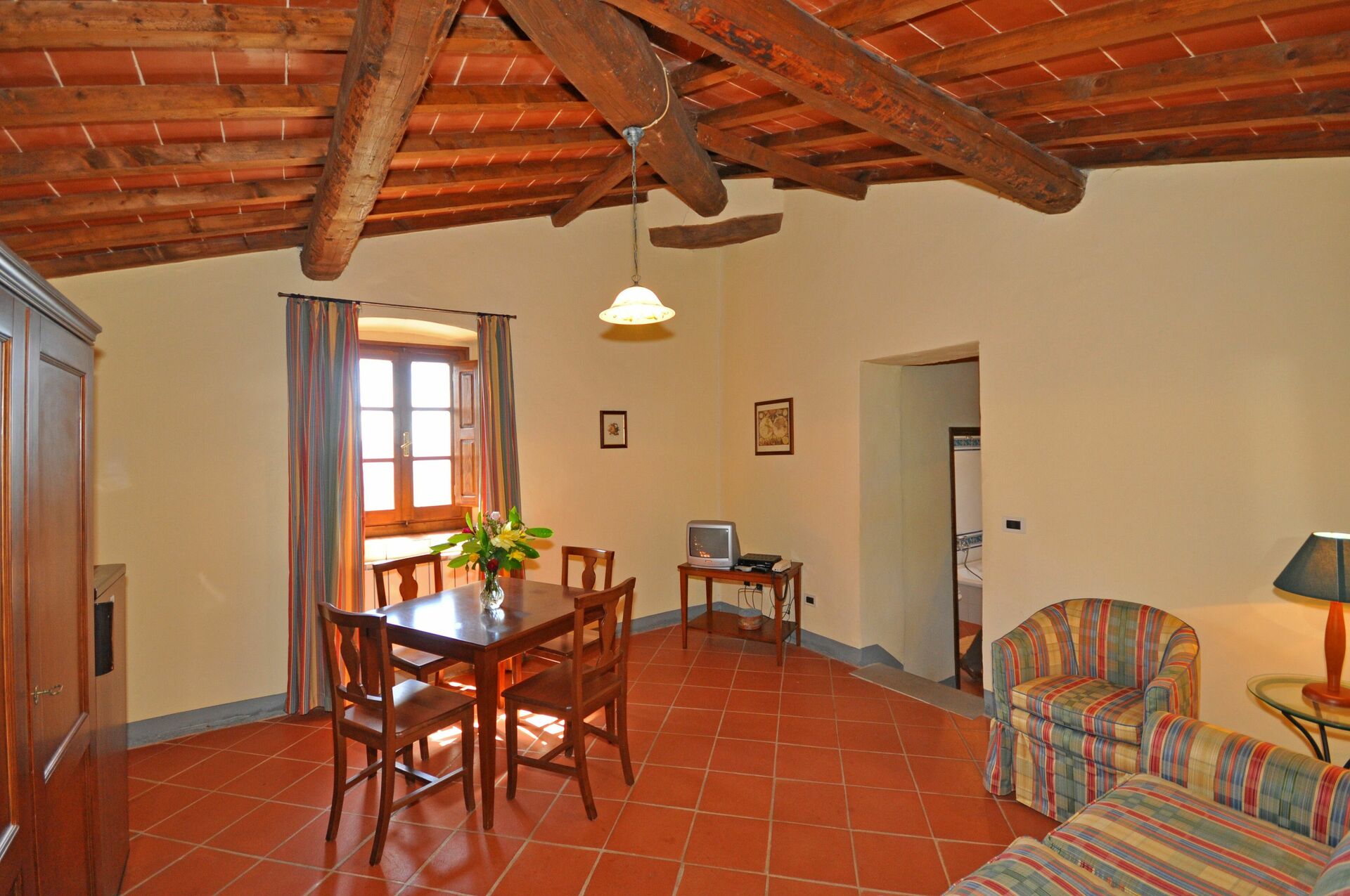 Premier étage: séjour/salle à manger (TV-Sat) avec coin-cuisson (2 Plaques électriques) et accès sur une petite terrasse couverte privée et équipée avec table.