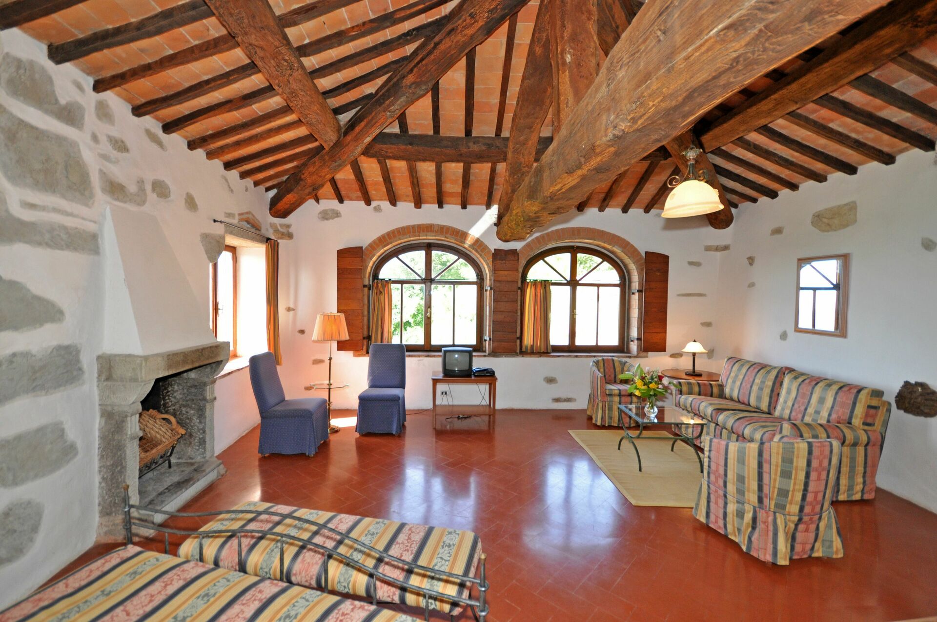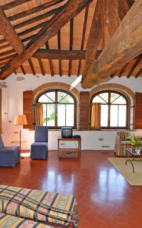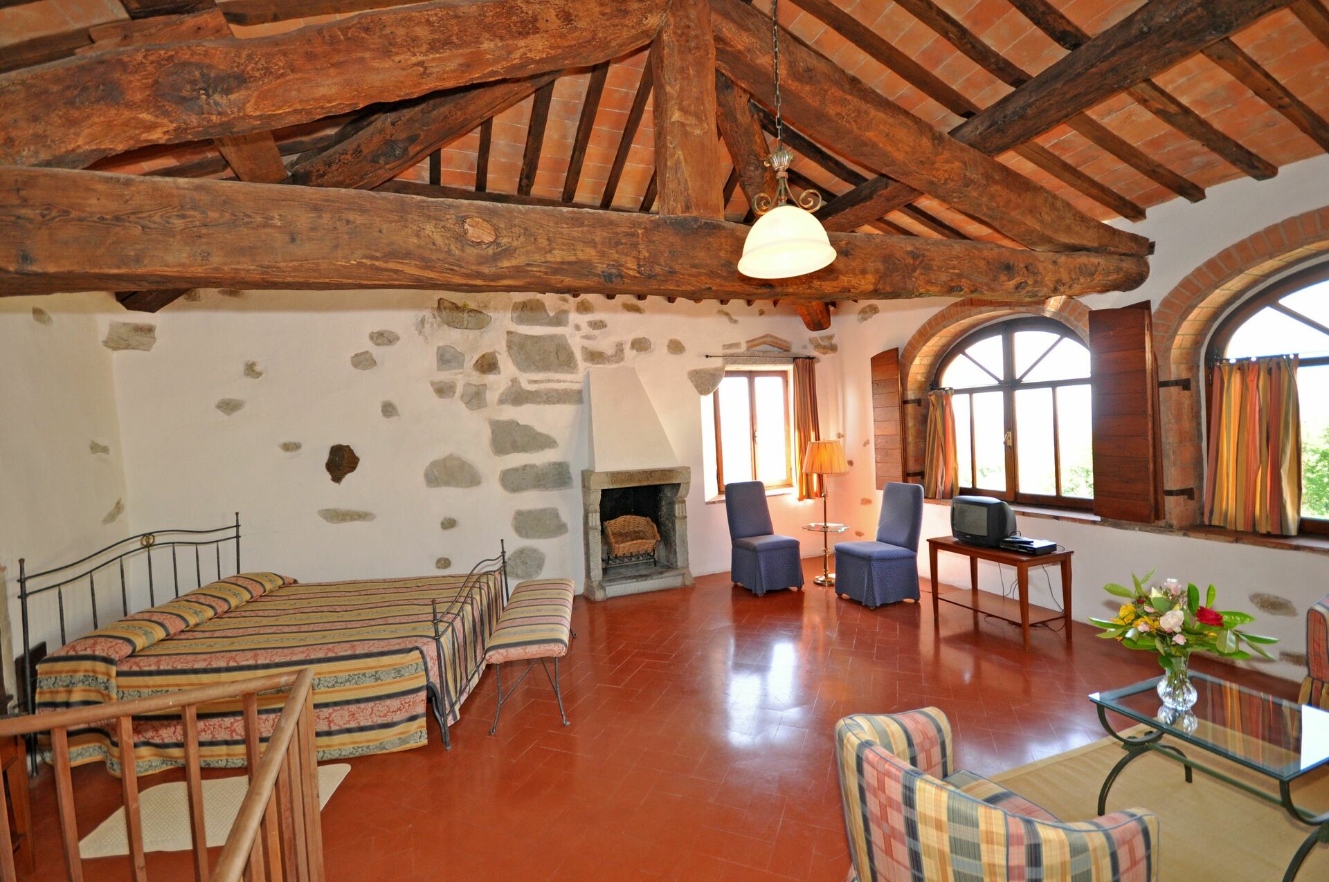Deuxième étage (dans la tour): grande suite avec grand lit, cheminée et zone séjour (TV-Sat).