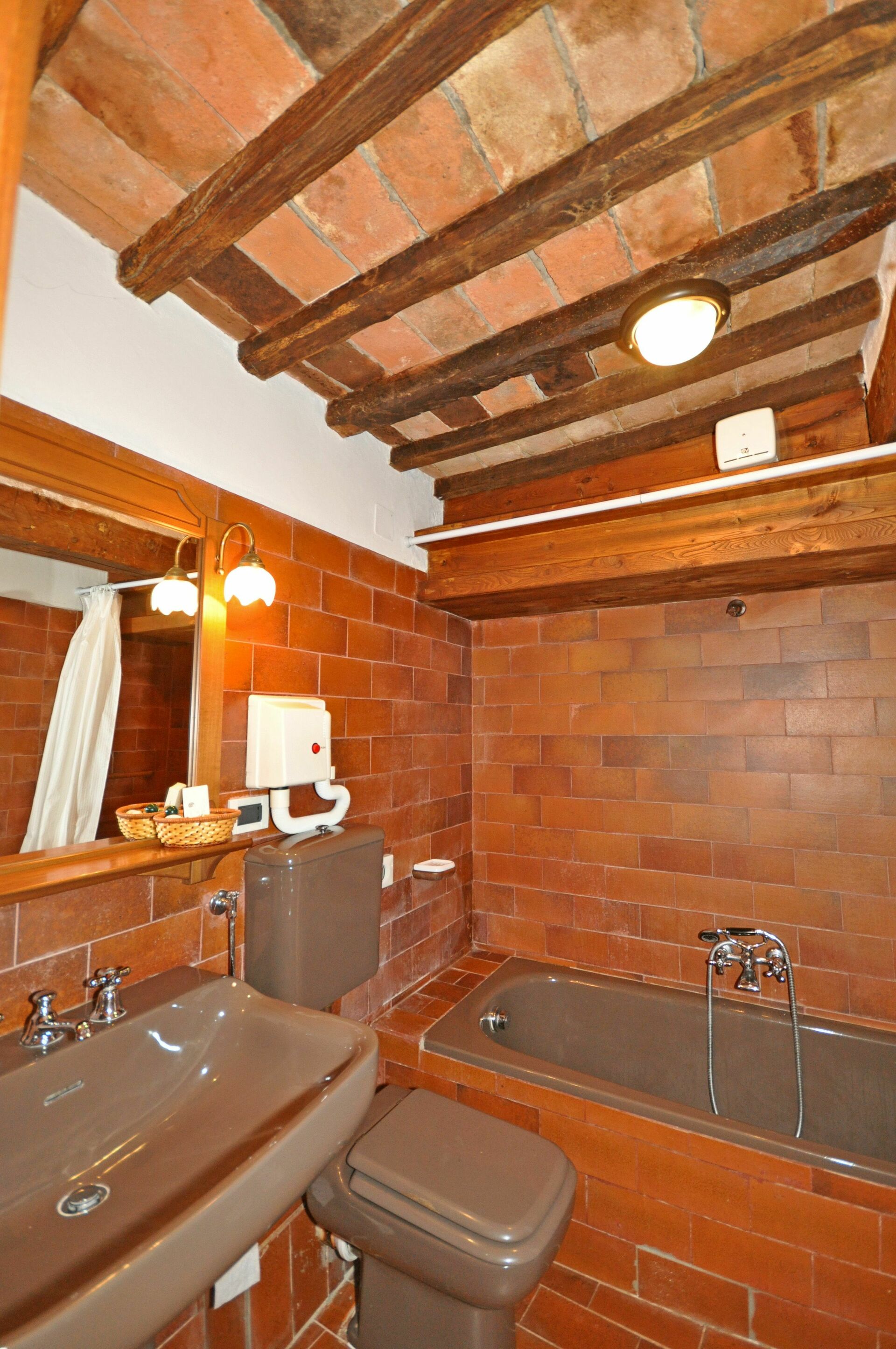 Premier étage: zone repas avec coin-cuisson (four, 2 Plaques électriques), salle de bains avec baignoire (sèche-cheveux).