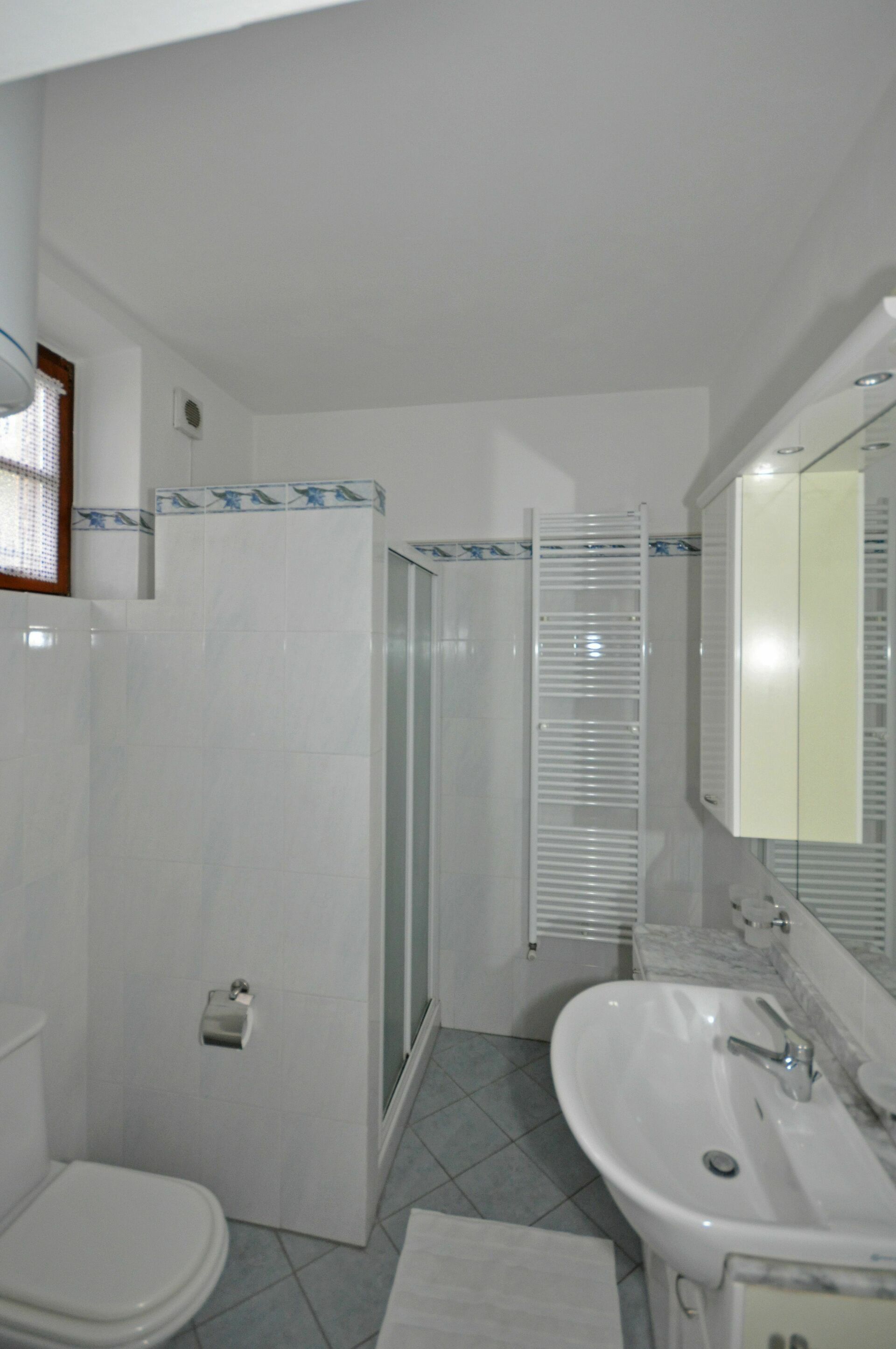 2 marches plus bas (réf. : chambre de passage): une chambre double (2 lits séparés sur demande; accès sur l’extérieur, salle de bains avec douche (sans bidet).