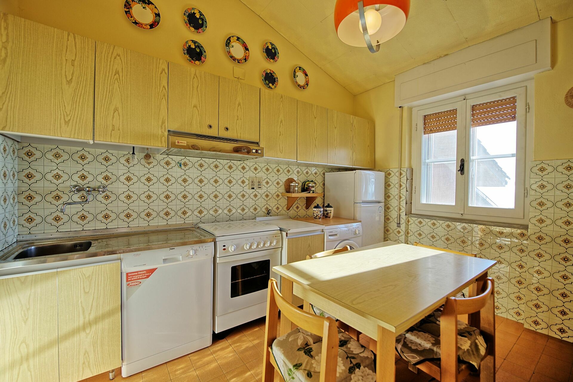 Rez-de-chaussée: entrée sur un lumineux séjour/salle à manger avec accès sur une terrasse panoramique équipée, cuisine (four, freezer, lave-vaisselle, lave-linge), une chambre double, une petite chambre avec 2 lits à une place, salle de bains avec petite baignoire.