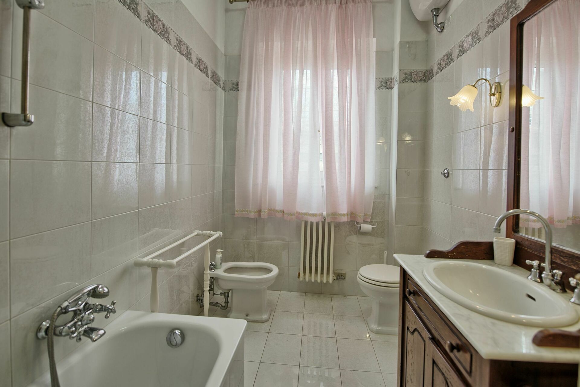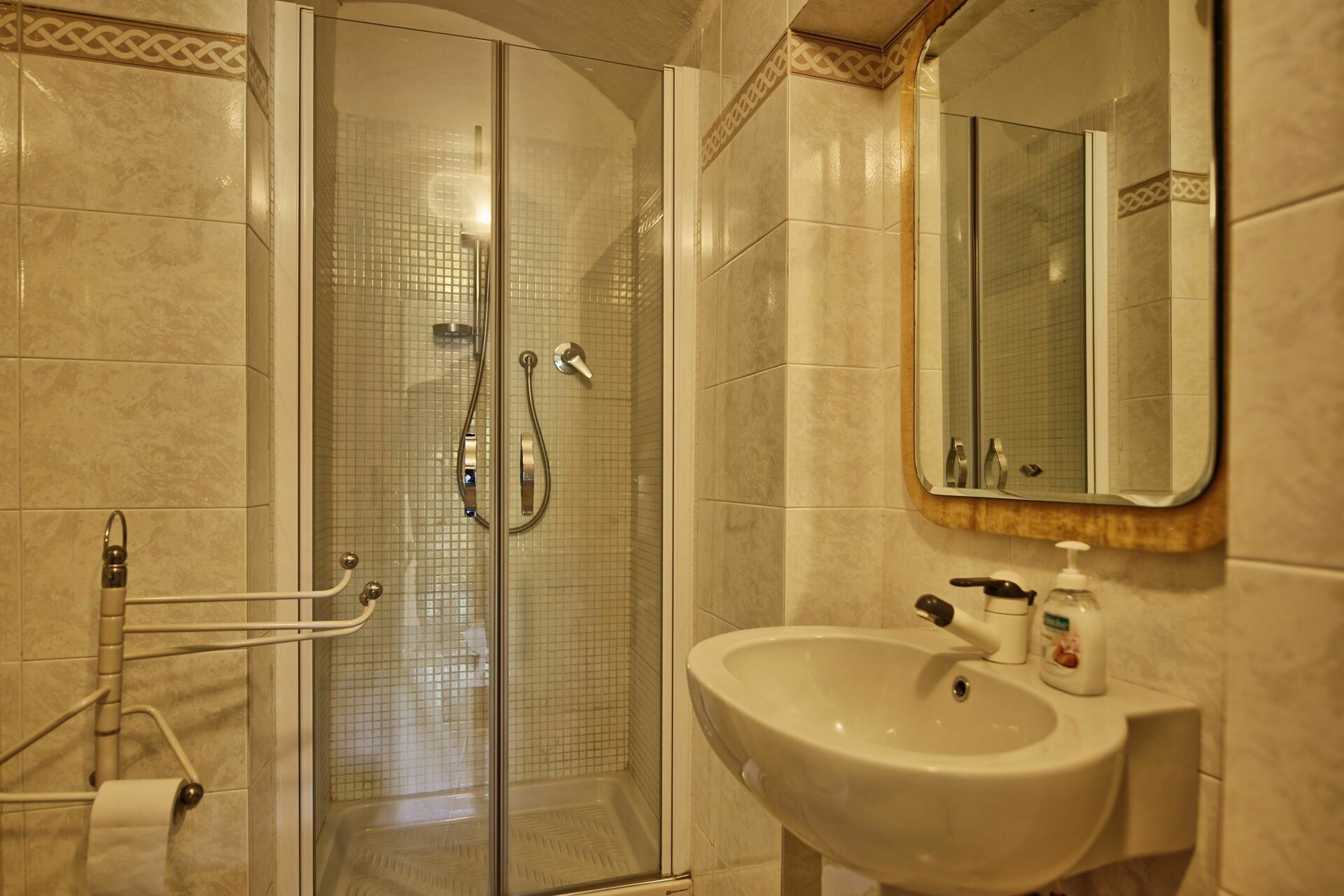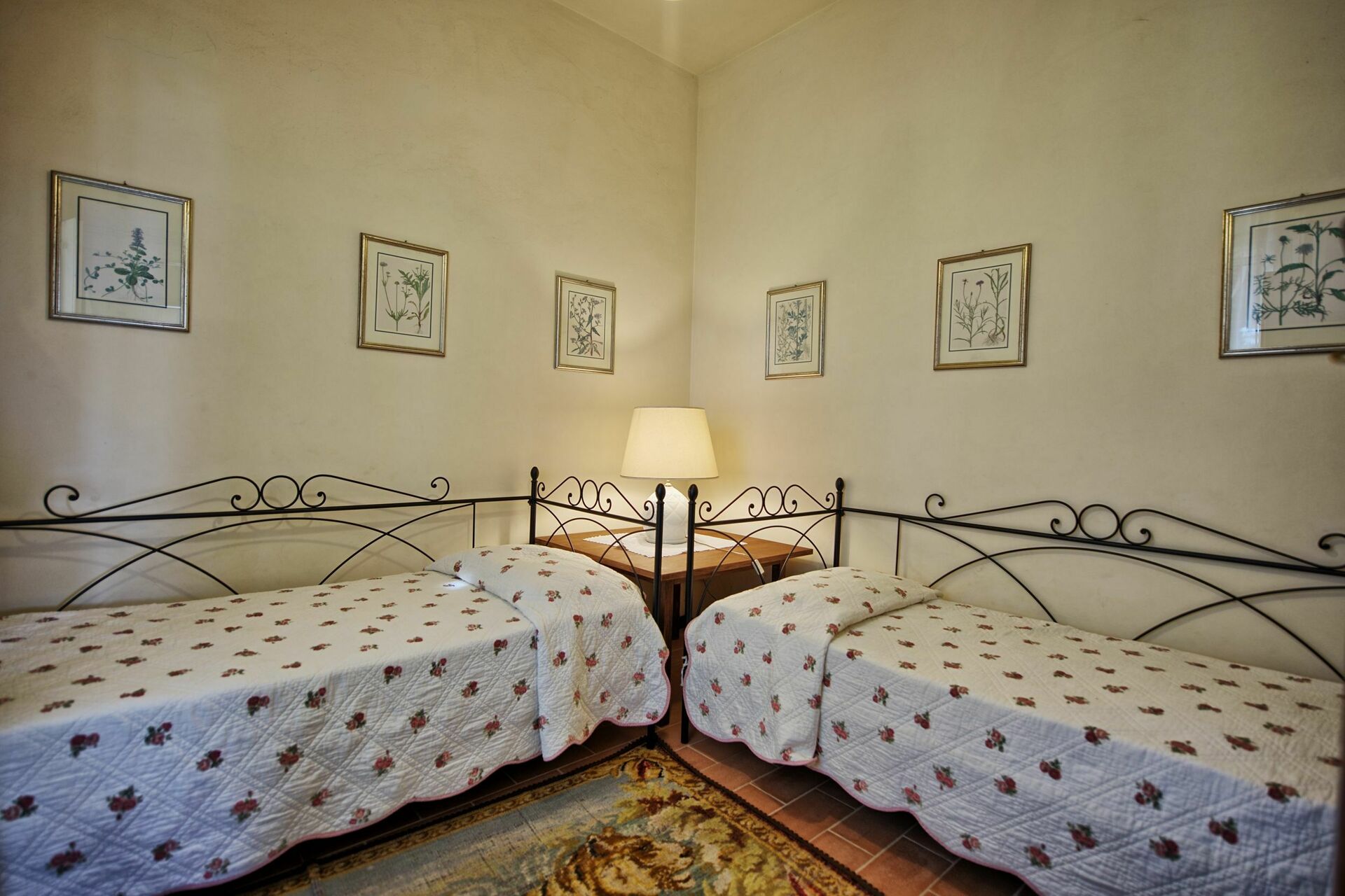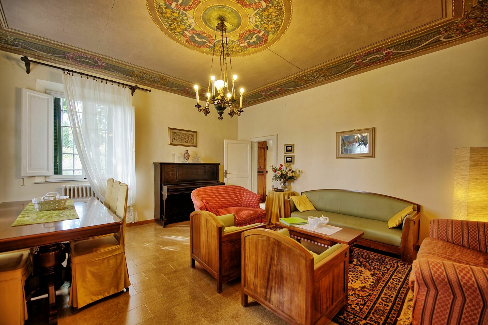 Premier étage: une chambre double (plafond décoré de fresques), 2 chambres doubles (plafond décoré de fresques) – possibilité d’avoir 2 lits à une place sur demande à la réservation, une chambre avec 2 lits à une place, salle de bains avec baignoire, salle de bains avec douche.