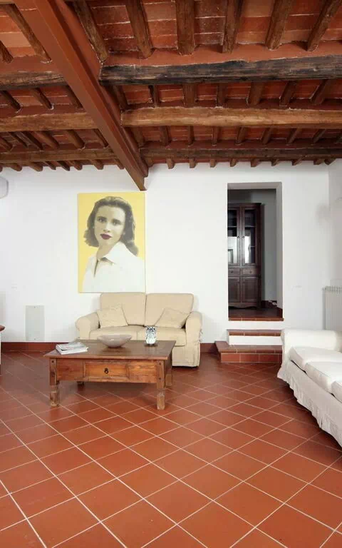 Poutres apparentes aux plafonds, sols de briques terre cuite.