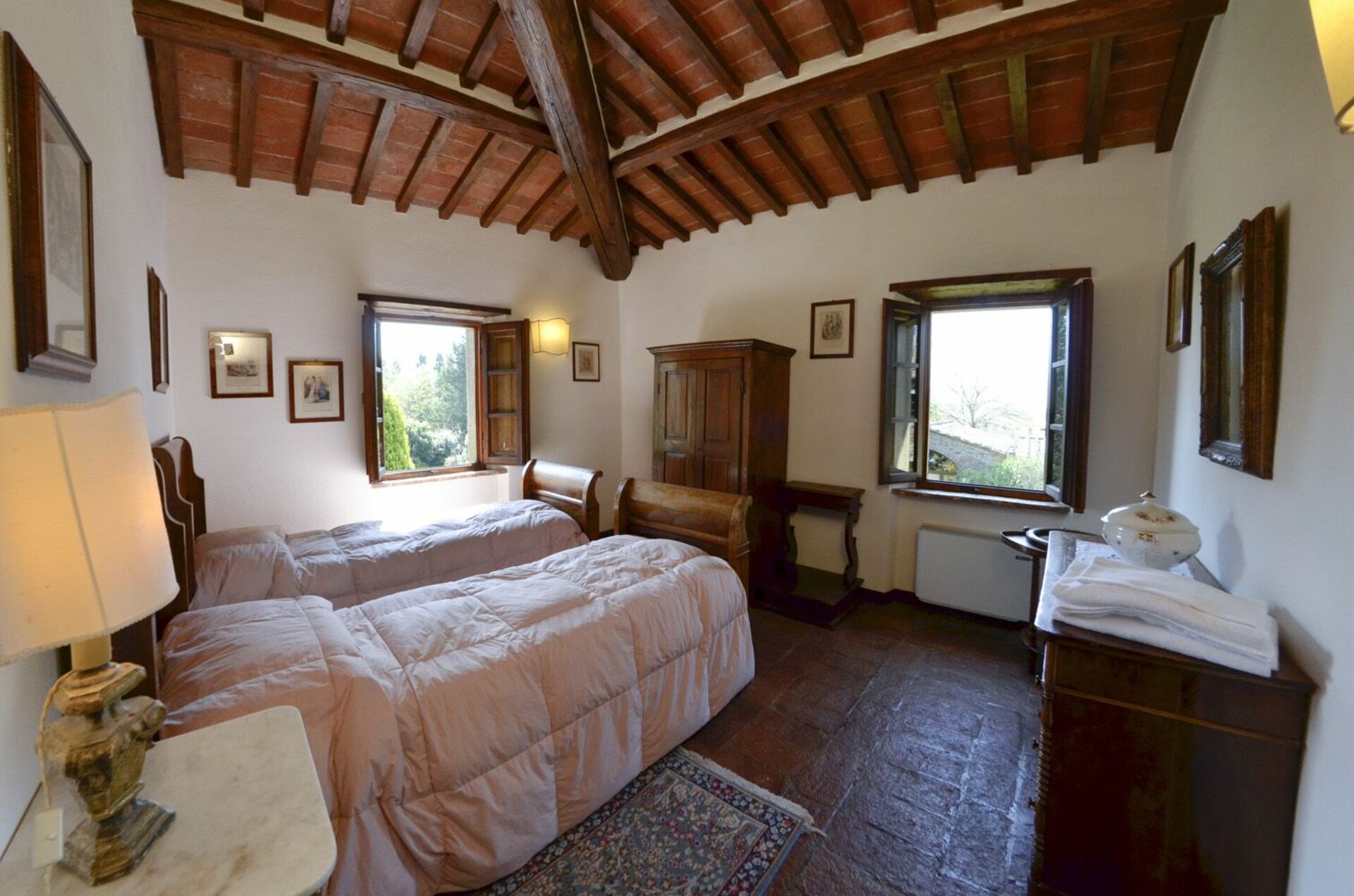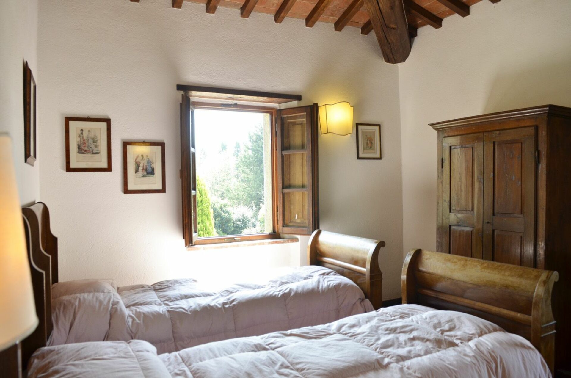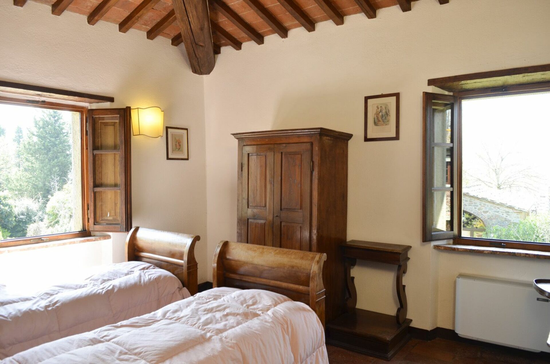 Premier étage : chambre double, chambre à deux lits, salle de bains avec douche.