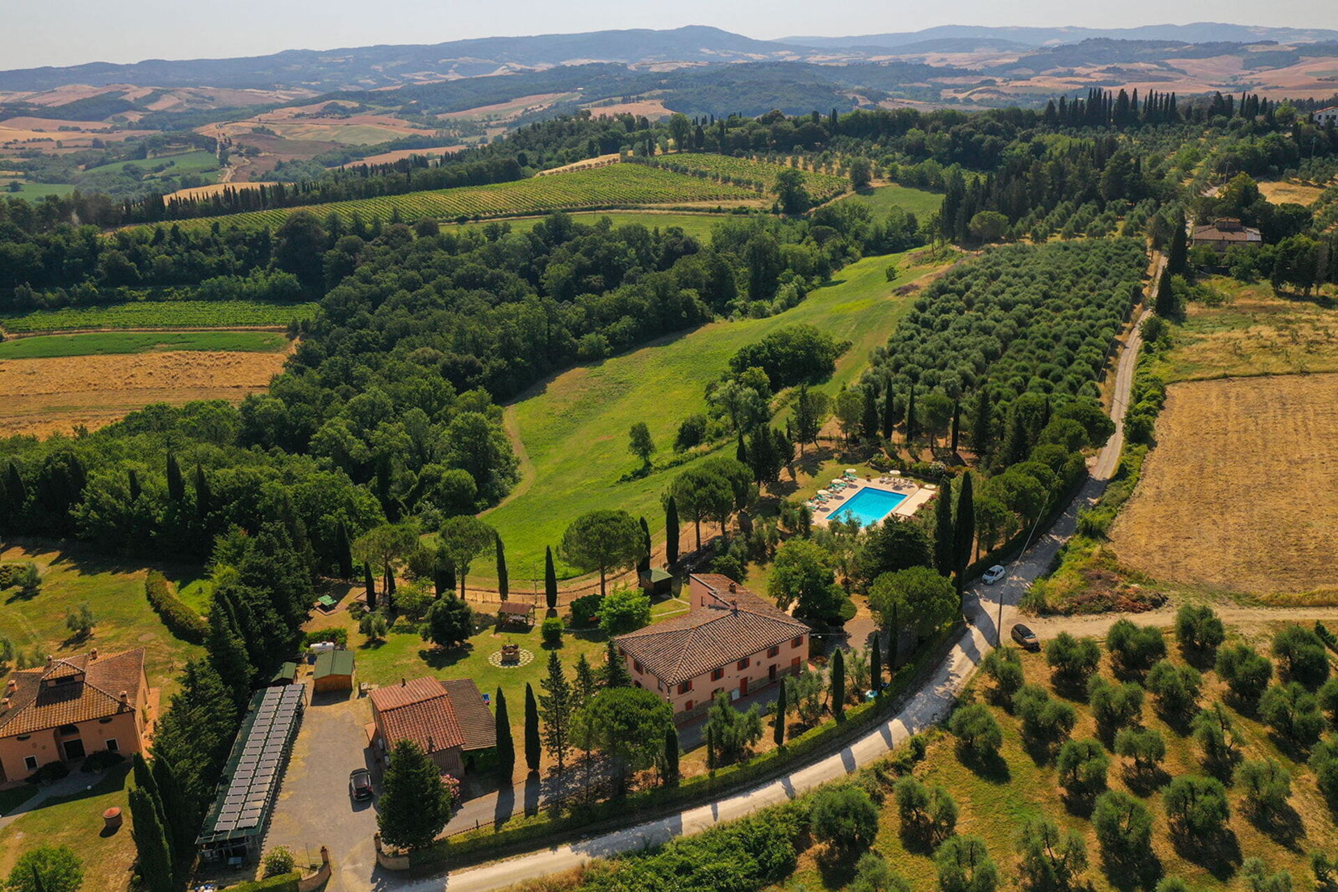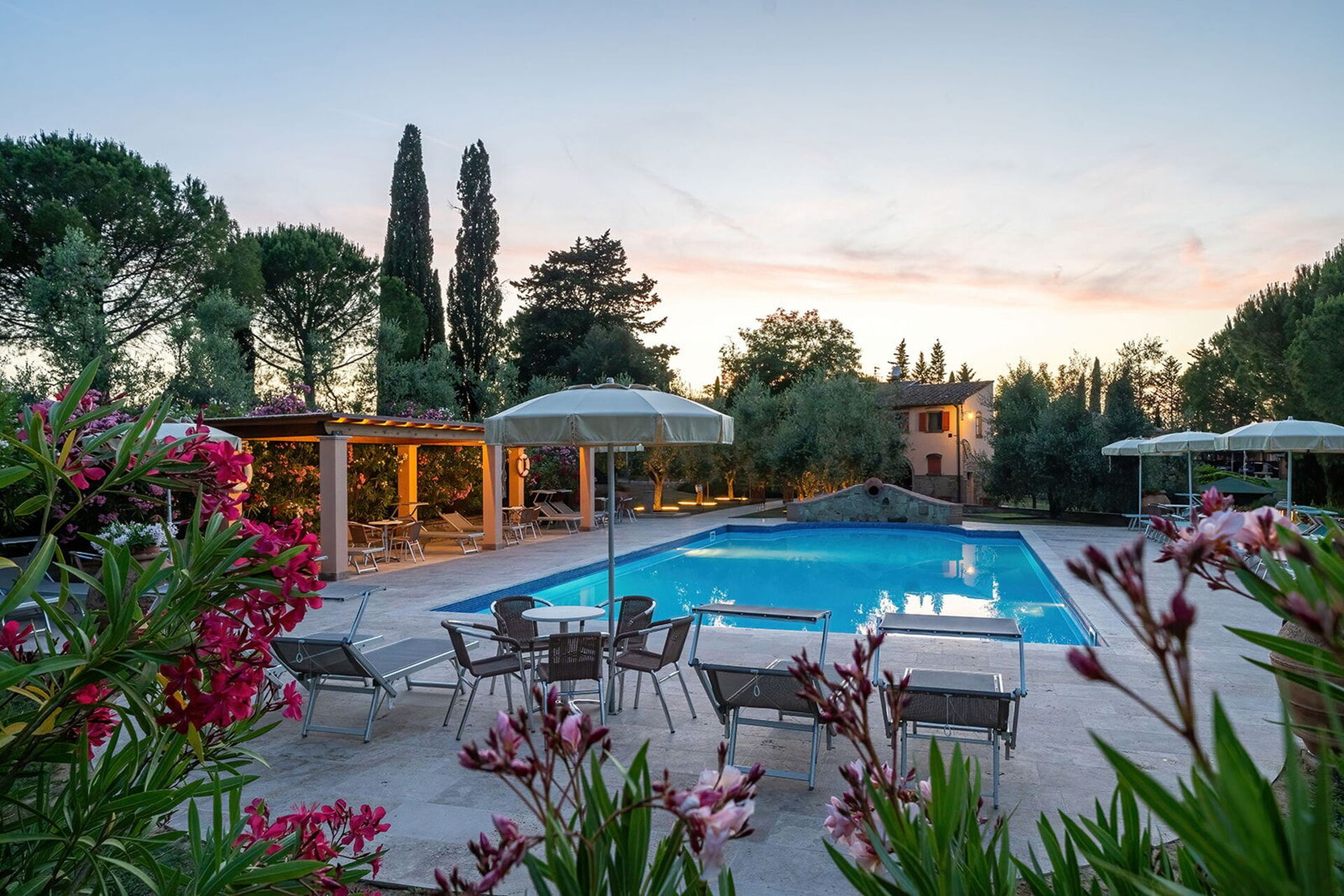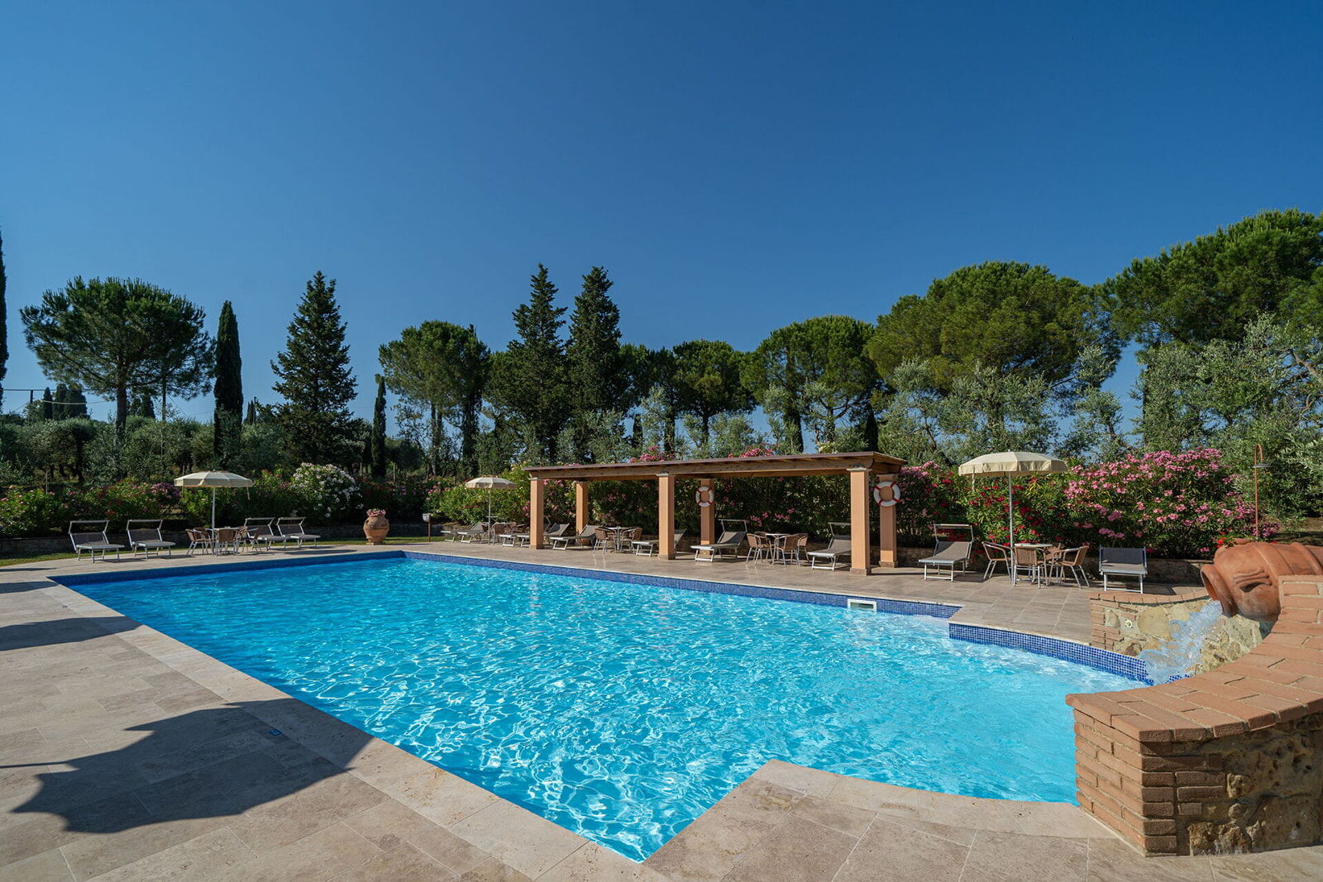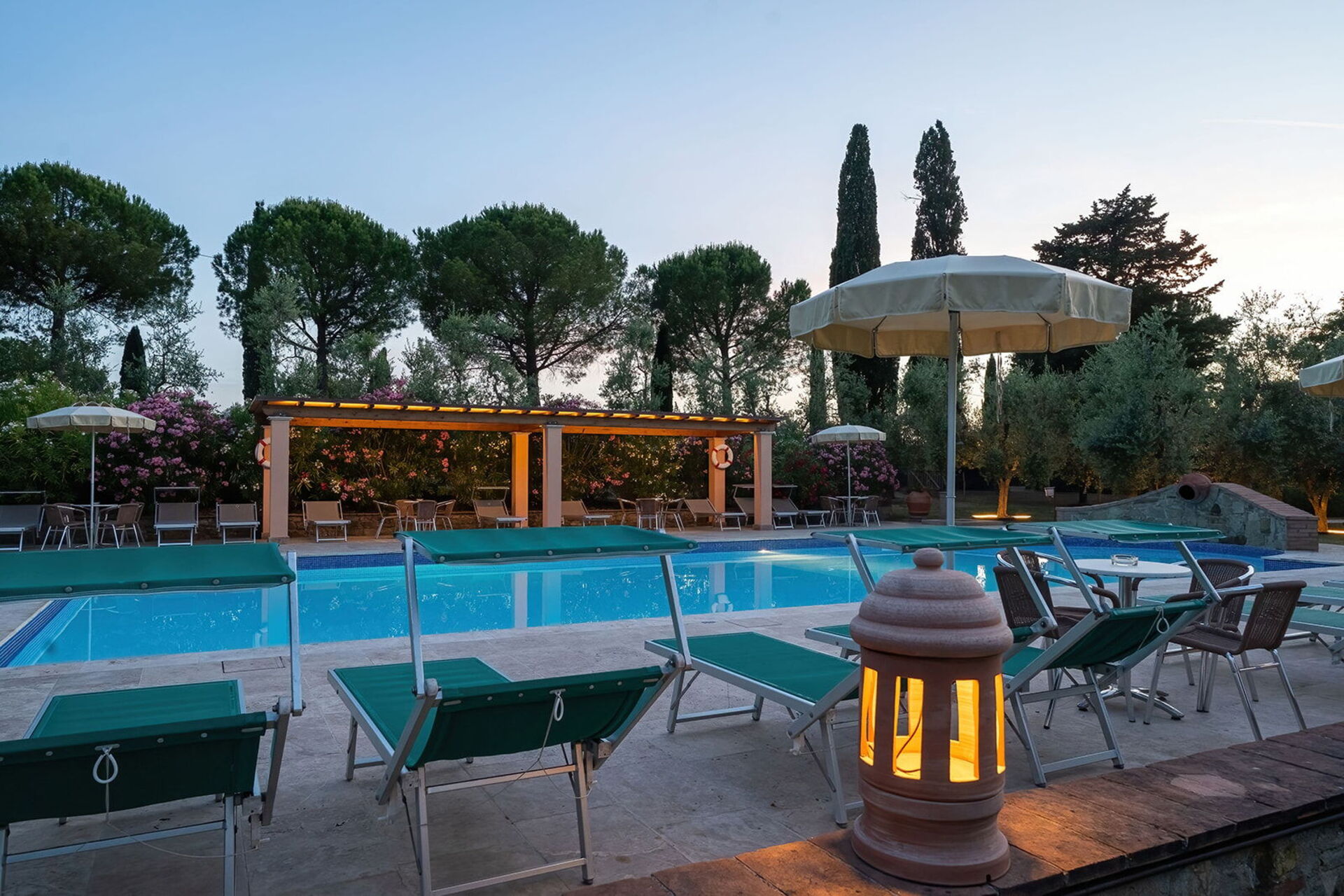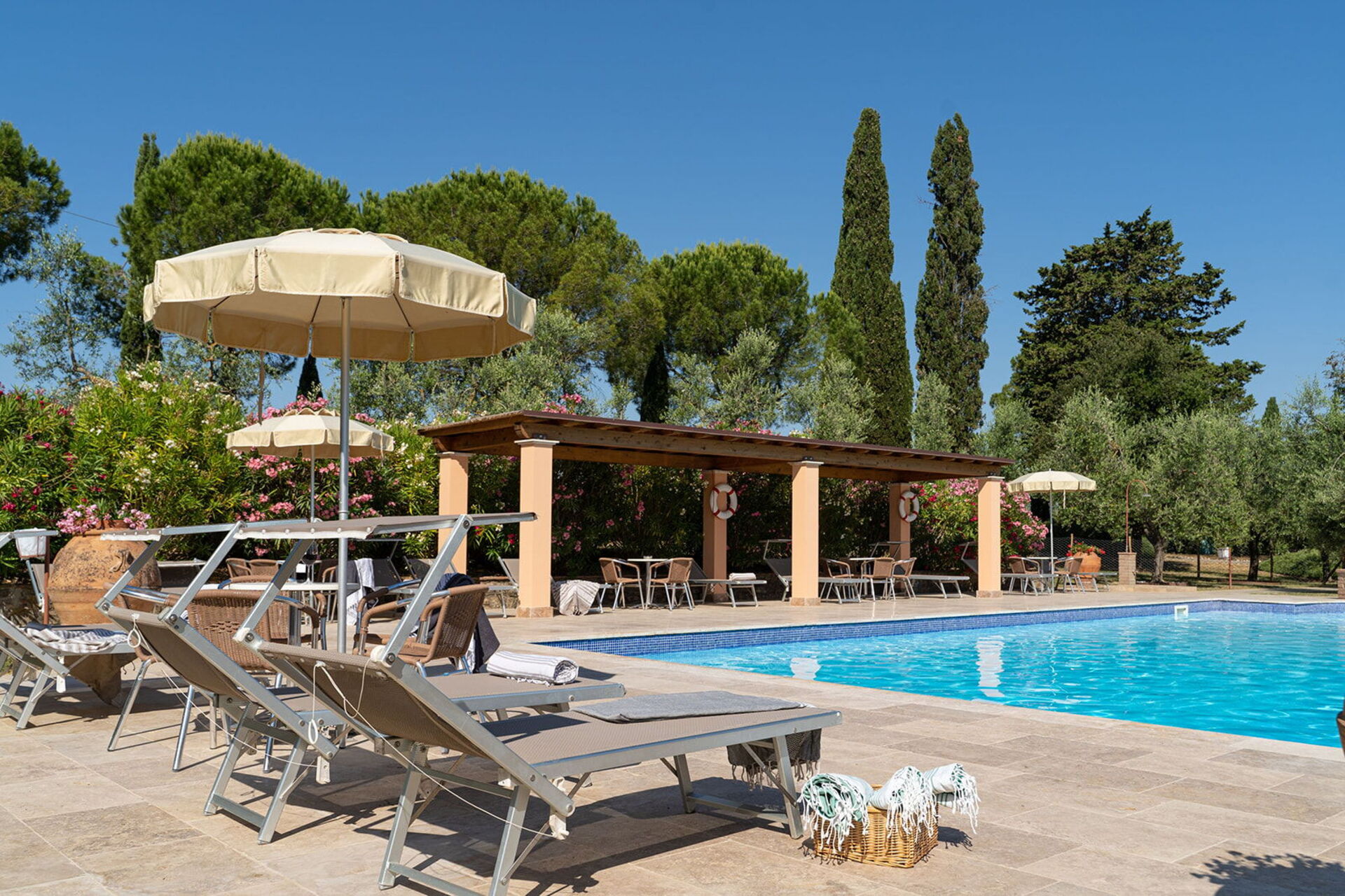 The holiday was excellent. We particularly asked for a wheelchair accessible apartment and our's was up to our requirements. Sadly the beds were too high for my husband to transfer onto but with the help of the manager we were able to use the bedsettee. Other than this the apartments, pool and surrounding area was absolutely wonderful. We had a superb meal at the restaurant down the lane and we enjoyed sightseeing in not only the nearby hilltop villages but also San Gimignarno, Pisa and Florence. One week really wasn't long enough and we all hope to visit our apartment at this lovely complex again but next time for longer! Our thanks to the management for our Italian idyll!