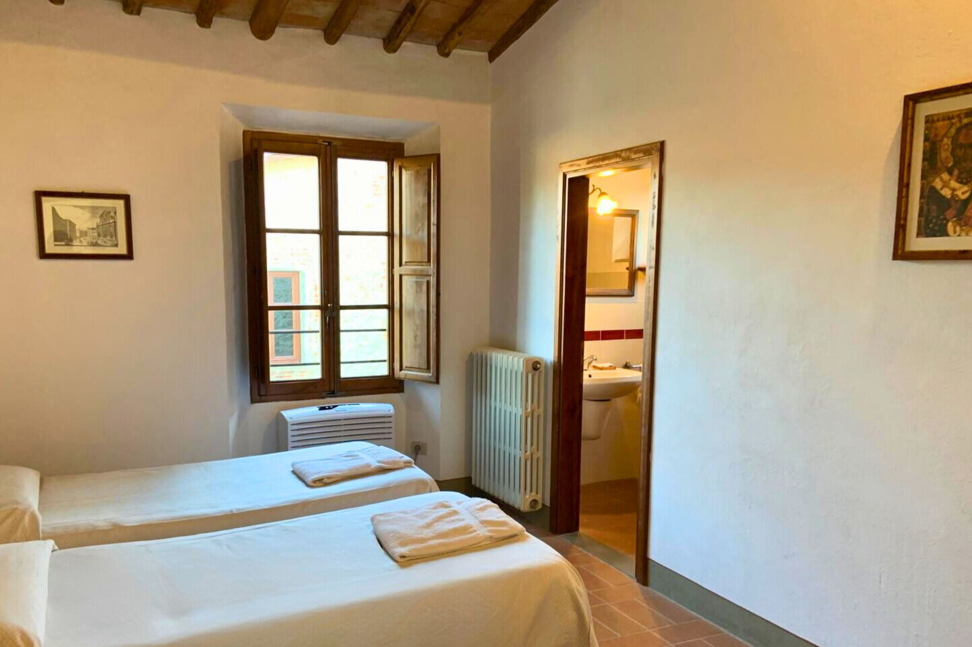 Premier étage: chambre doubles (air conditionné) avec salle de bains privée avec douche, chambre avec 2 lits à une place (air conditionné) et salle de bains privée avec douche.