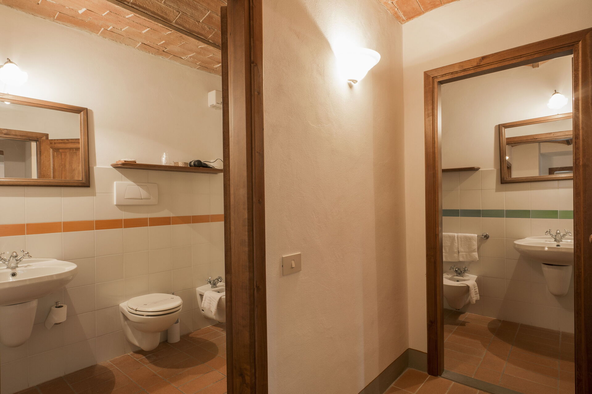 2 marches plus haut: chambre avec 2 lits à une place, 2 salles de bains avec douche (dont une sans fenêtre).