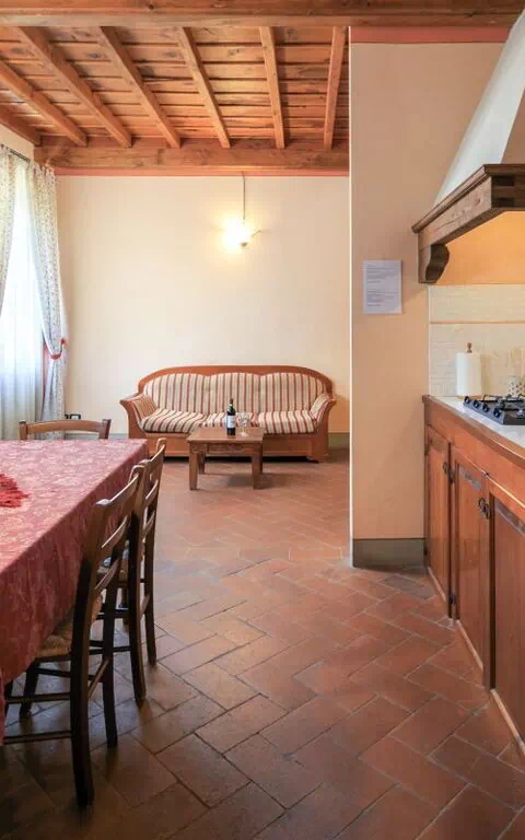 Premier étage : séjour avec coin repas et kitchenette, 2 chambres doubles, salle de bains avec baignoire et douche.