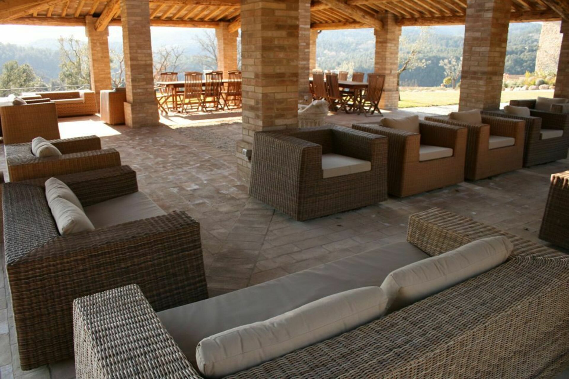A l’extérieur, un grand jardin équipé et bien entretenu et fleuri (nombreuses variétés de roses et plantes), une grande terrasse où sont servis les repas et une « domus », grande surface couverte où profiter du jardin et de la magnifique vue durant les journées trop chaudes. Belle piscine privée en position panoramique.
