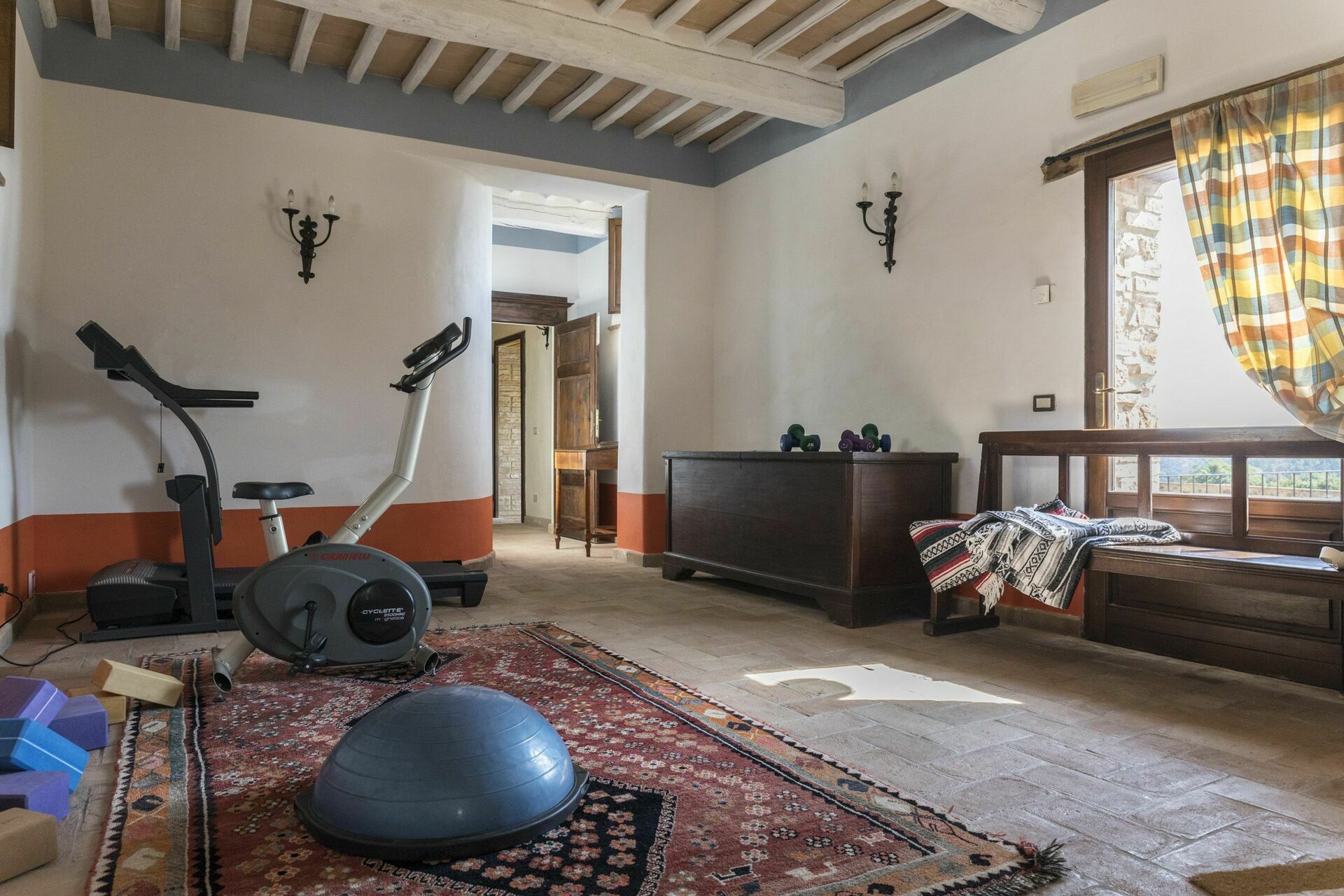 Rez-de-chaussée: pièce “bien-être” avec tapis roulant, vélos et coin massage, salle de bains avec douche.