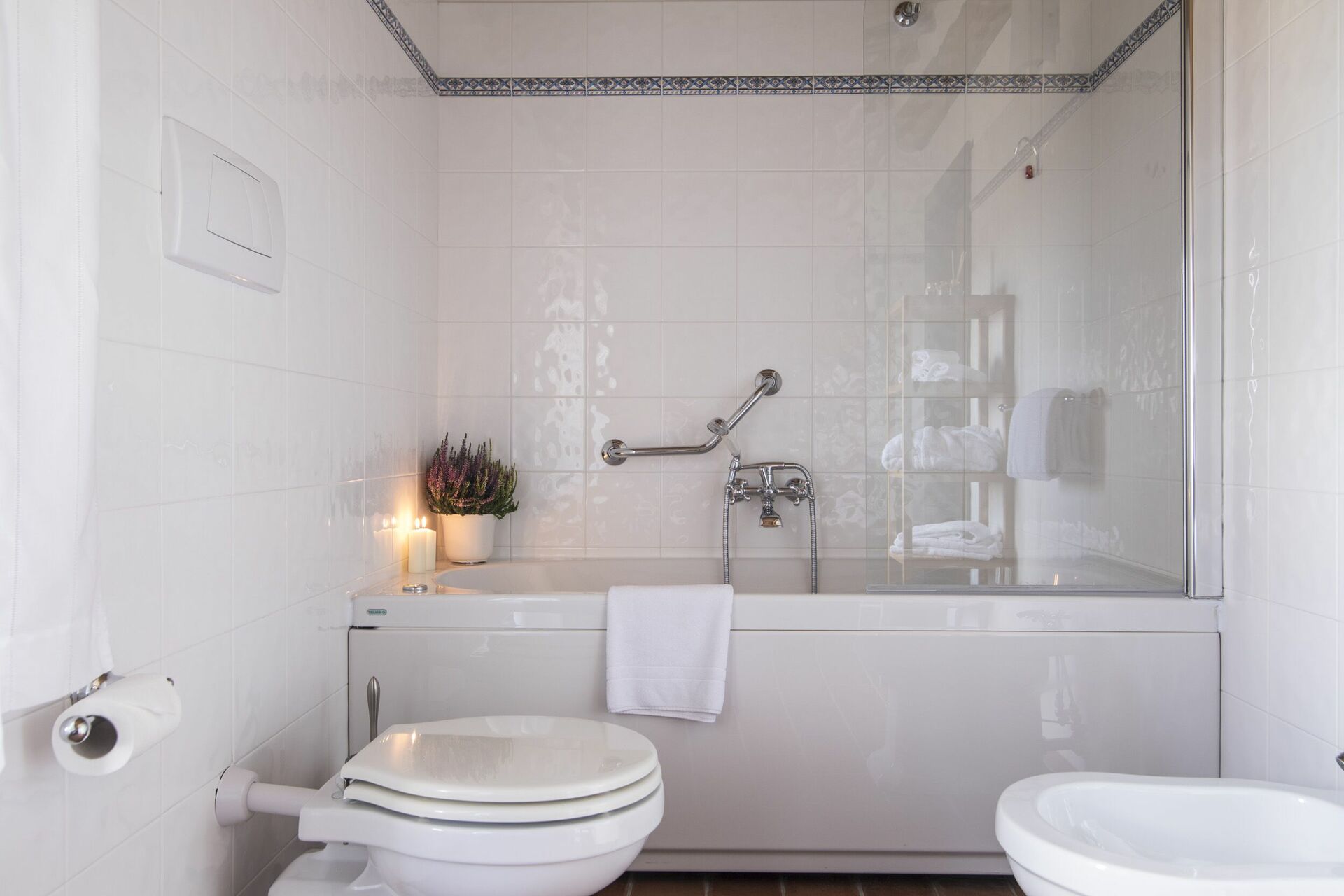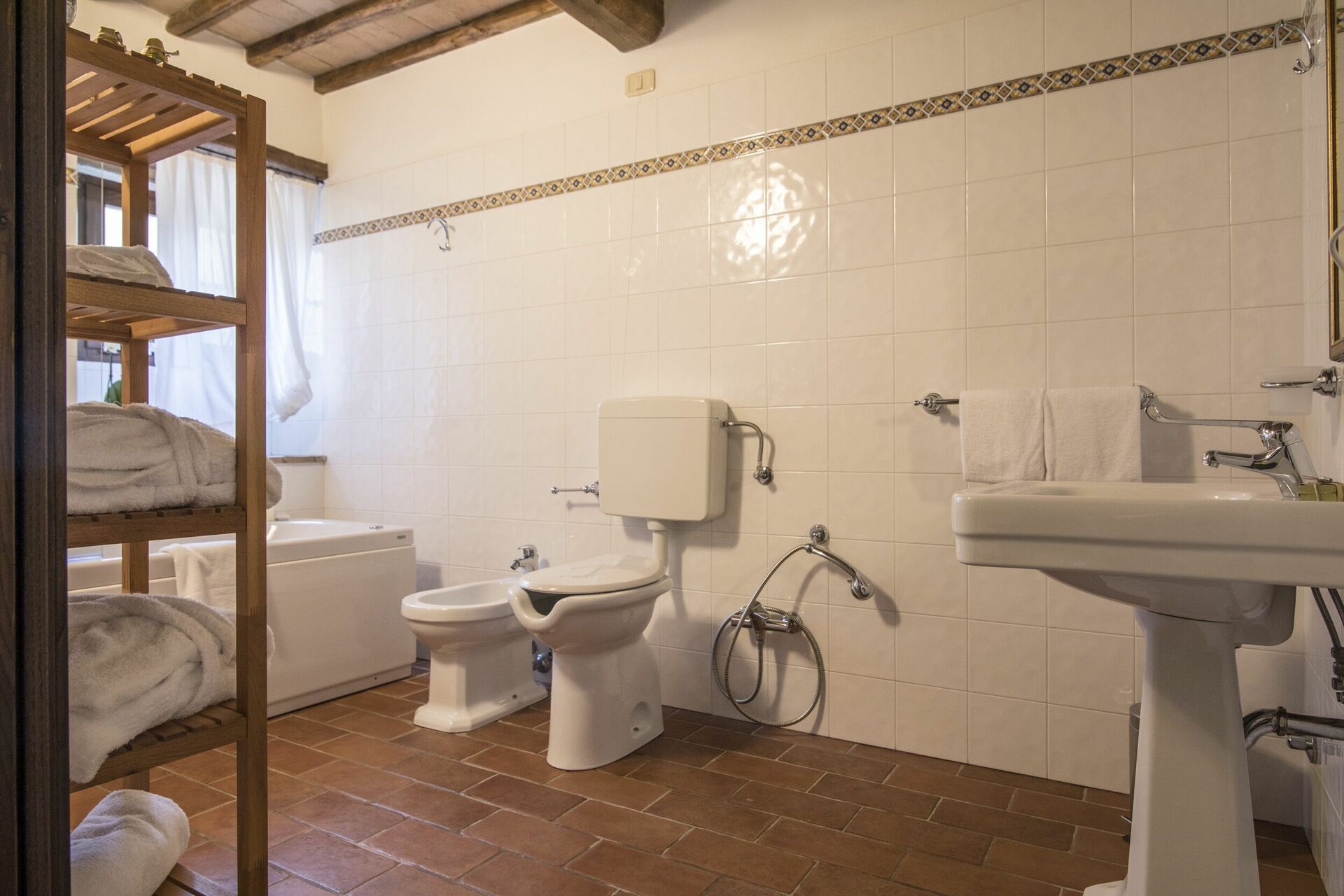 Premier étage : grand séjour double avec cheminée et accès sur l’extérieur, une chambre double avec accès sur une belle loggia et salle de bains privée avec baignoire (hydromassage), 2 chambres doubles avec salle de bains privée avec baignoire (hydromassage).