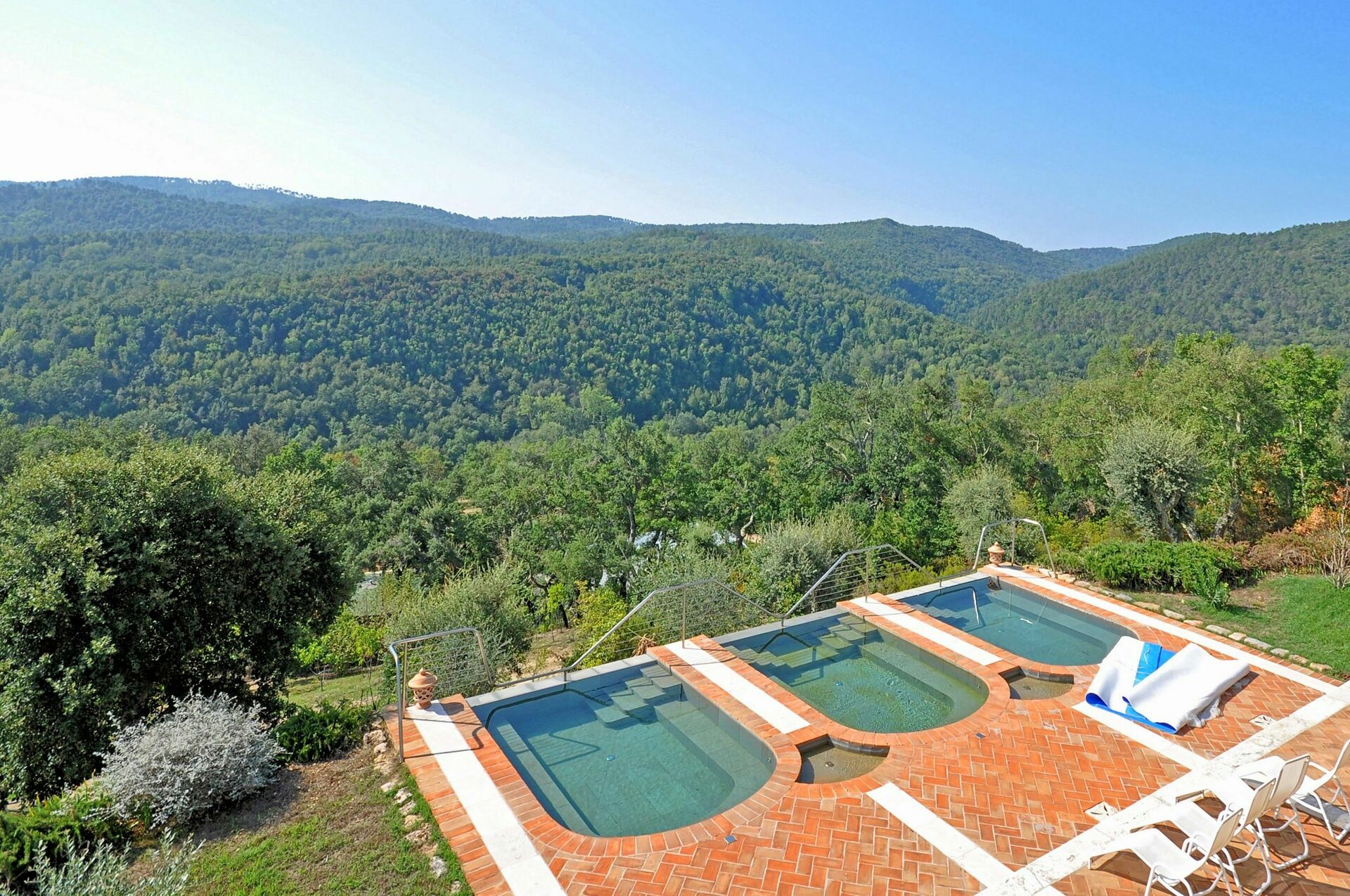 A disposition des hôtes: grand jardin (10.000m2) bien entretenu et équipé avec piscine privée (10 x 20m – prof.1,60m – ouverte du 01/05 au 30/09) avec vestiaires, douches et grande sauna. Trois vasques panoramiques avec température de l’eau différente pour qui désire faire le parcours "Caldirium, Frigidarium et Tiepidarium", sur une terrasse inférieure par rapport à la grande piscine. Air conditionné et TV-Sat dans la villa principale et les chambres à coucher. Connexion Internet Wi-Fi dans la villa (usage gratuit), jardin potager biologique.