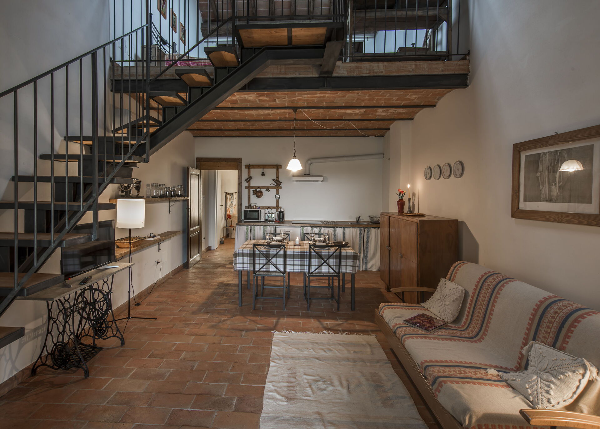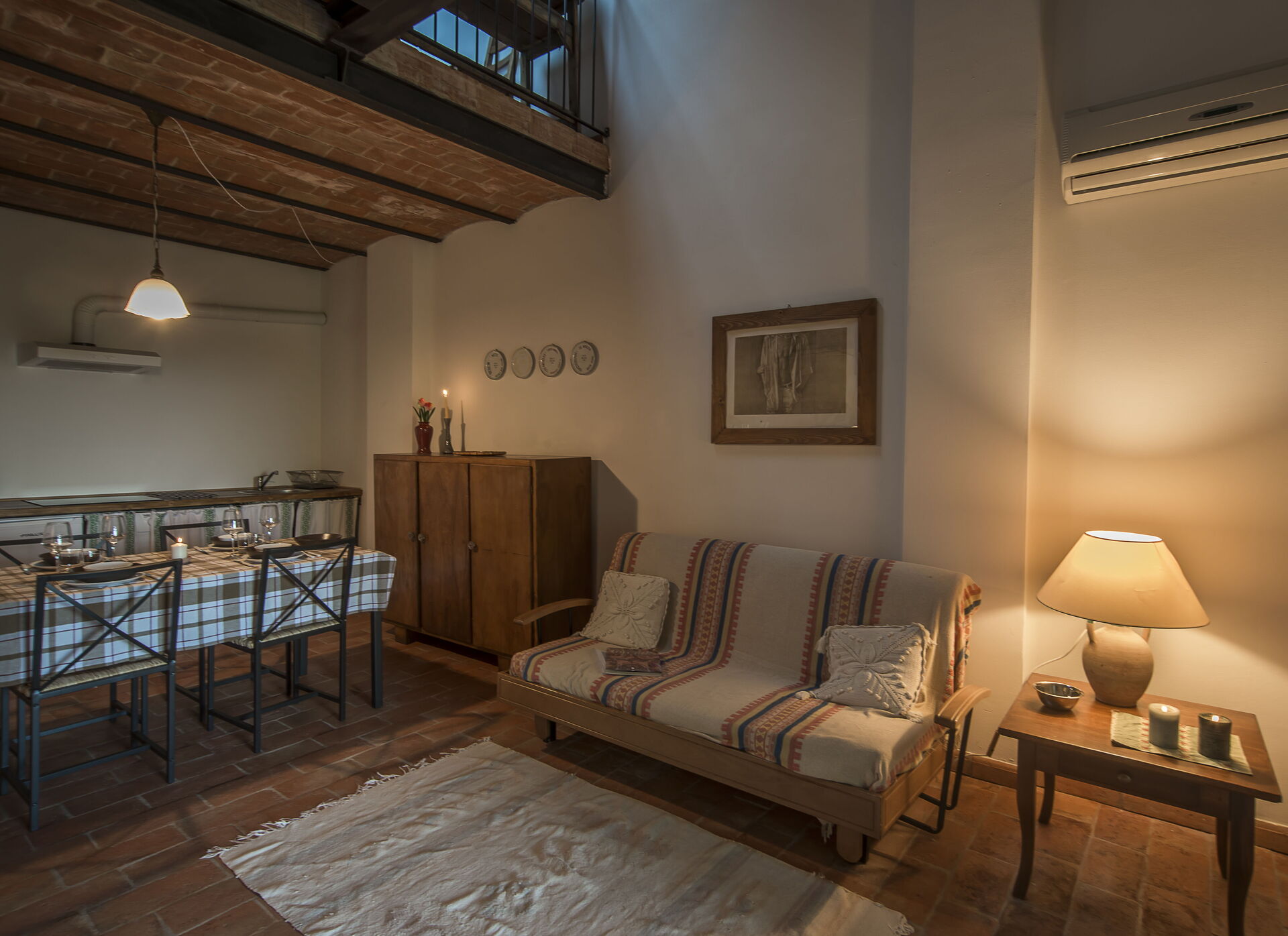 Premier étage: grand espace de vie avec salon (avec canapé-lit double supplémentaire sur demande) donnant accès à une mezzanine avec lit double (transformable en 2 lits simples sur demande) et un lit simple ainsi que salle de bain avec douche; coin repas avec cuisine (lave-vaisselle, réfrigérateur, plaque à induction, micro-ondes, machine à café, ventilateur), chambre double, salle de bain avec douche.