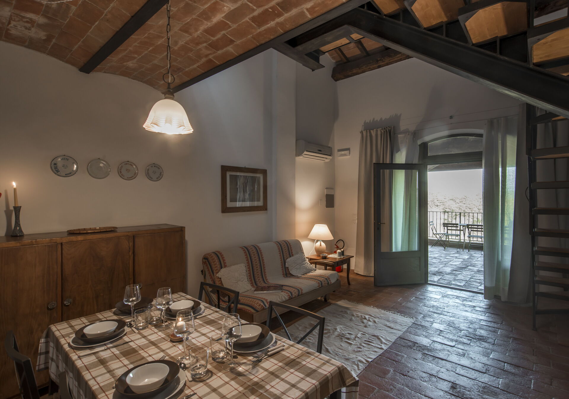 Espace extérieur privé sous une loggia équipée avec table et chaises.