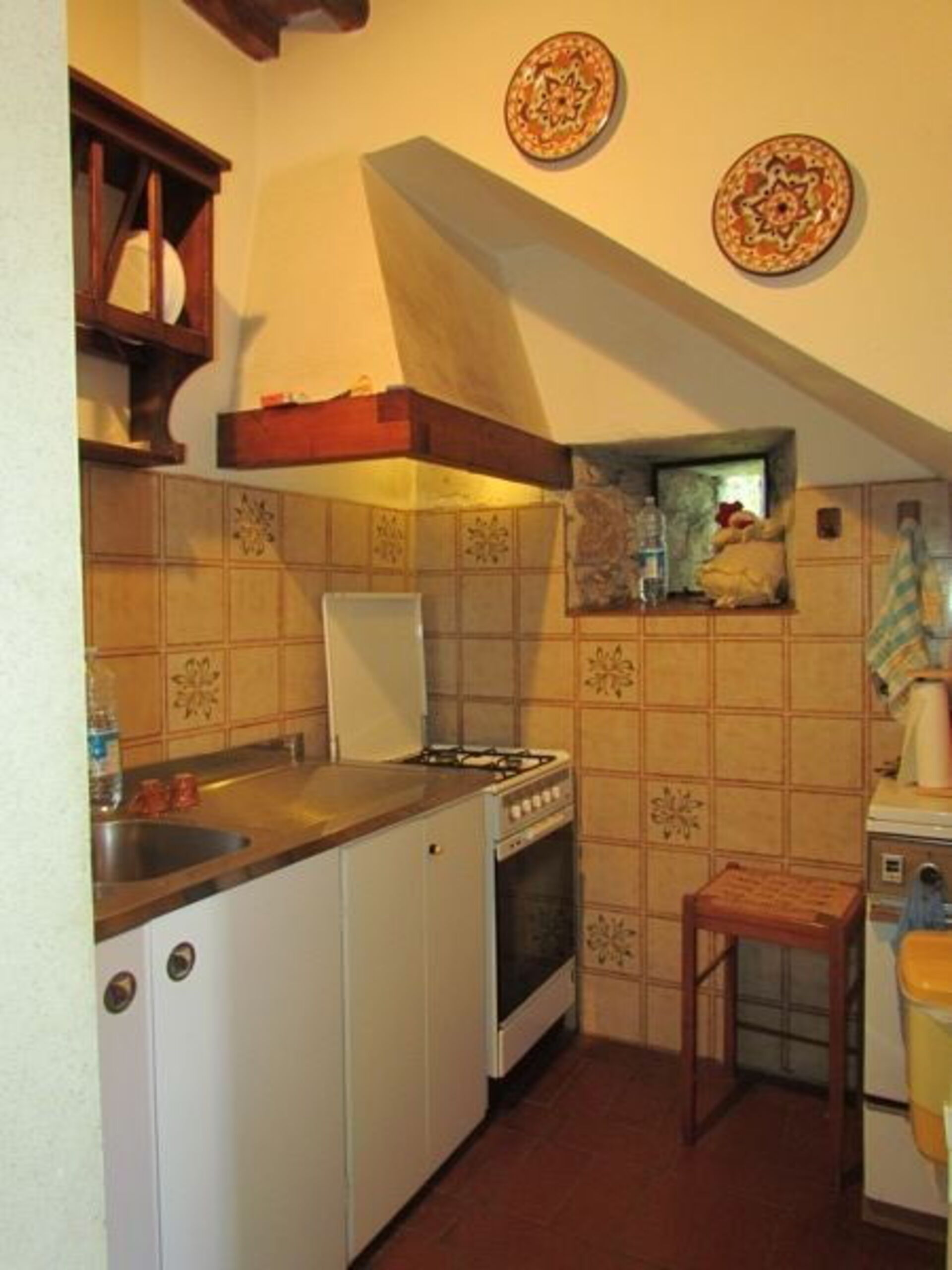 1st entrance living room with stove and entrance to the courtyard inside the Castle. Dinning table, TV, little kitchen.