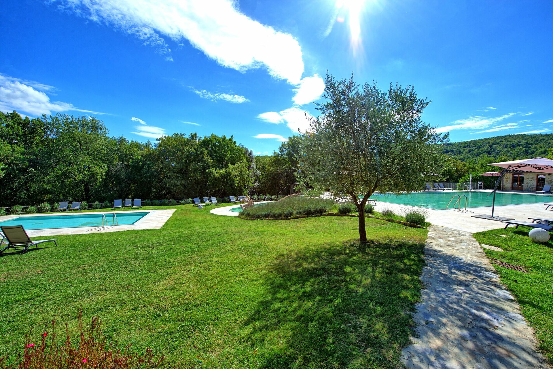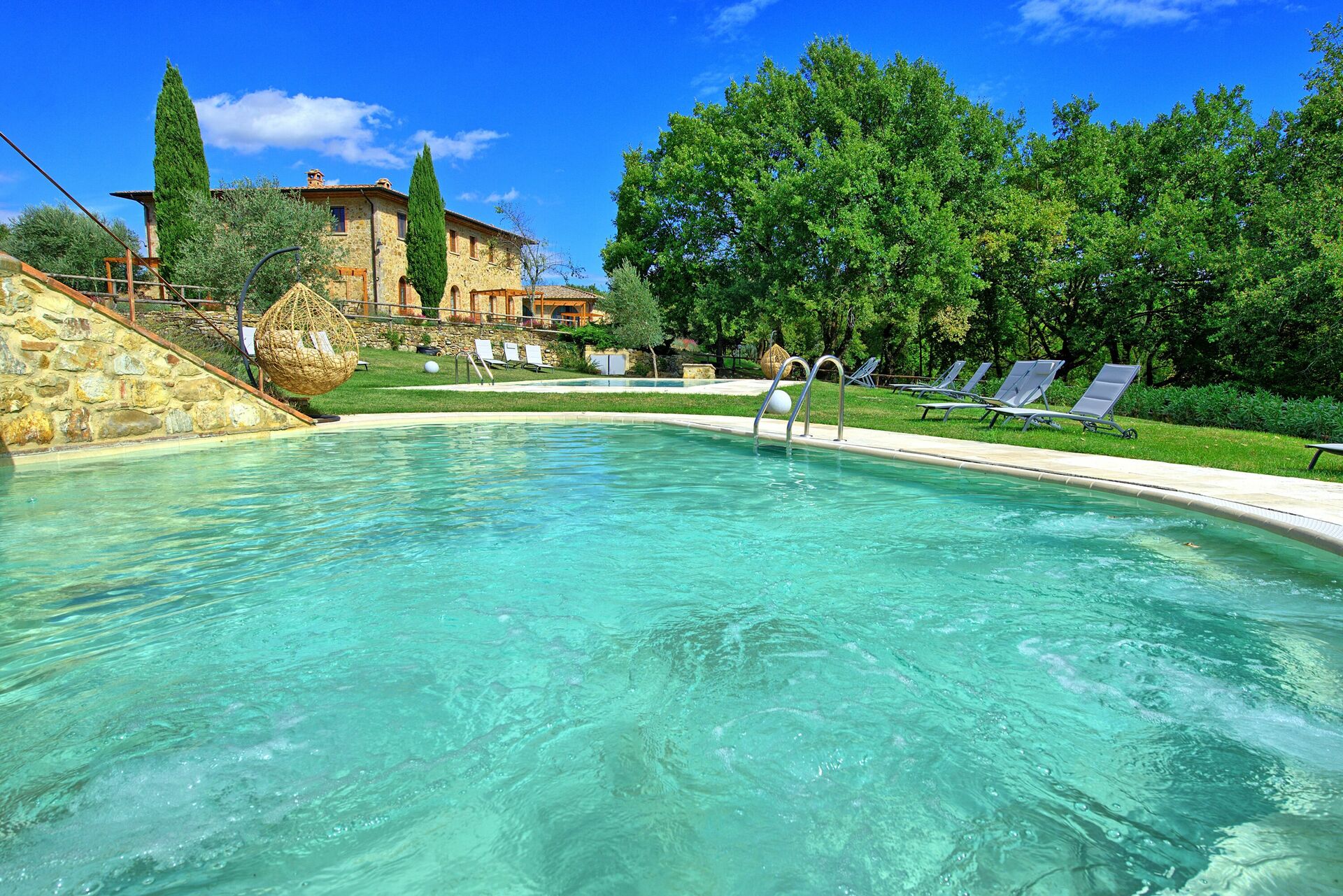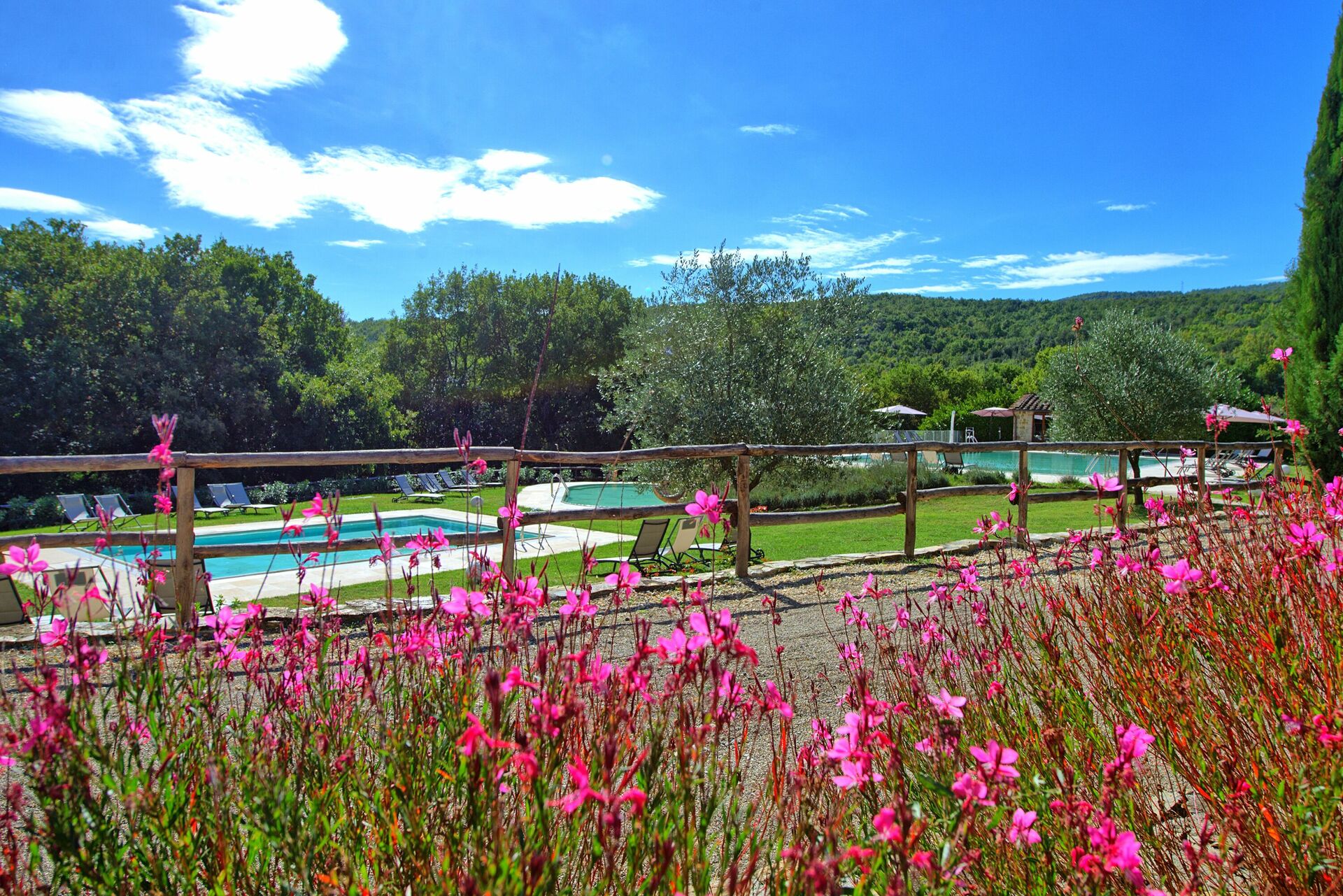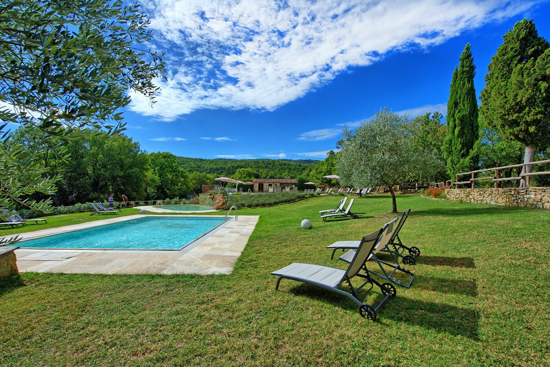 Un vaste jardin est à la disposition des clients. Trois piscines peuvent être utilisées, une plus grande pour la baignade, une plus petite pour les enfants et une autre avec des jets hydromassants pour se détendre avec une vue magnifique sur la campagne.