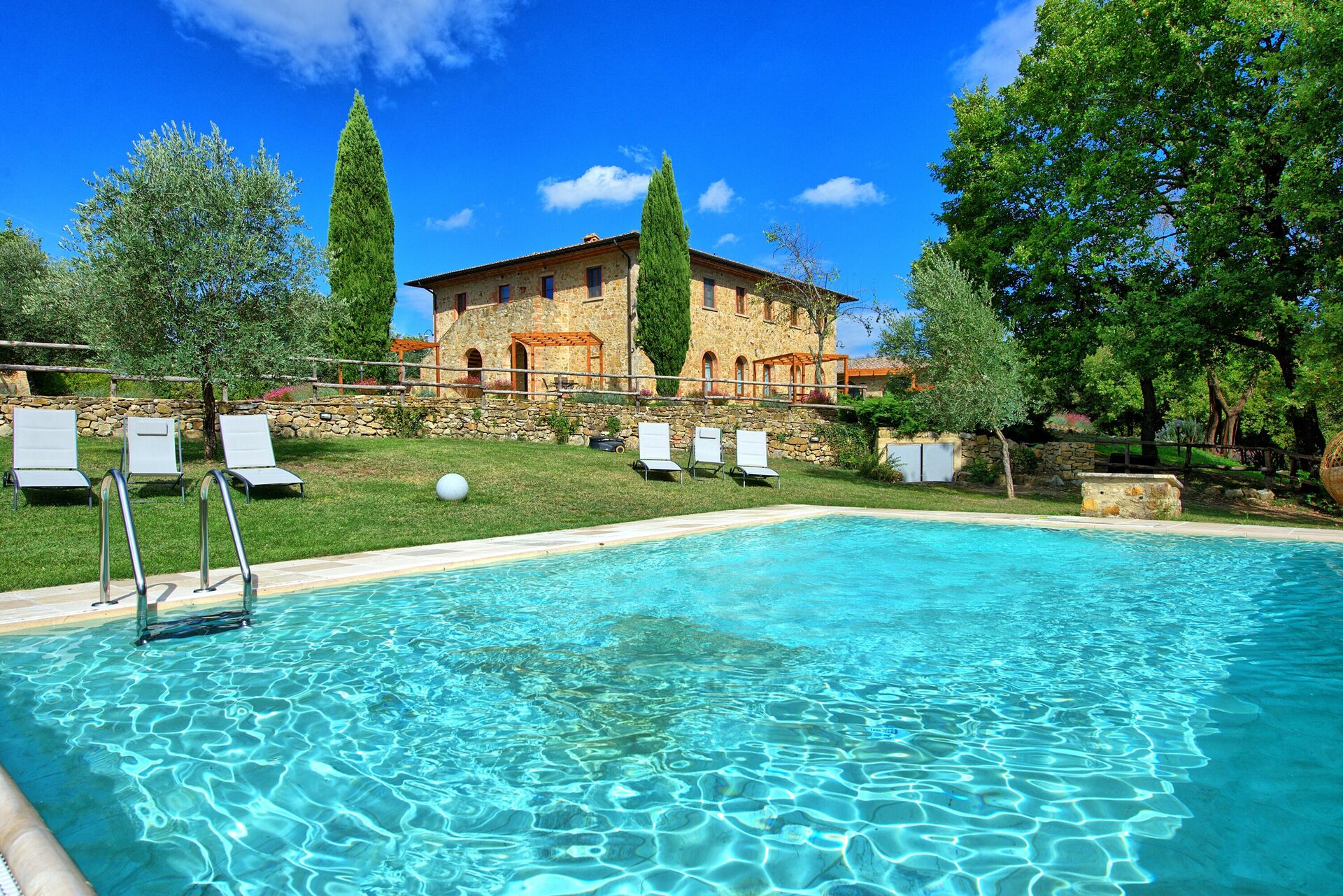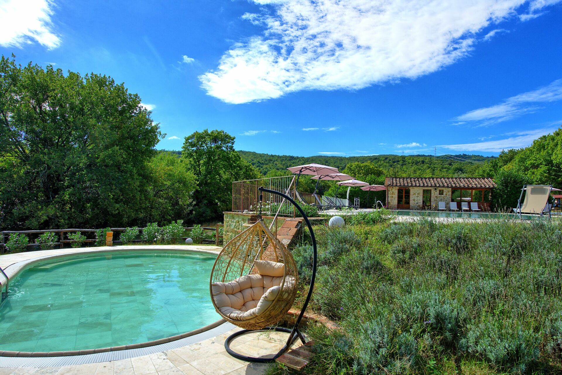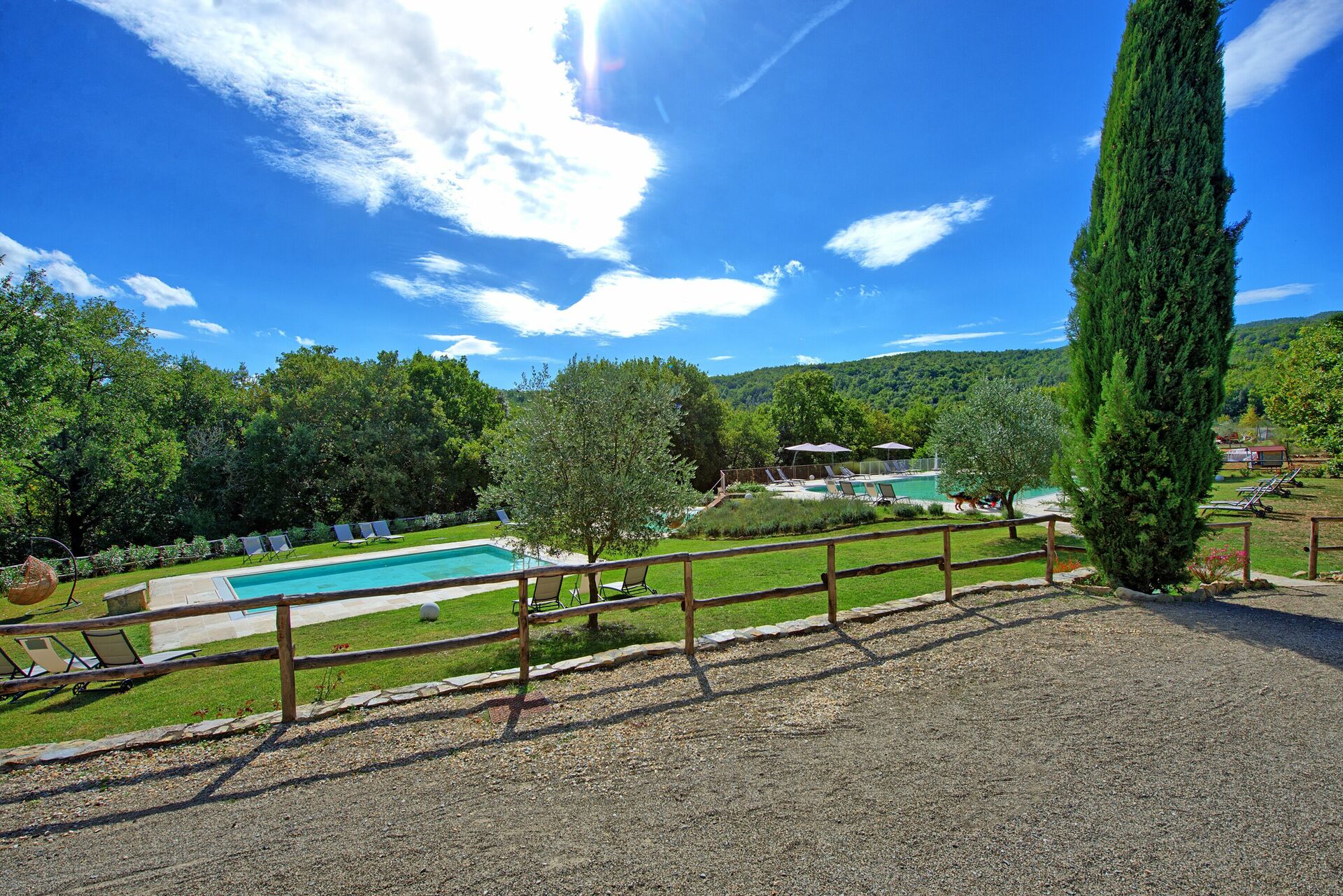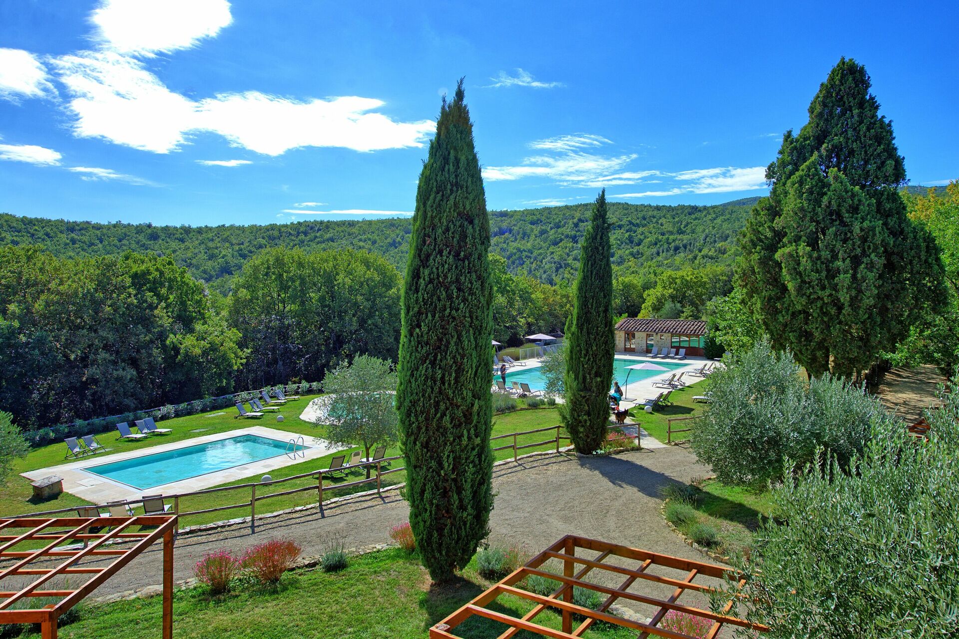 Un vaste jardin est à la disposition des clients. Trois piscines peuvent être utilisées, une plus grande pour la baignade, une plus petite pour les enfants et une autre avec des jets hydromassants pour se détendre avec une vue magnifique sur la campagne.