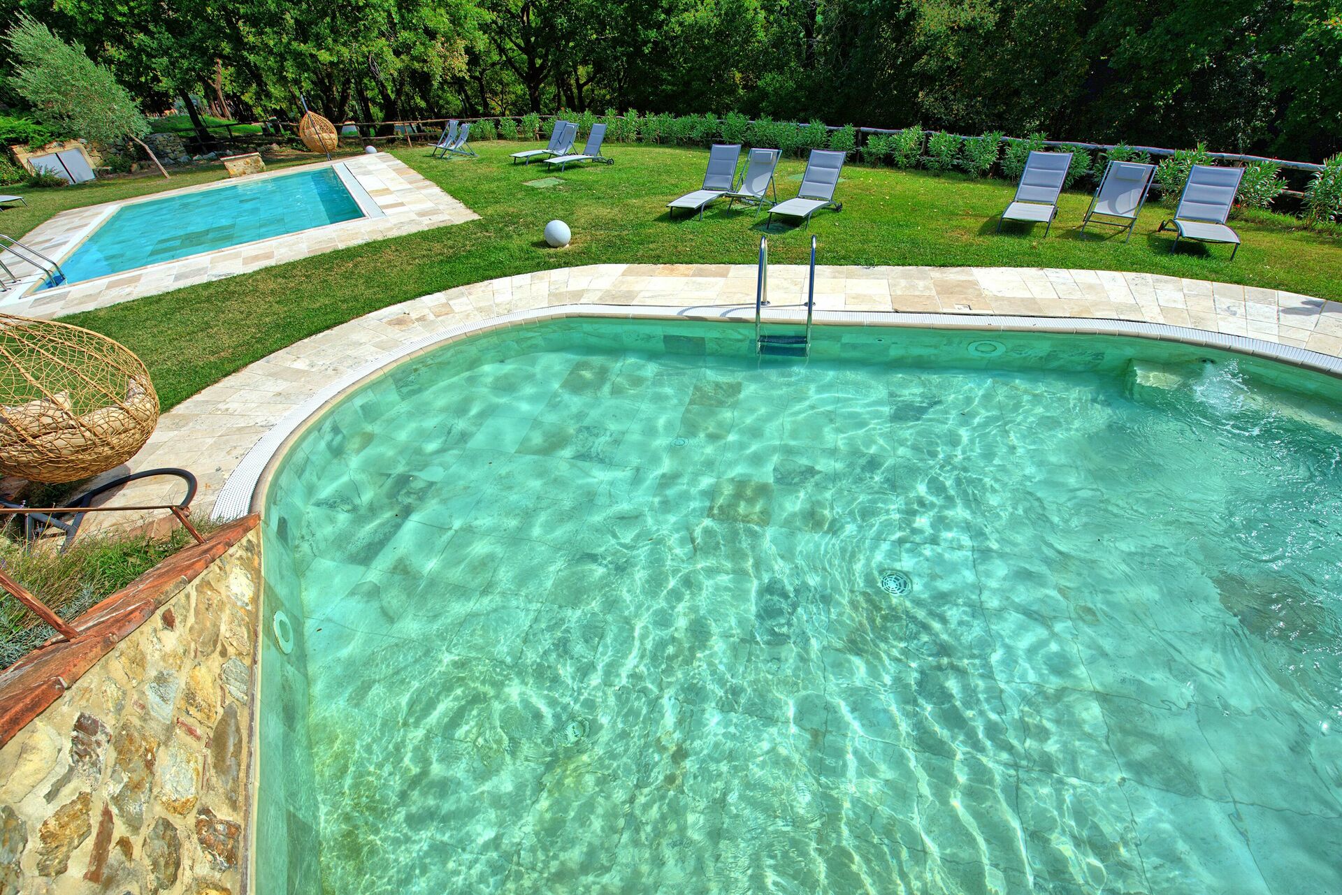 - trois piscines: une très grande (20 x 10 m - profondeur maximale de 1,4 m), une plus petite (10 x 5 m - profondeur maximale de 1 m) et une autre plus petite avec un coin doté d’un système d’hydromassage (8 x 5 m - profondeur maximale 1 m)