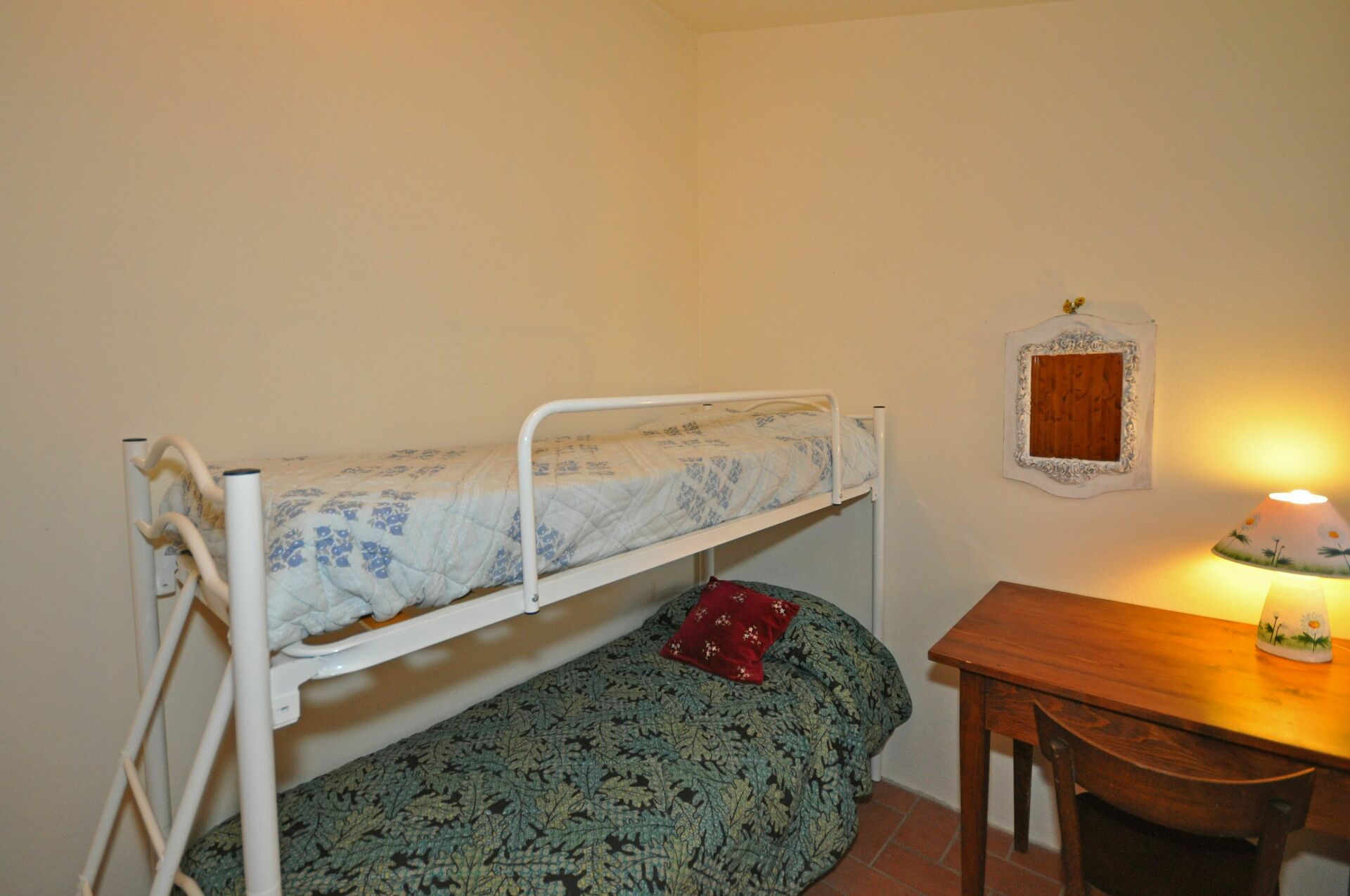 Rez-de-chaussée: entrée sur cuisine (air conditionné, four, freezer, lave-vaisselle), une chambre avec 2 lits à une place superposés.