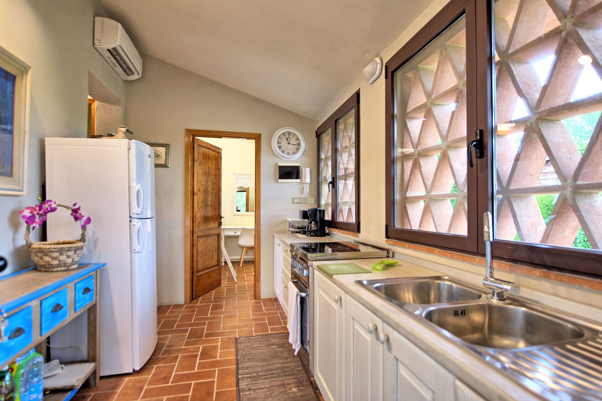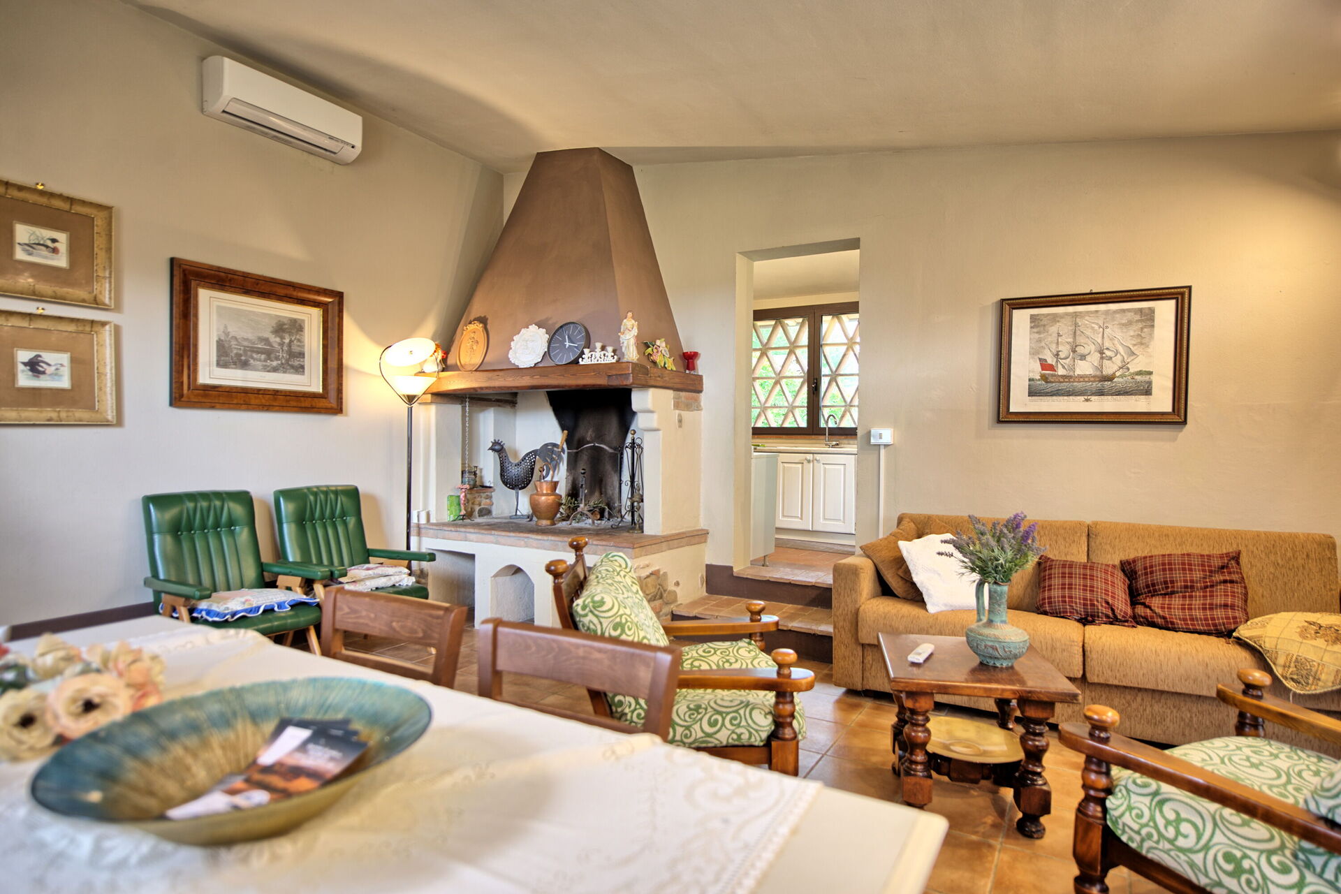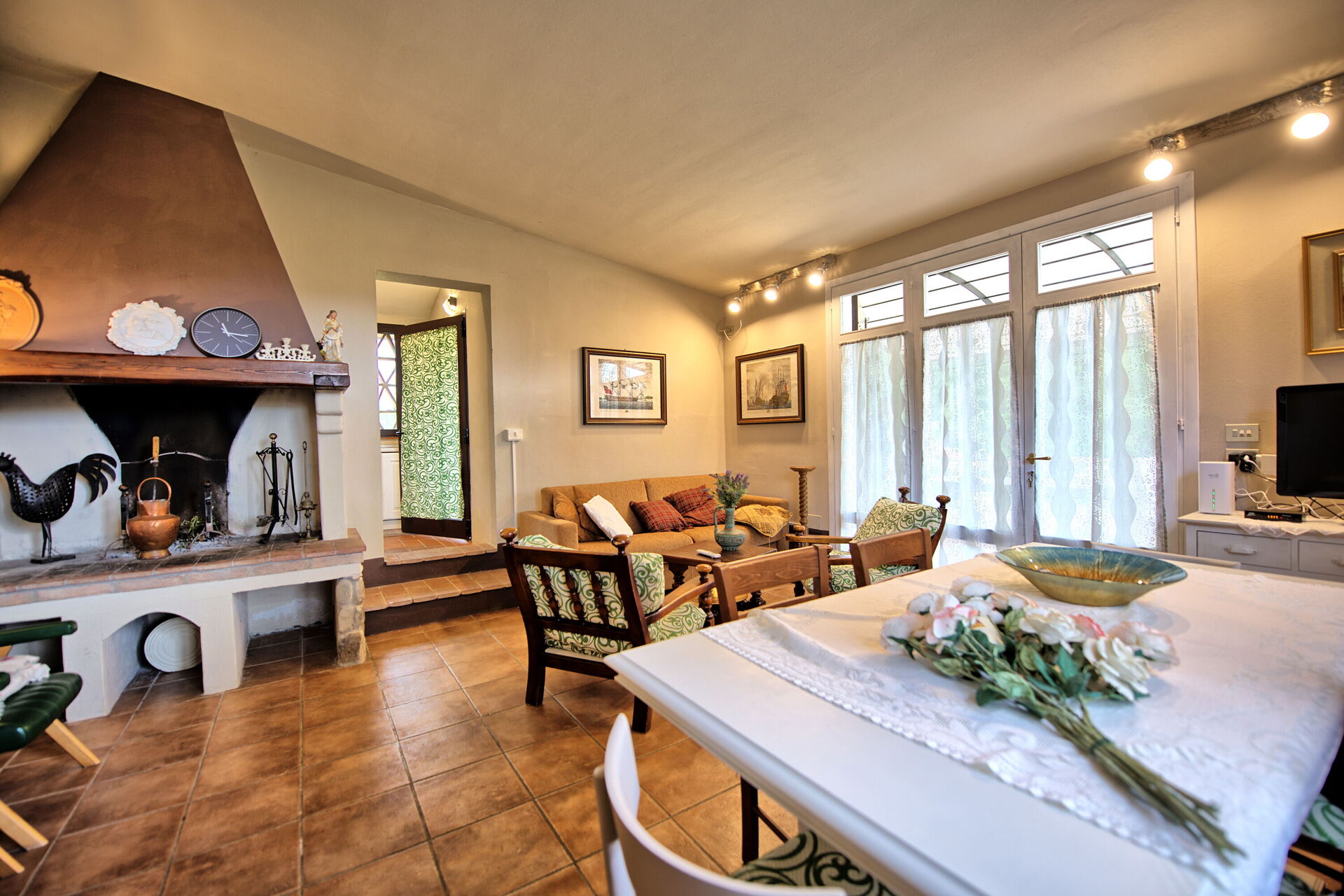 2 marches plus bas (de la cuisine ou de la chambre double): séjour/salle à manger (air conditionné, TV) avec fauteuils, cheminée et accès sur l’extérieur.