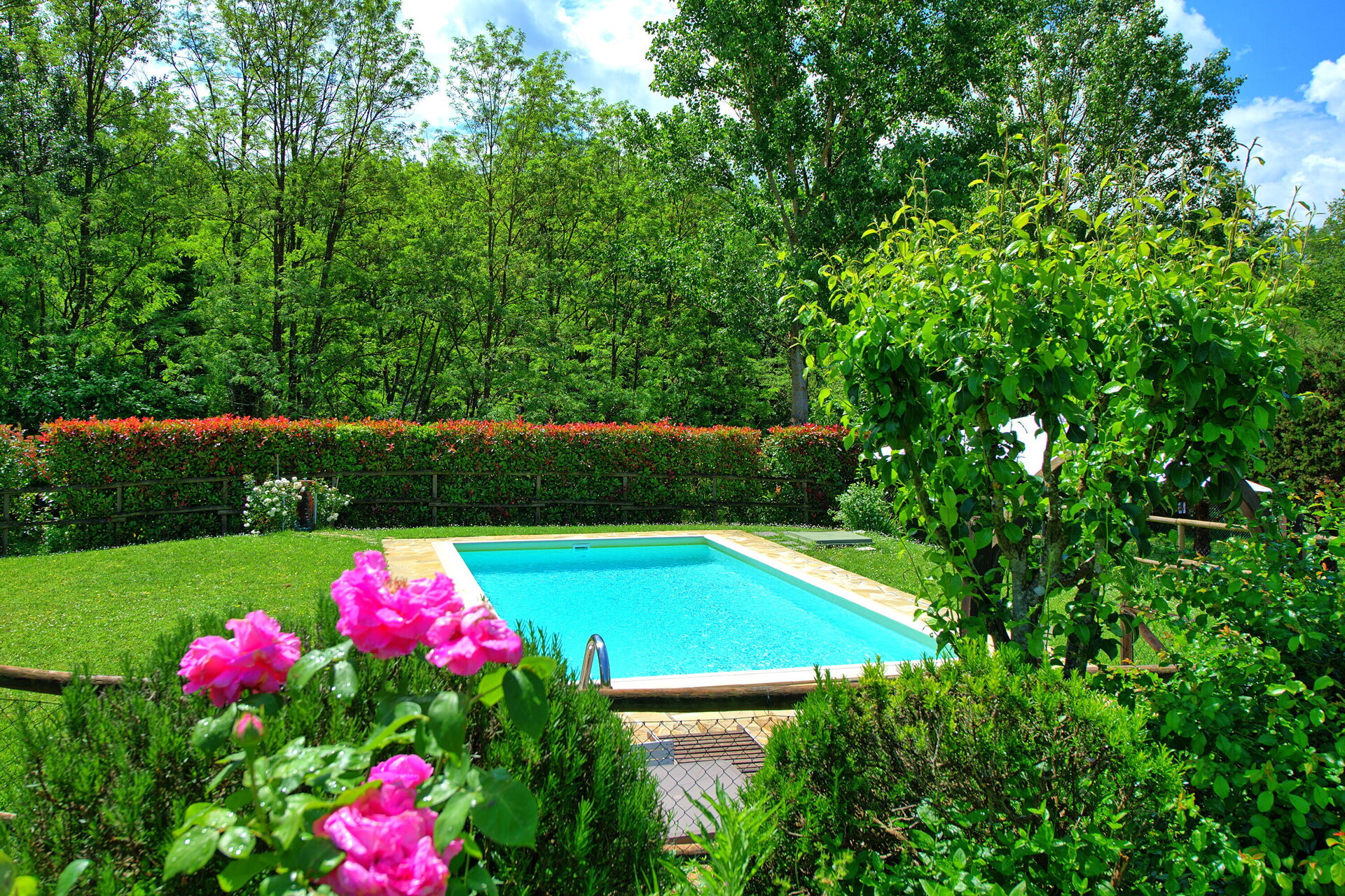 A disposition des hôtes: grand jardin (environ 10.000,00m2), piscine privée et clôturée (4,40 x 8m – prof.: 0,90 - 1,80 m – ouverte du 01/05 au 30/09), espace extérieur équipé avec table, chaises et barbecue en maçonnerie. La propriété est clôturée seulement coté route. Parking dans la propriété.