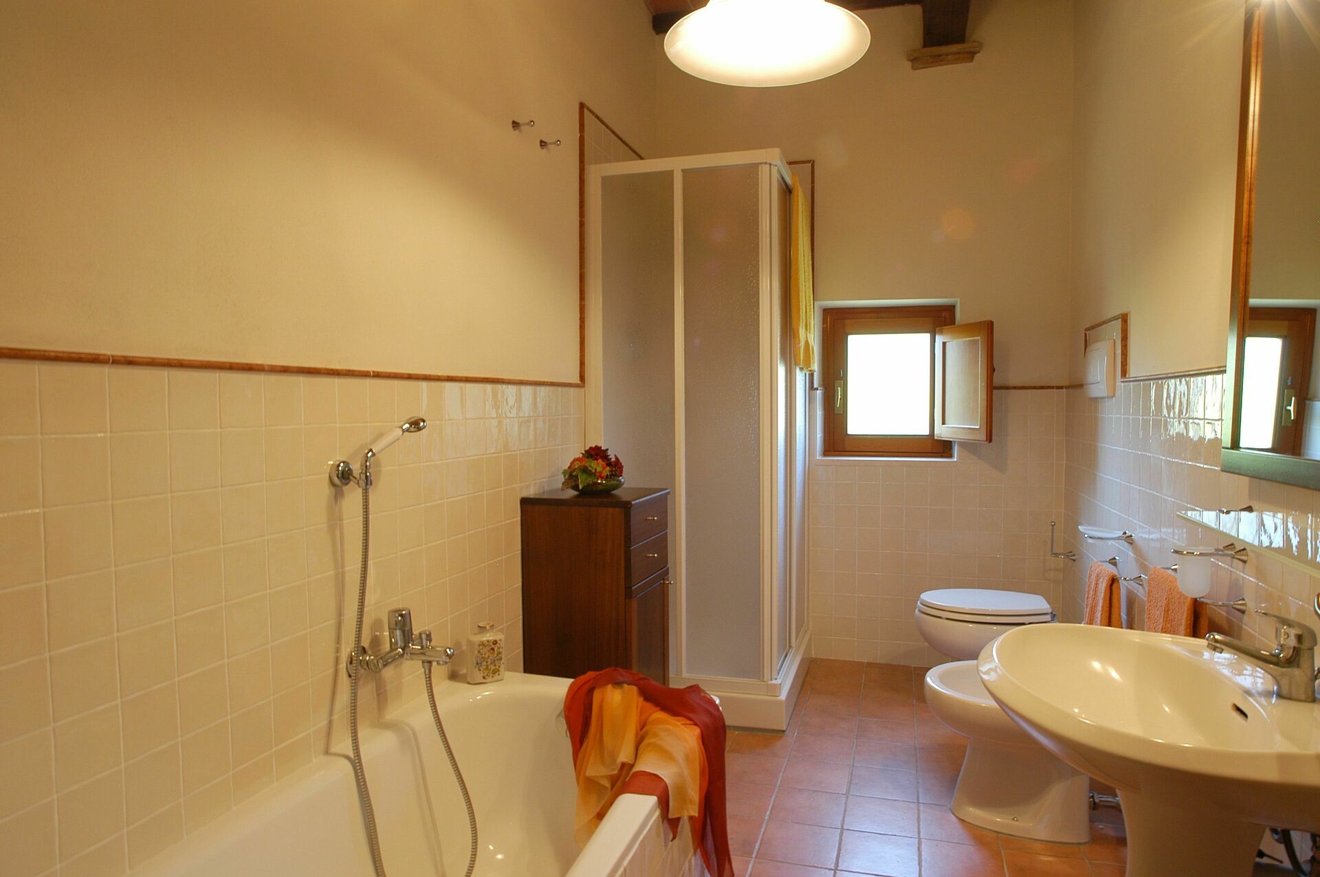 Premier étage : une chambre double avec salle de bains privée avec douche et baignoire.