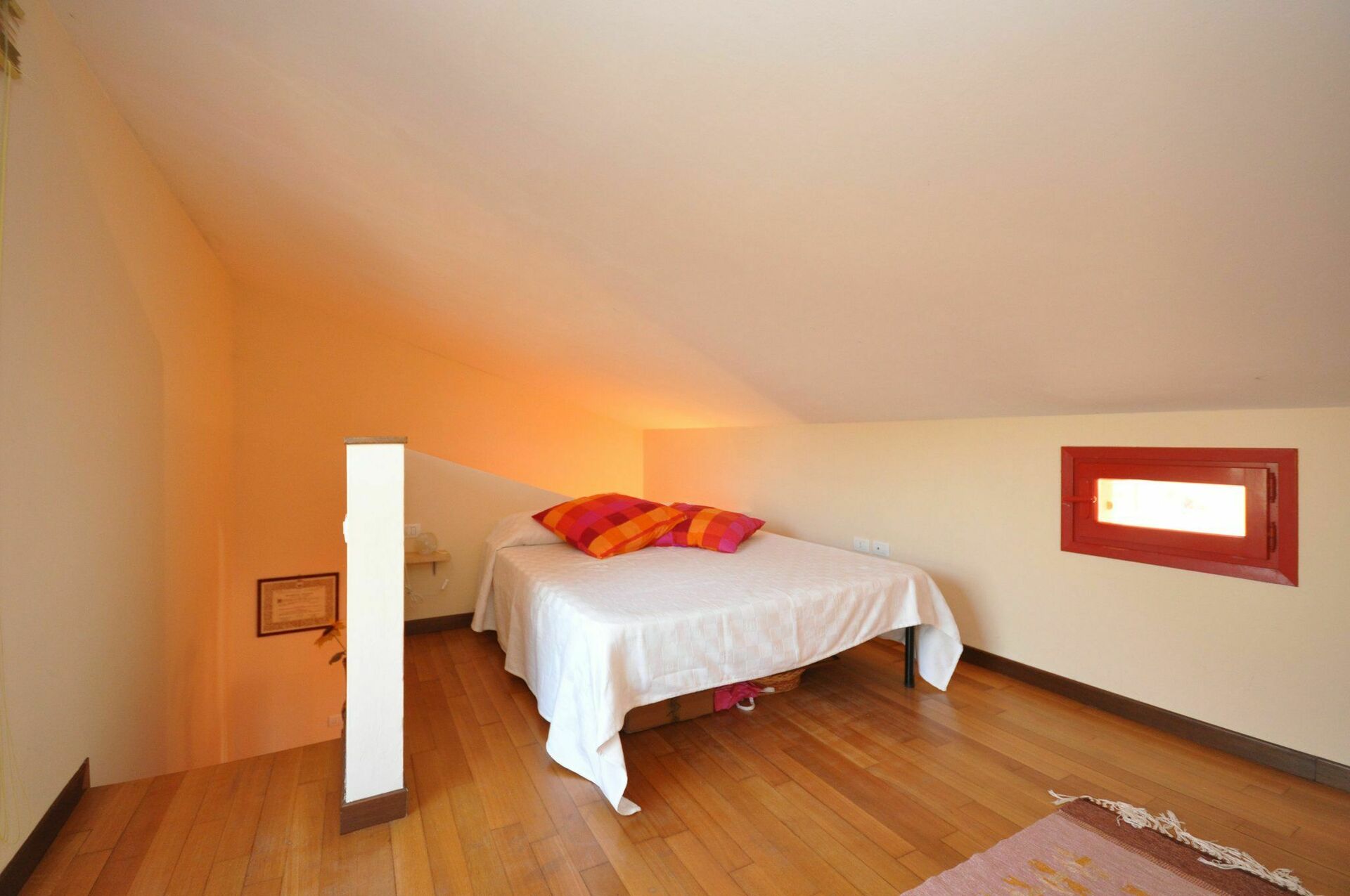 Premier étage (accès par escaliers du séjour) une chambre double (hauteur min. :1,20m) sans porte et en partie ouverte côté escaliers.