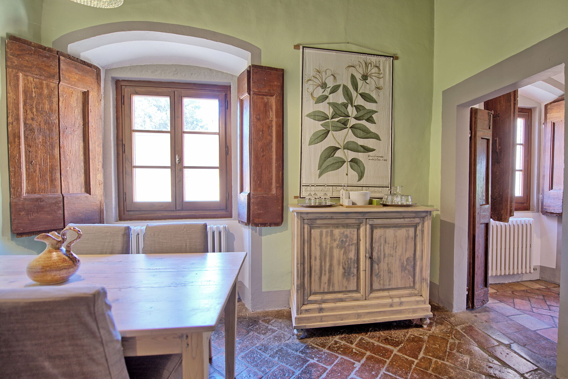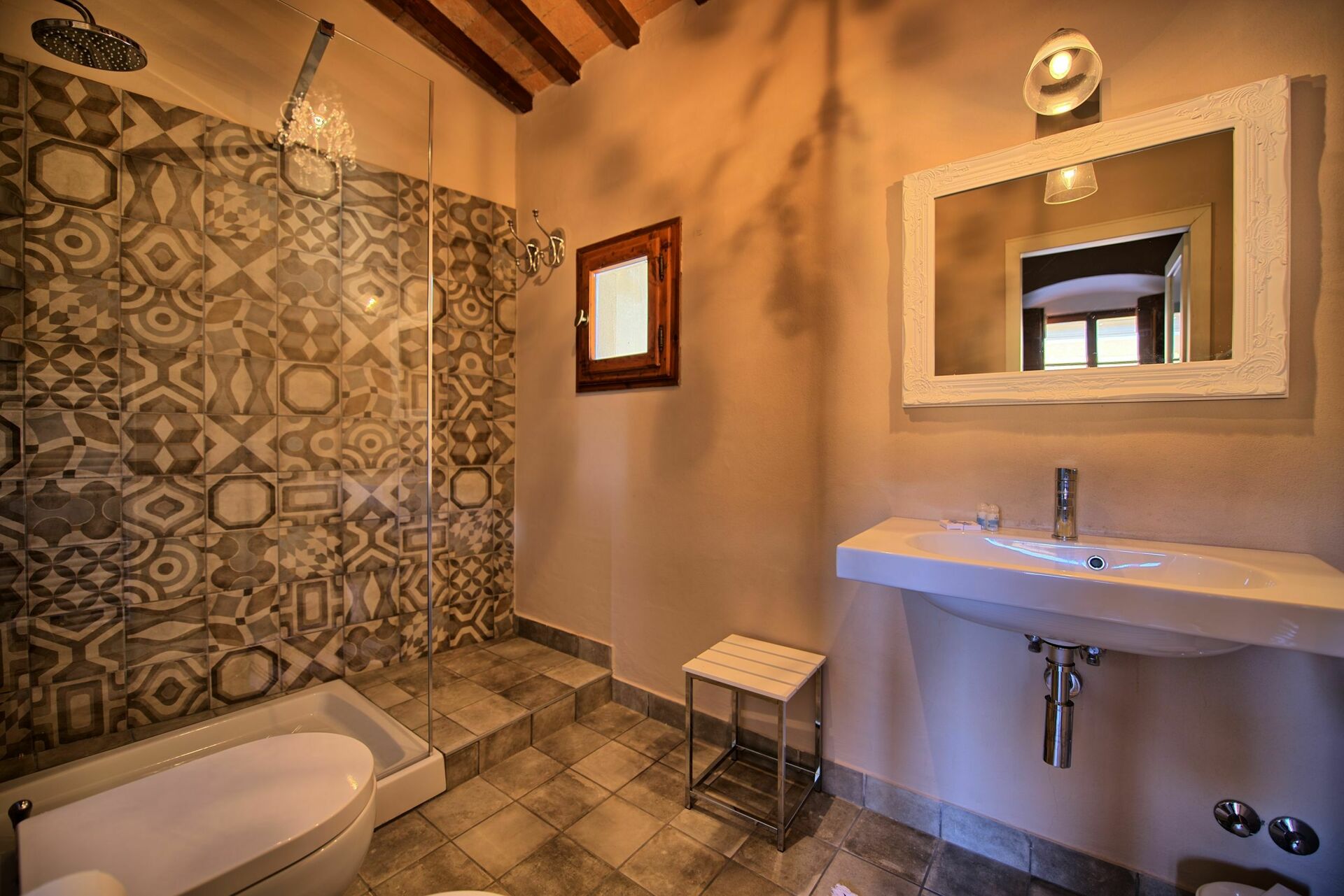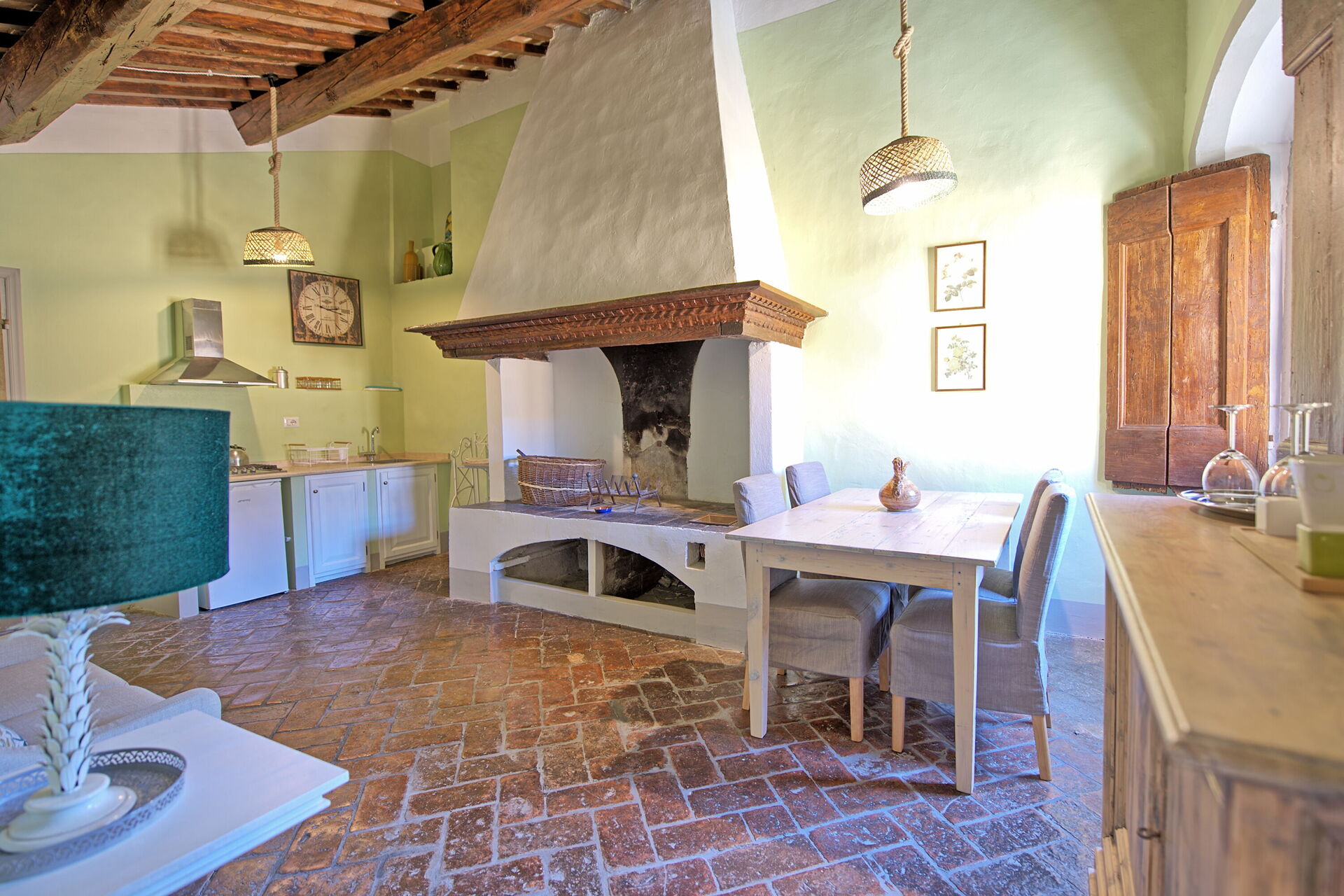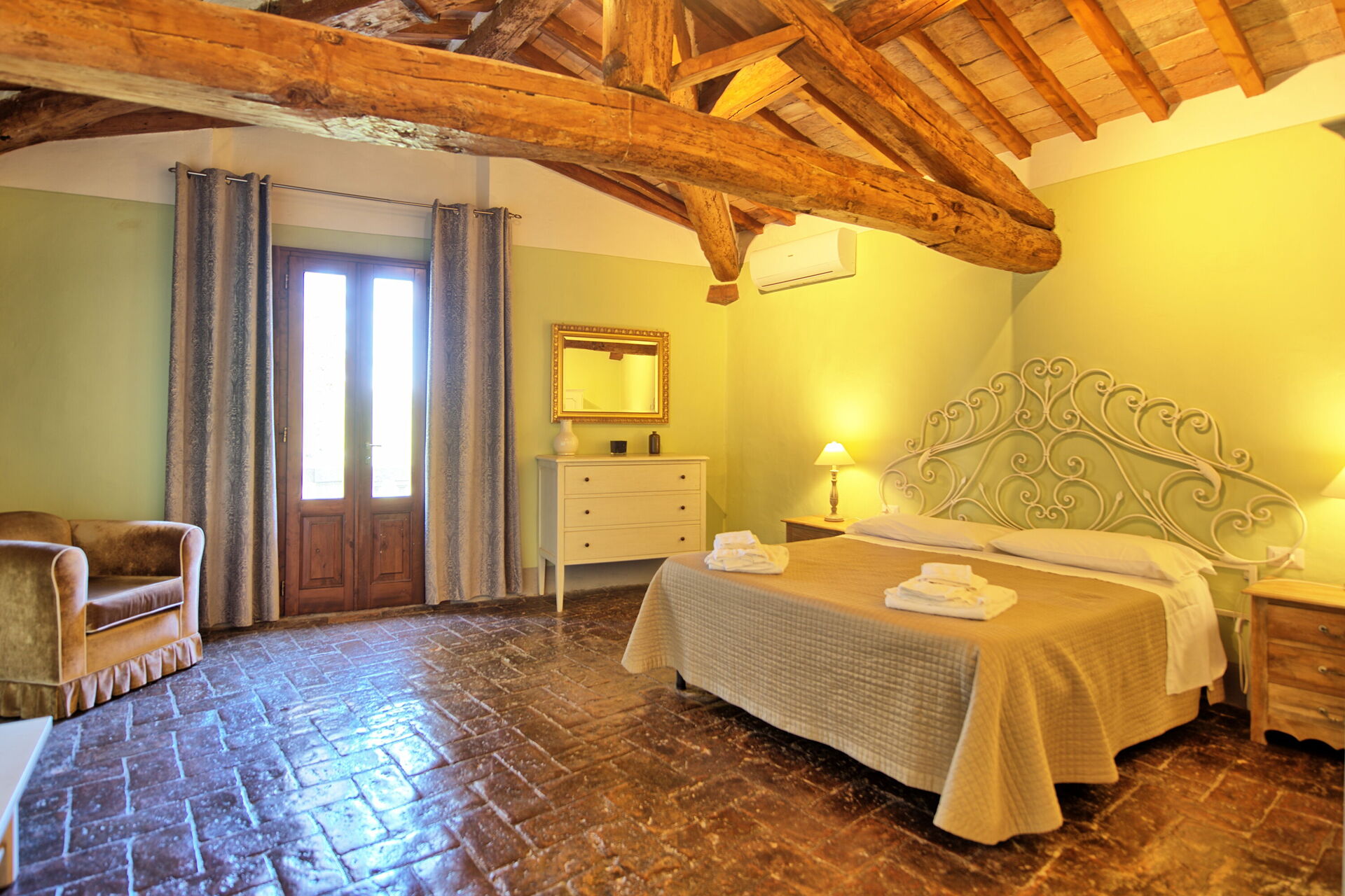 I knew we were staying in a castle but I was pleasantly surprised with how nice and large the rooms are. We had room 29 and the entry was into the kitchenette and sitting area with a large dining table. The bathroom was beautiful and very nicely updated. the beams in the main bedroom were absolutely stunning and then to walk out on the terrace overlooking the pool and gardens were so serene. We will definitely be back, such a wonderful experience at Montegufoni!!!
