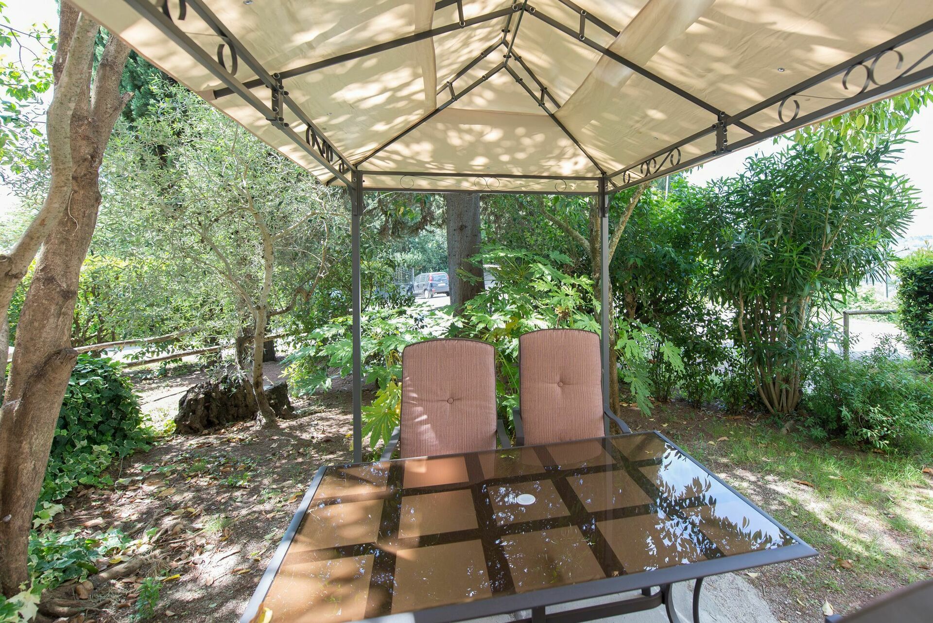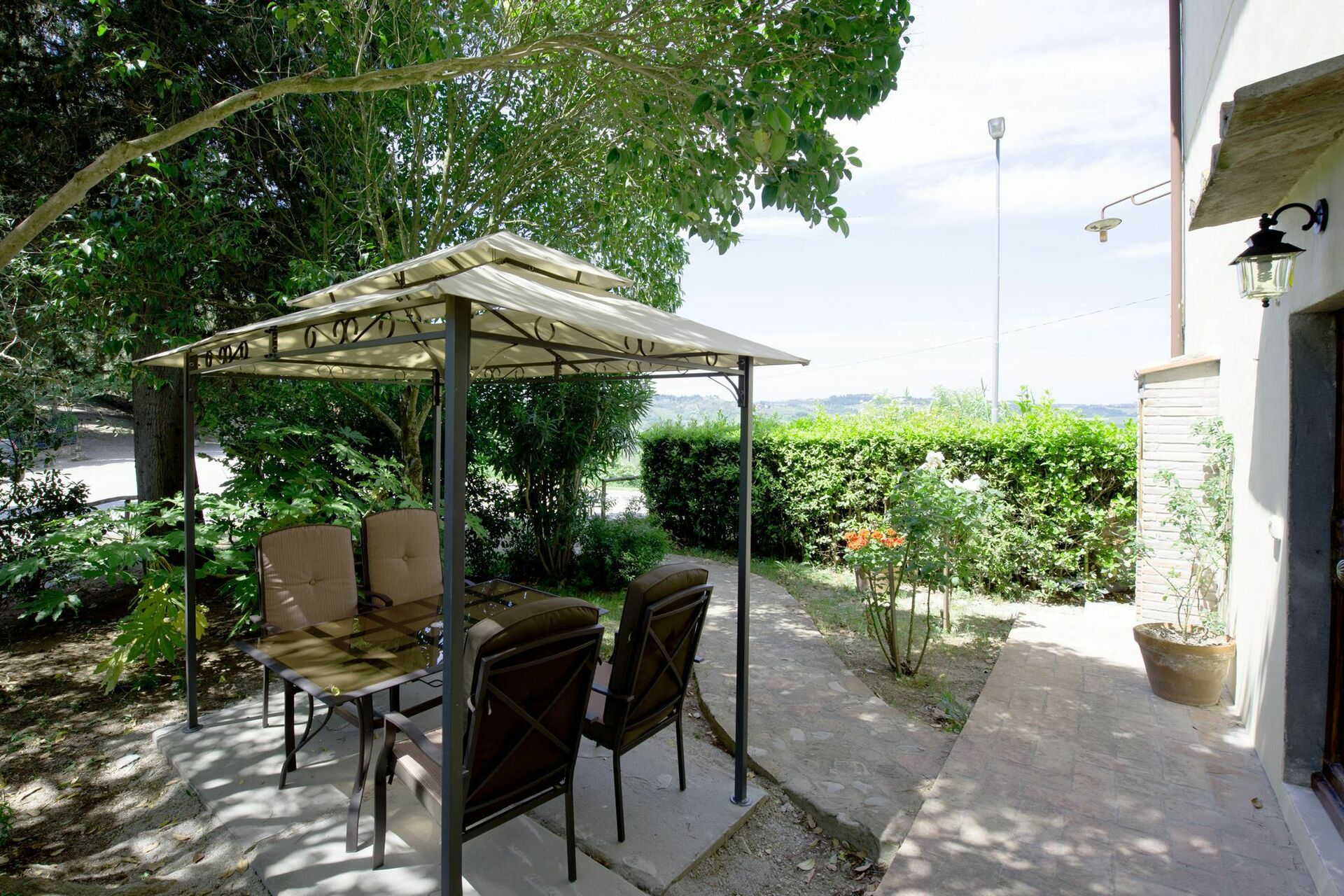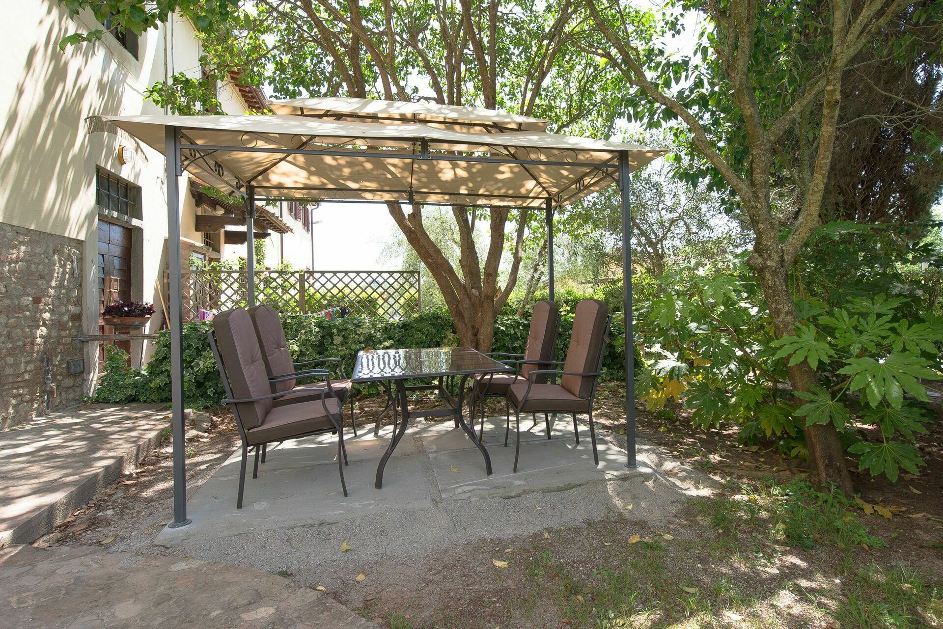 Espace extérieur privé et équipé avec pavillon, table et chaises.