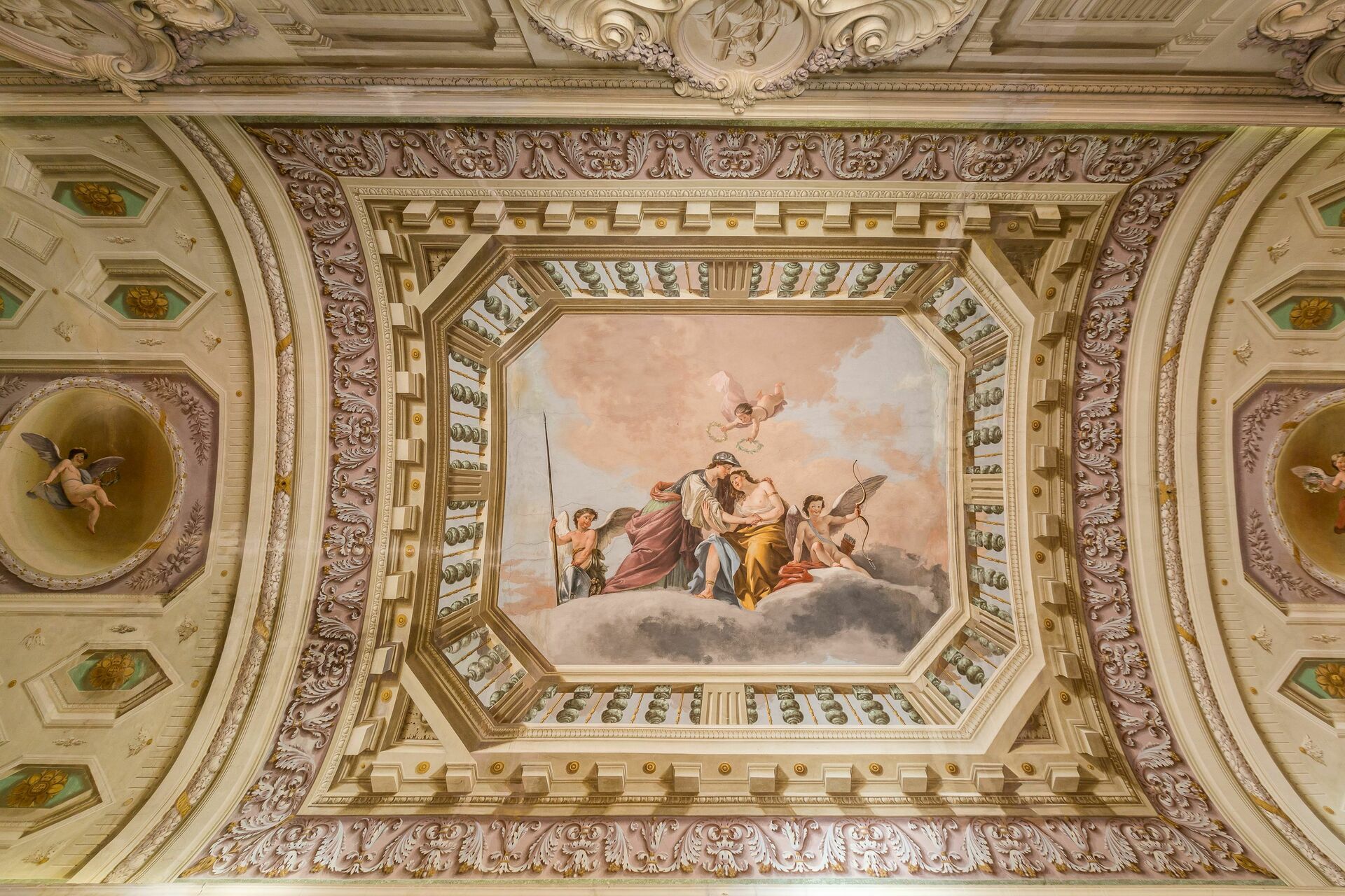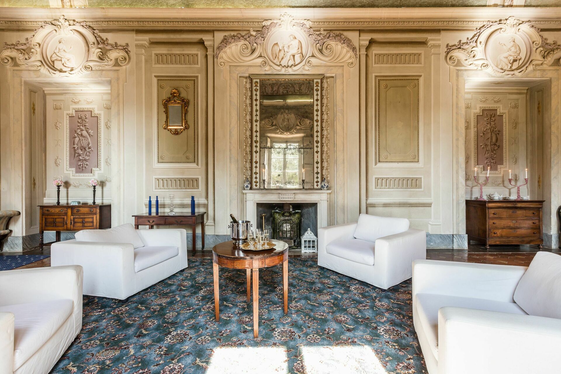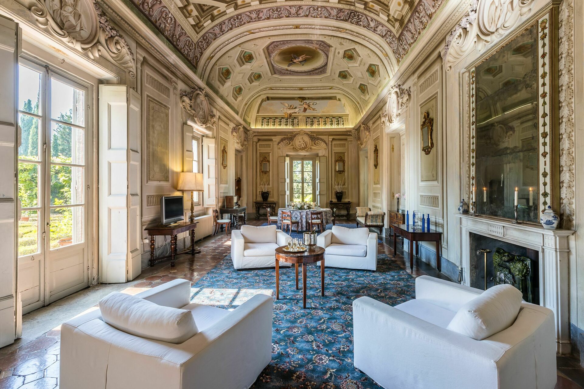 Rez-de-chaussée: spacieuse pièce d’entrée jadis utilisée comme salle d’armes, très grand et clair salon avec plafonds décorés de fresques, cheminée (qui ne peut pas être utilisée) décorée avec de fresques par Pucci au 18ème siècle et accès au jardin à l’italienne par 6 grandes portes-fenêtres, salle de bains avec douche.
