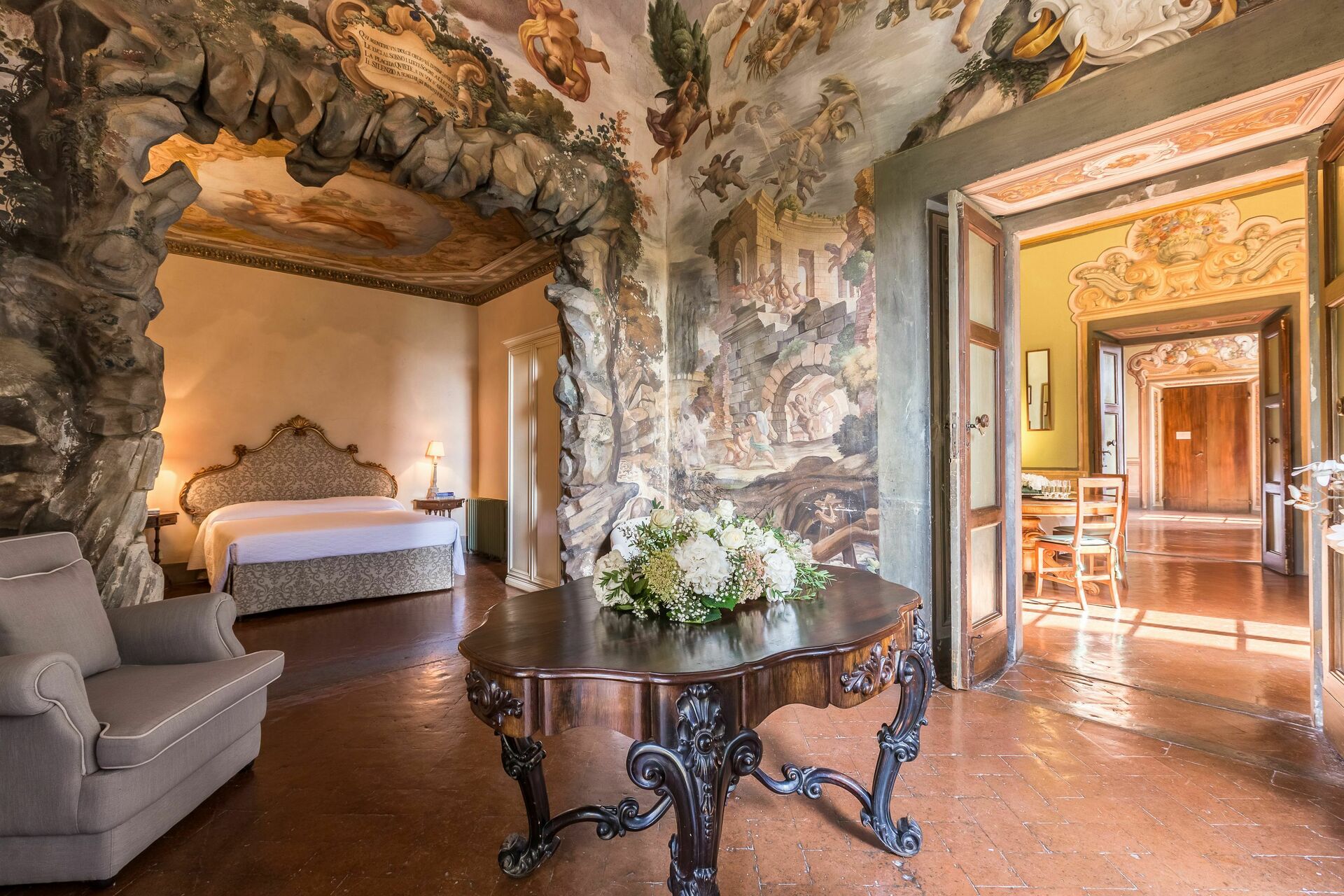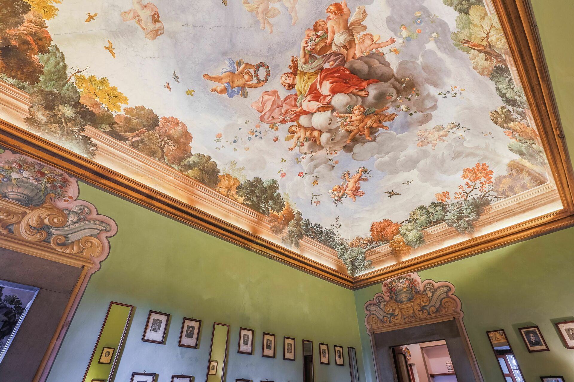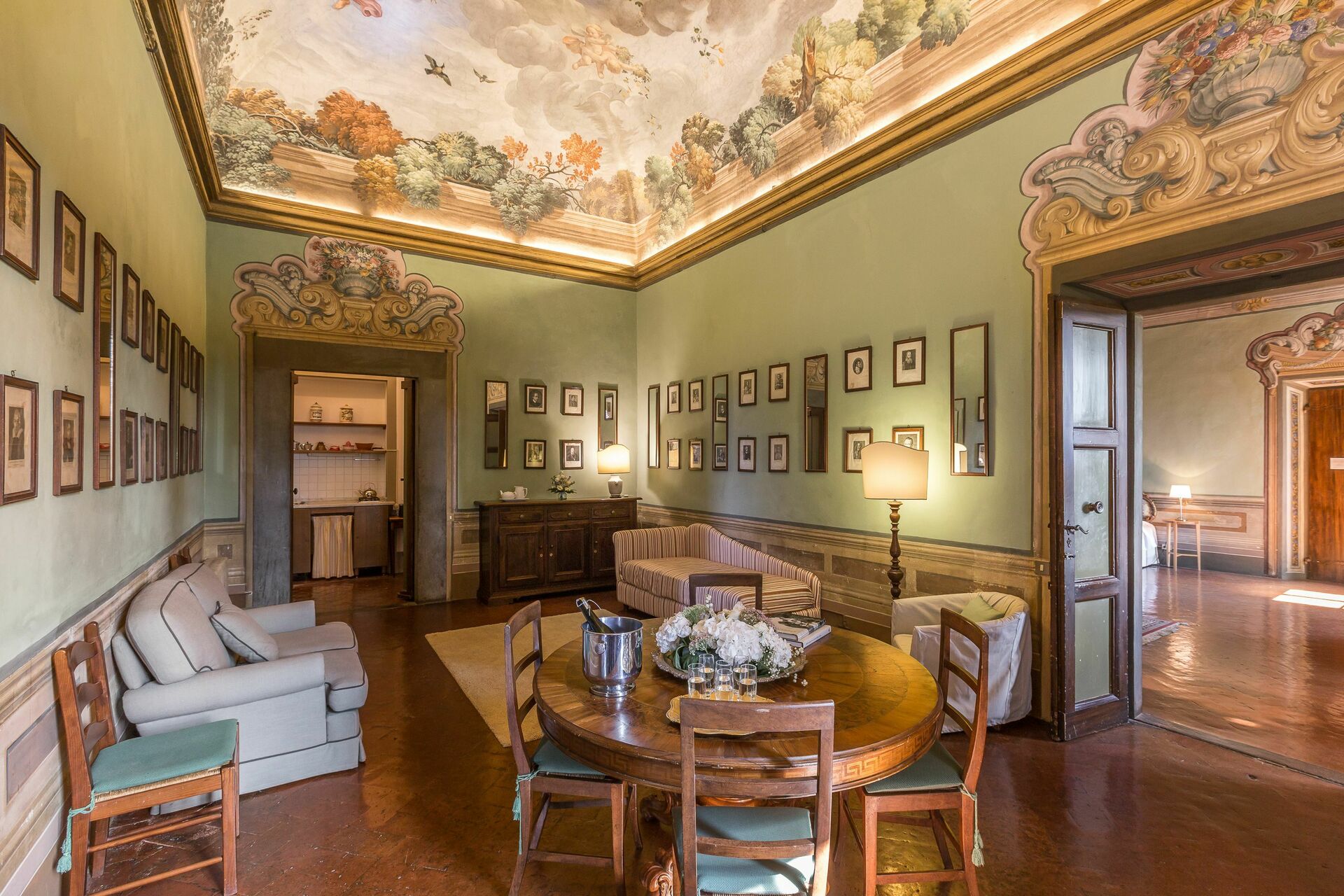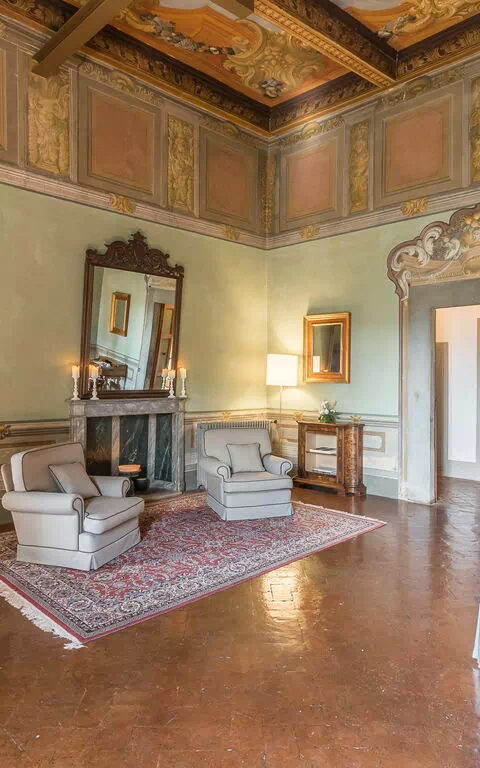 Toutes les pièces sont finement décorées de fresques du XVIIème siècle et les fenêtres ouvrent sur le jardin et sur la campagne environnante.