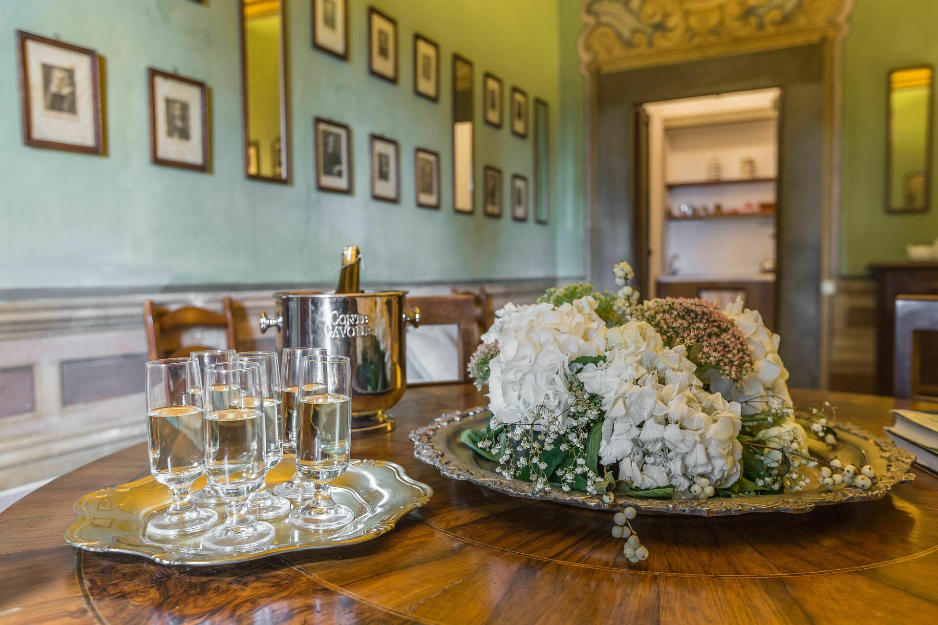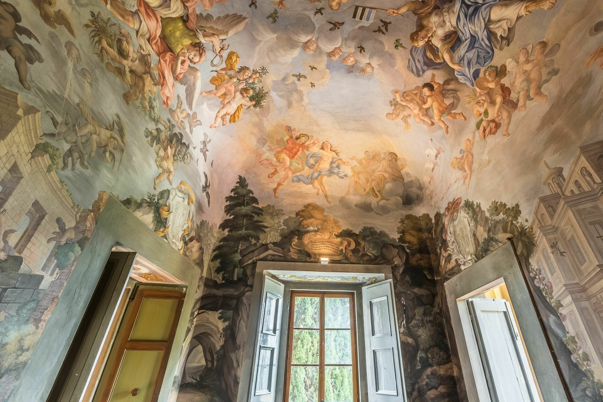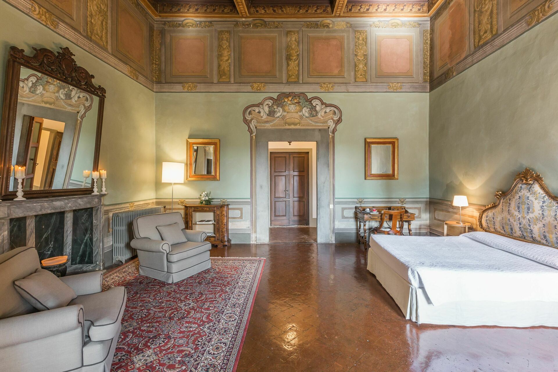 Toutes les pièces sont finement décorées de fresques du XVIIème siècle et les fenêtres ouvrent sur le jardin et sur la campagne environnante.