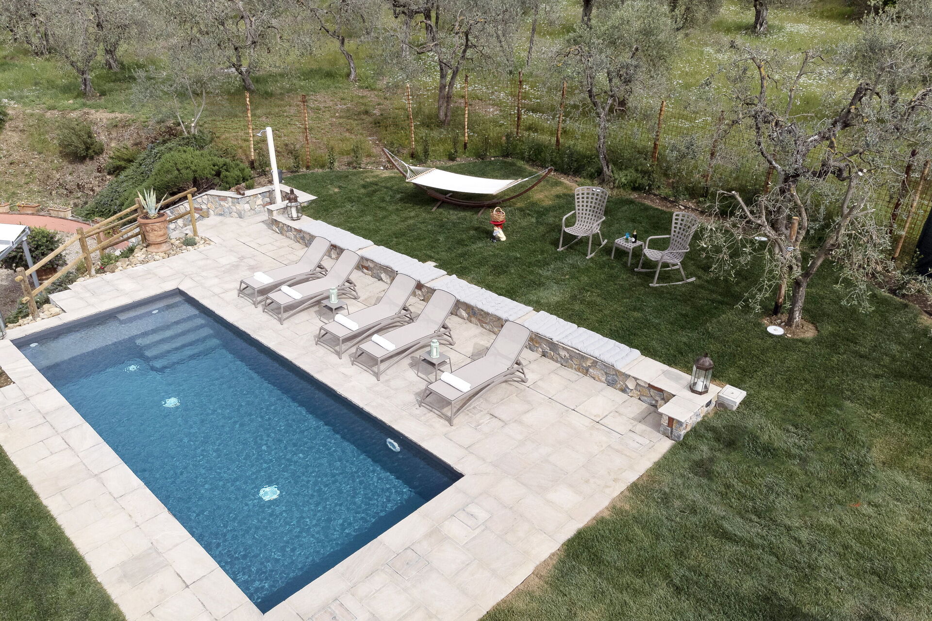 Cette magnifique villa offre une charmante piscine avec zone d’hydromassage à usage exclusif des hôtes, qui pourront passer des heures à se détendre entre amis ou en famille dans un coin pittoresque de la Toscane. Un grand jardin est également à disposition des hôtes pour passer des journées entières en plein air; une véranda lumineuse mettra en valeur les plats de vos banquets d'été, tout en profitant d'une vue suggestive et de la tranquillité de la campagne toscane.