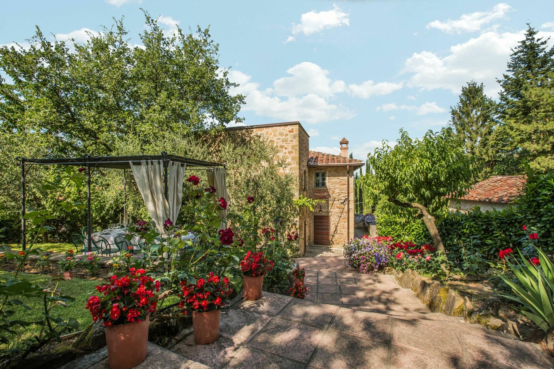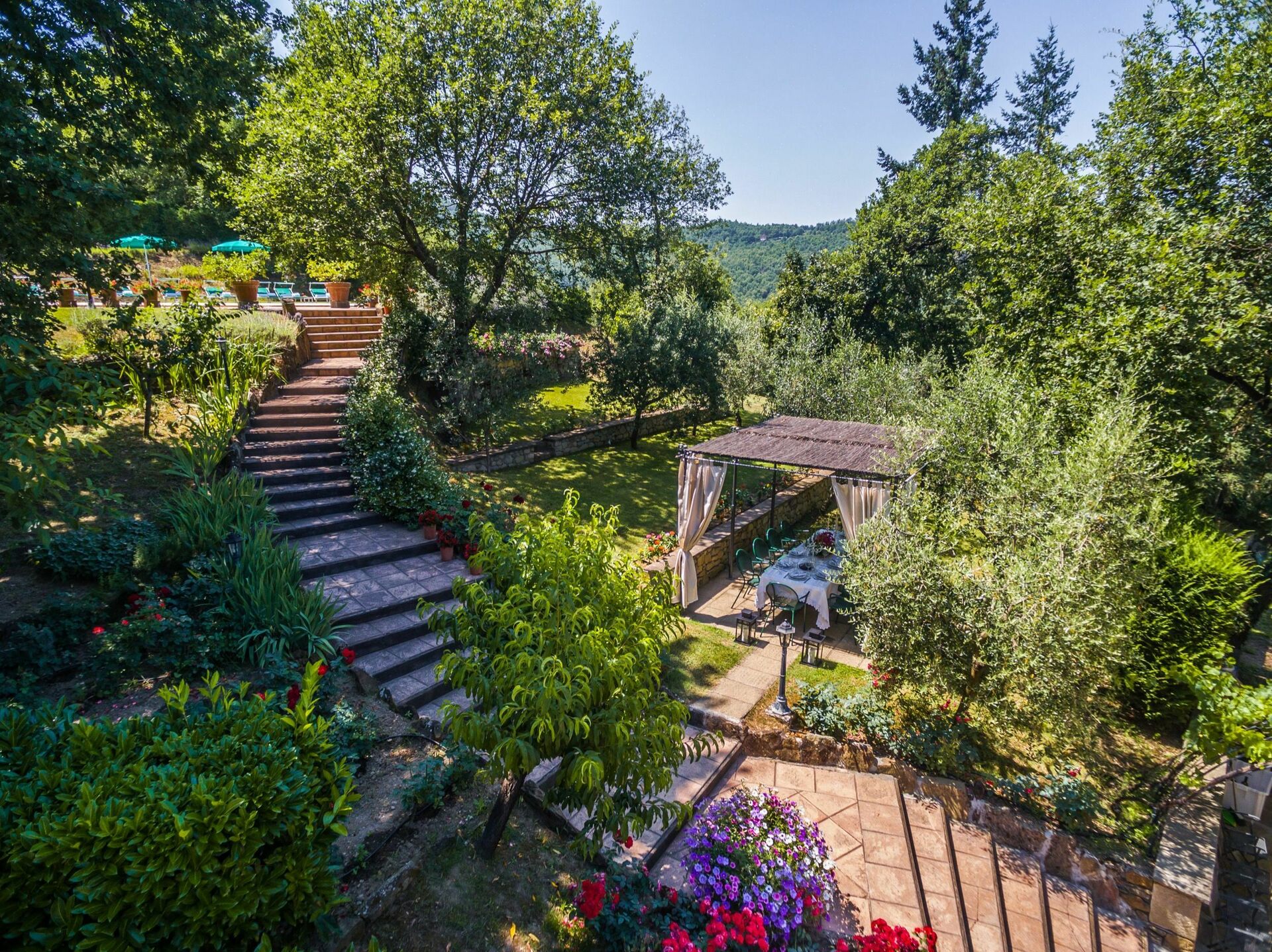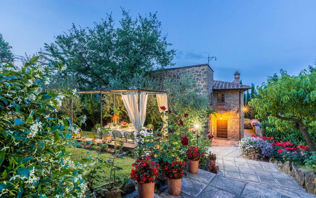 Grand jardin (env. 1000m2) bien entretenu et riche en plantes, fleurs et magnifiques roses avec piscine privée en position panoramique. Sur demande il est possible d’installer une vasque avec hydromassage (Jacuzzi) à proximité de la piscine (€350,00/semaine - à confirmer au moment de la réservation et à payer sur place). Agréable pavillon idéal pour les repas à proximité de la piscine, d’où l’on jouit d’une belle vue sur le caractéristique petit village médiéval de Monterchi, barbecue.