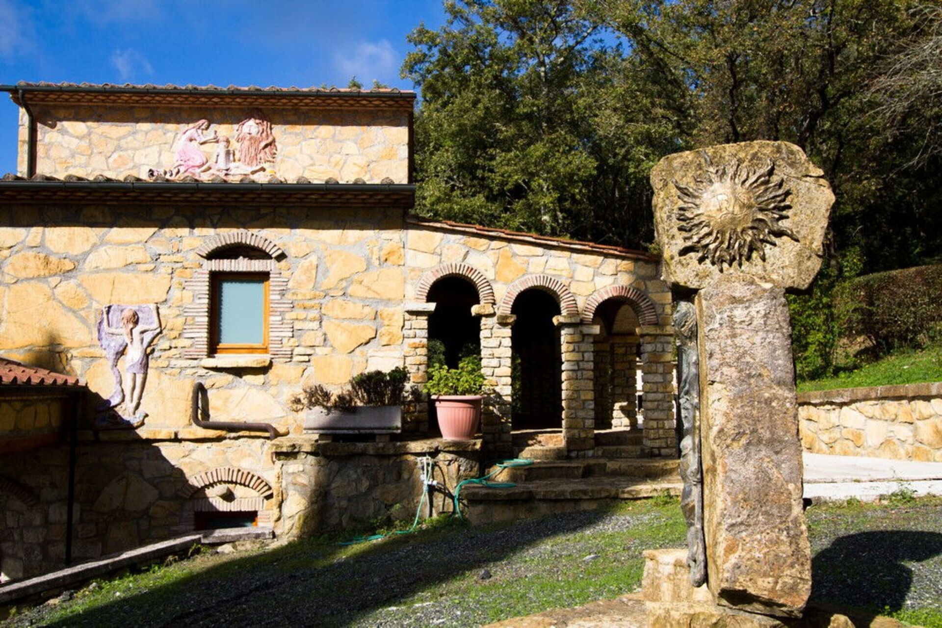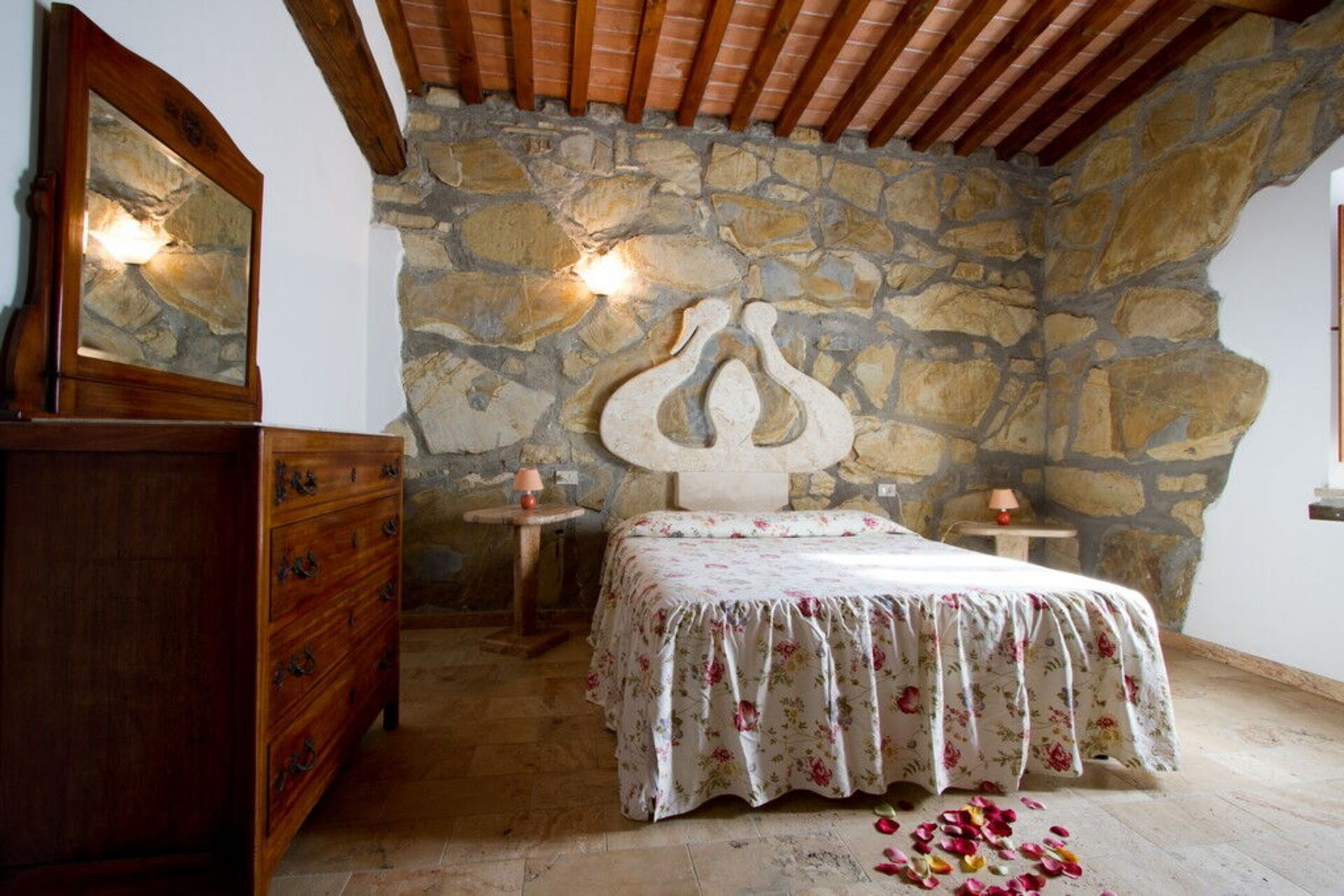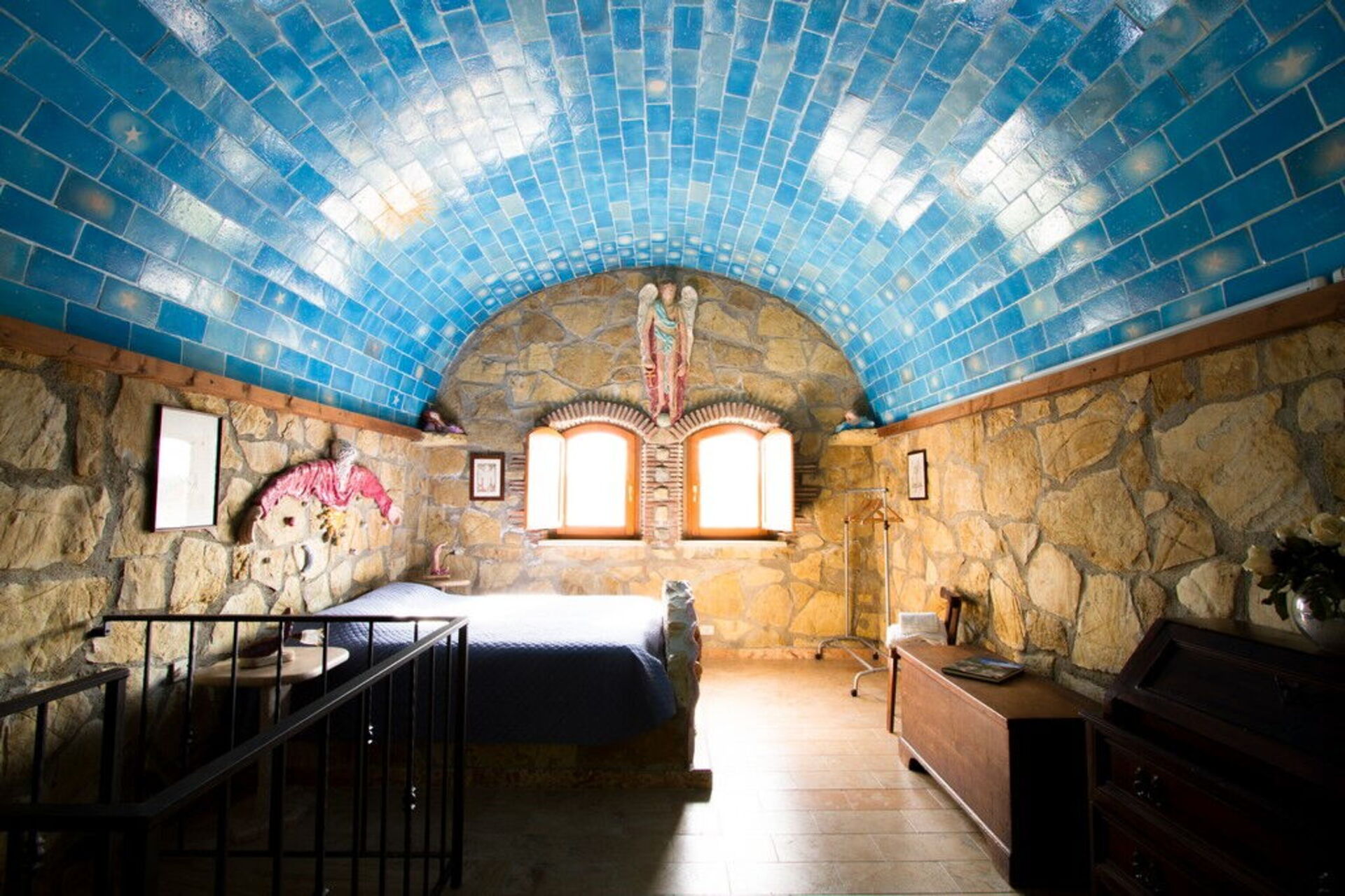Premier étage dans la petite tour (accessible par un escalier en colimaçon en travertin): chambre avec lit double en maçonnerie et plafond voûté décoré de céramiques réalisées par l’artiste.
